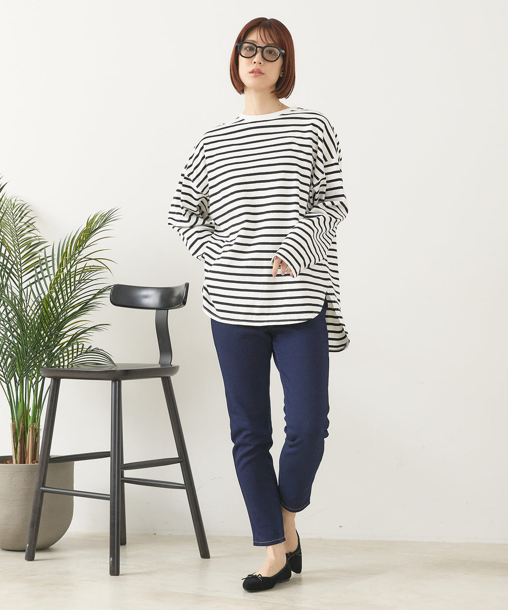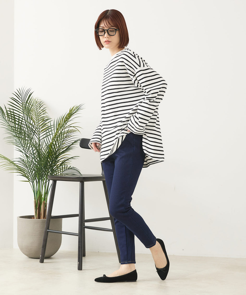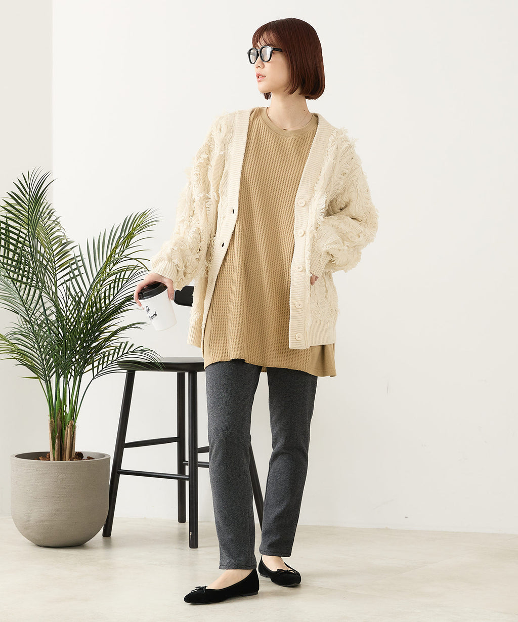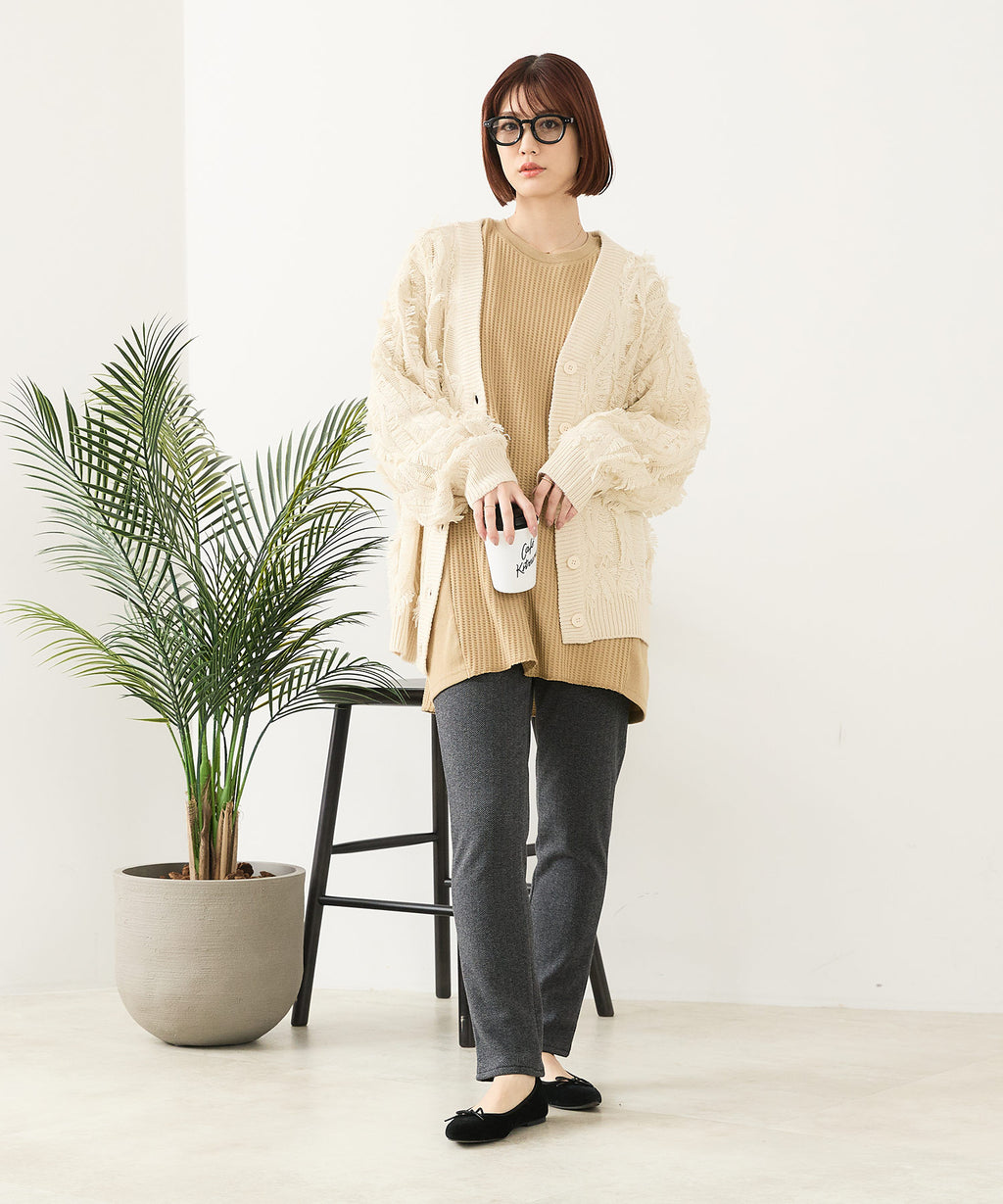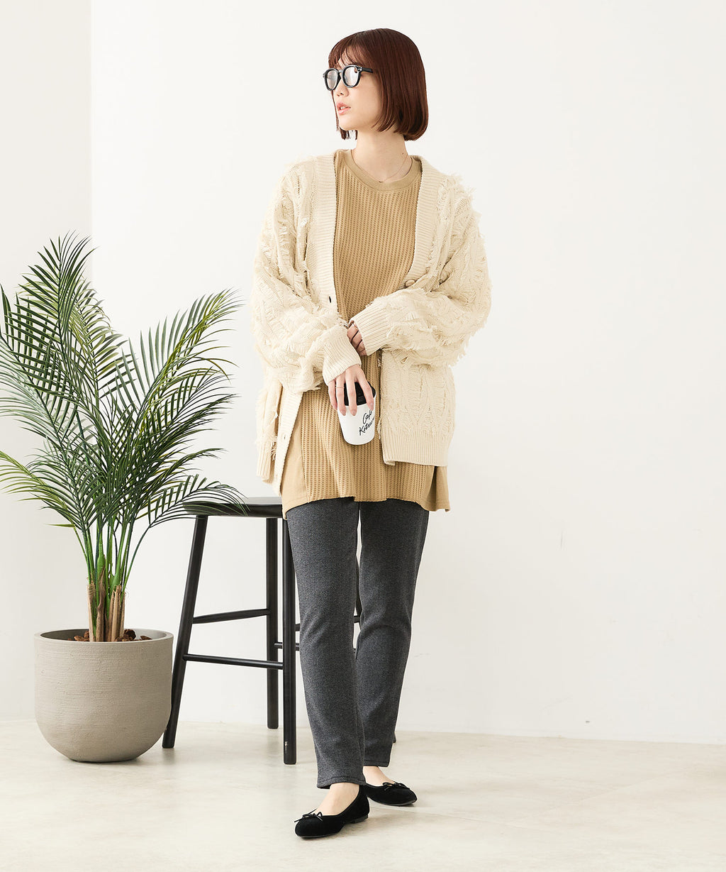 トップスにビッグシルエットのパーカー、シャツ、ニット、Tシャツを合わせるとゆったりスタイルに!