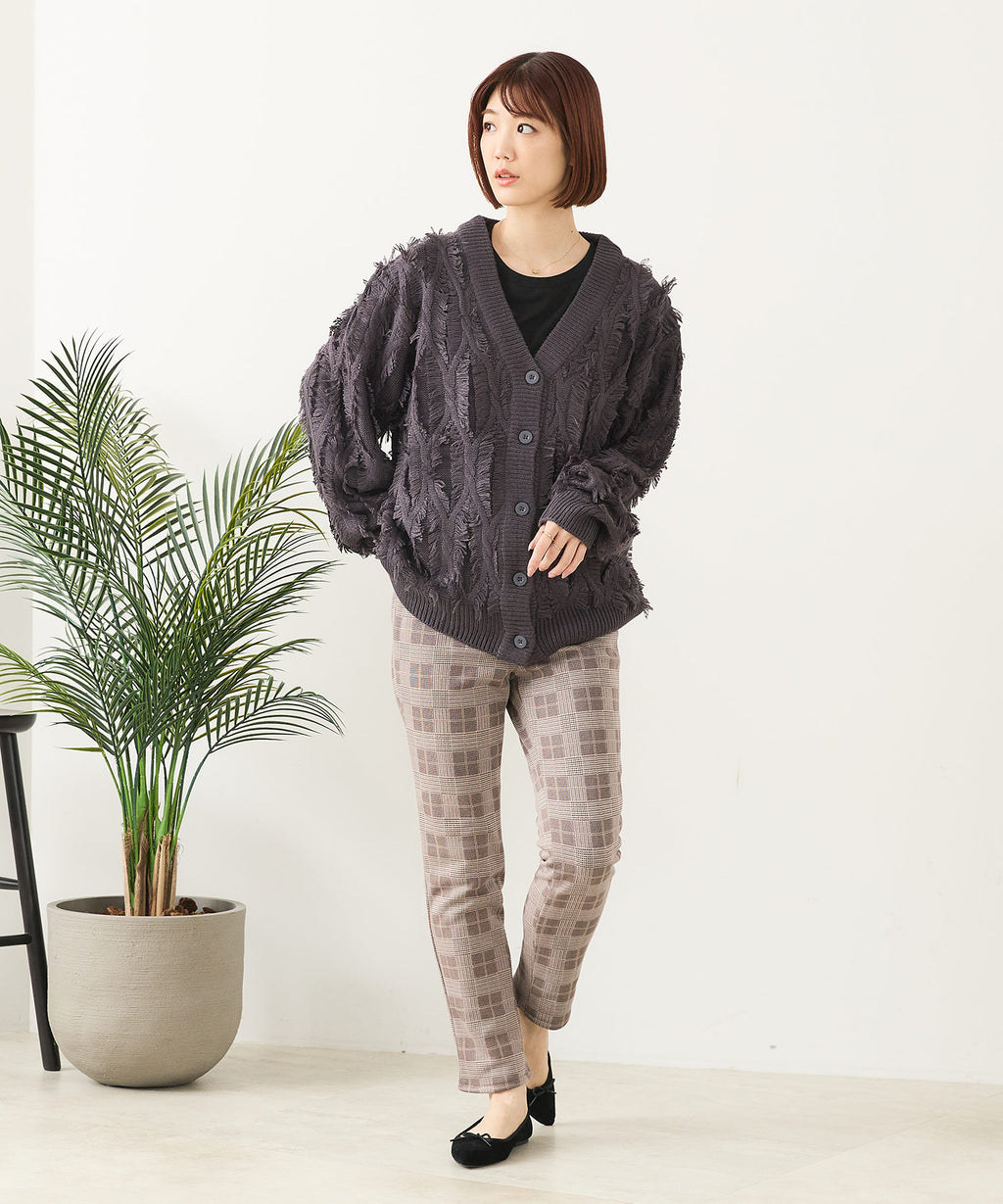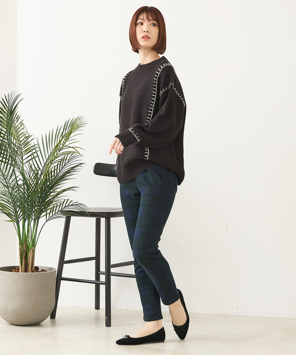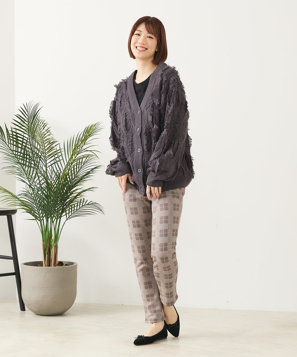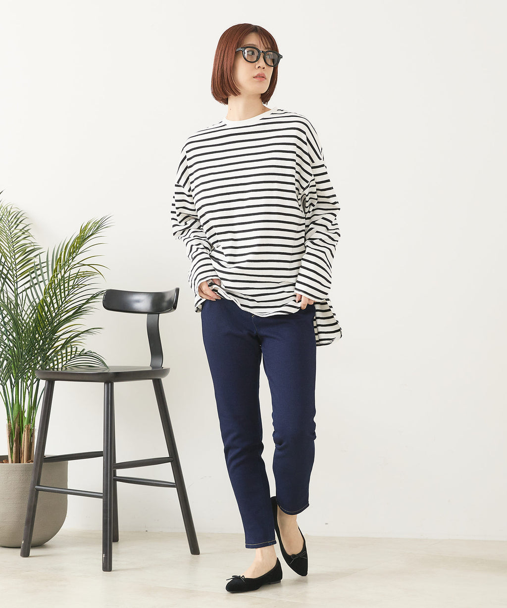 トップスにビッグシルエットのパーカー、シャツ、ニット、Tシャツを合わせるとゆったりスタイルに!