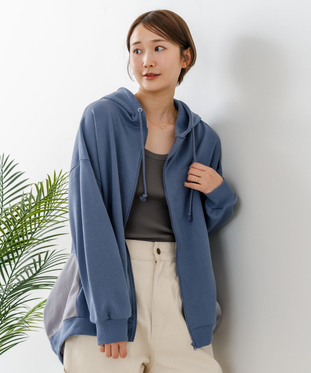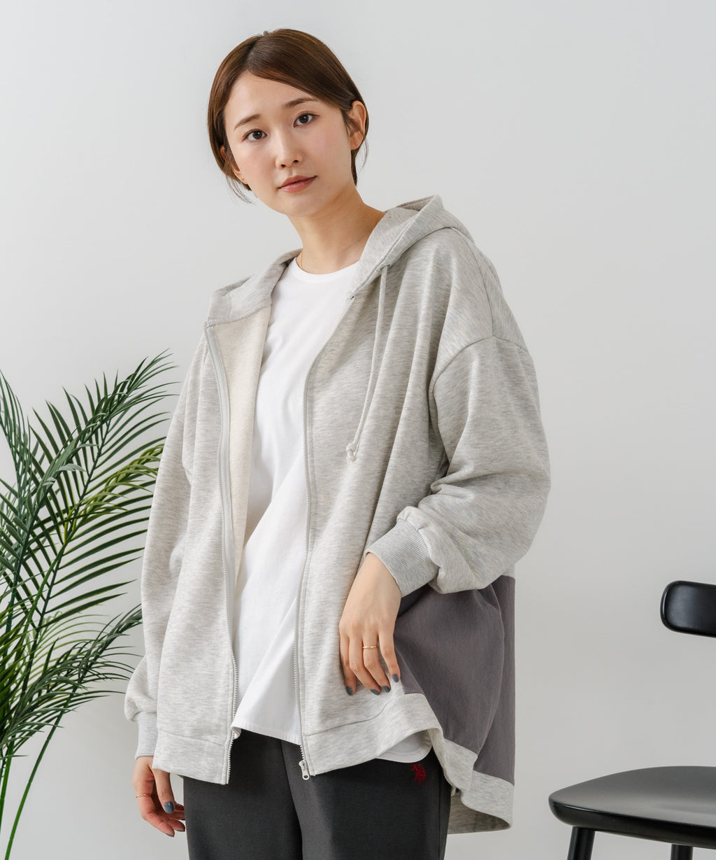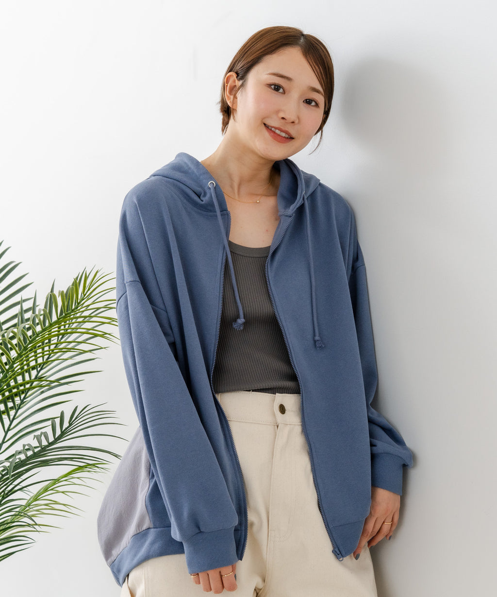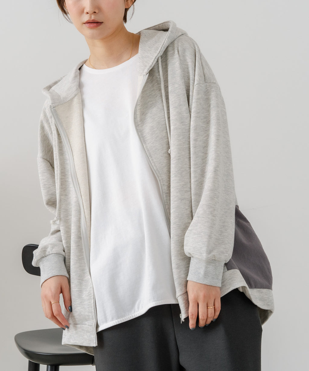 コクーンシルエットが特徴のフルジップパーカー。