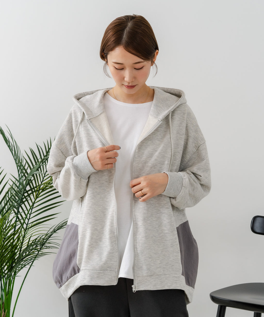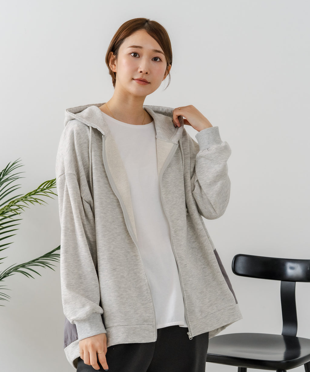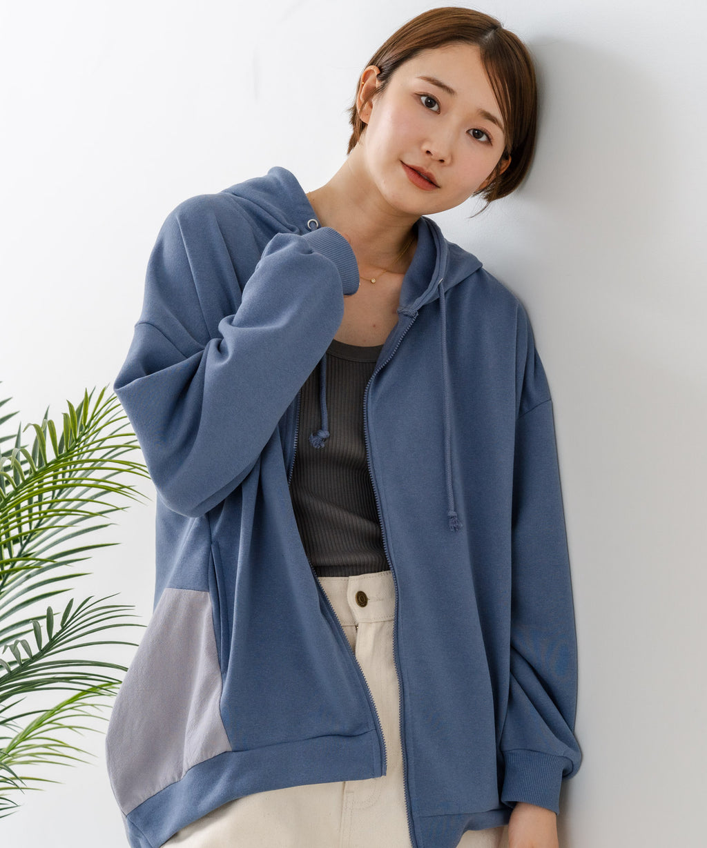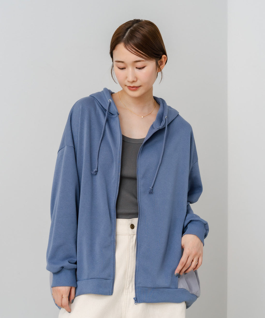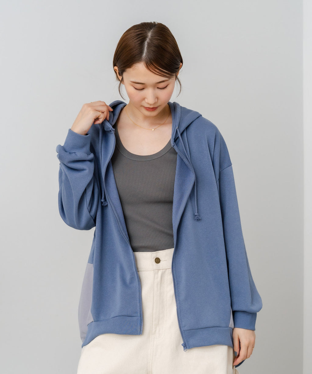 コクーンシルエットが特徴のフルジップパーカー。