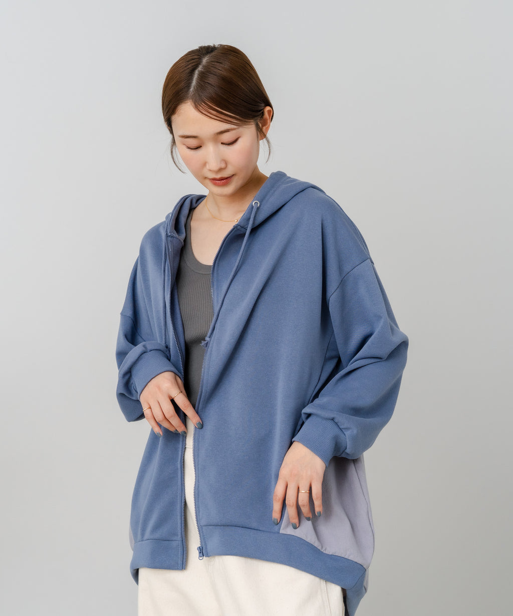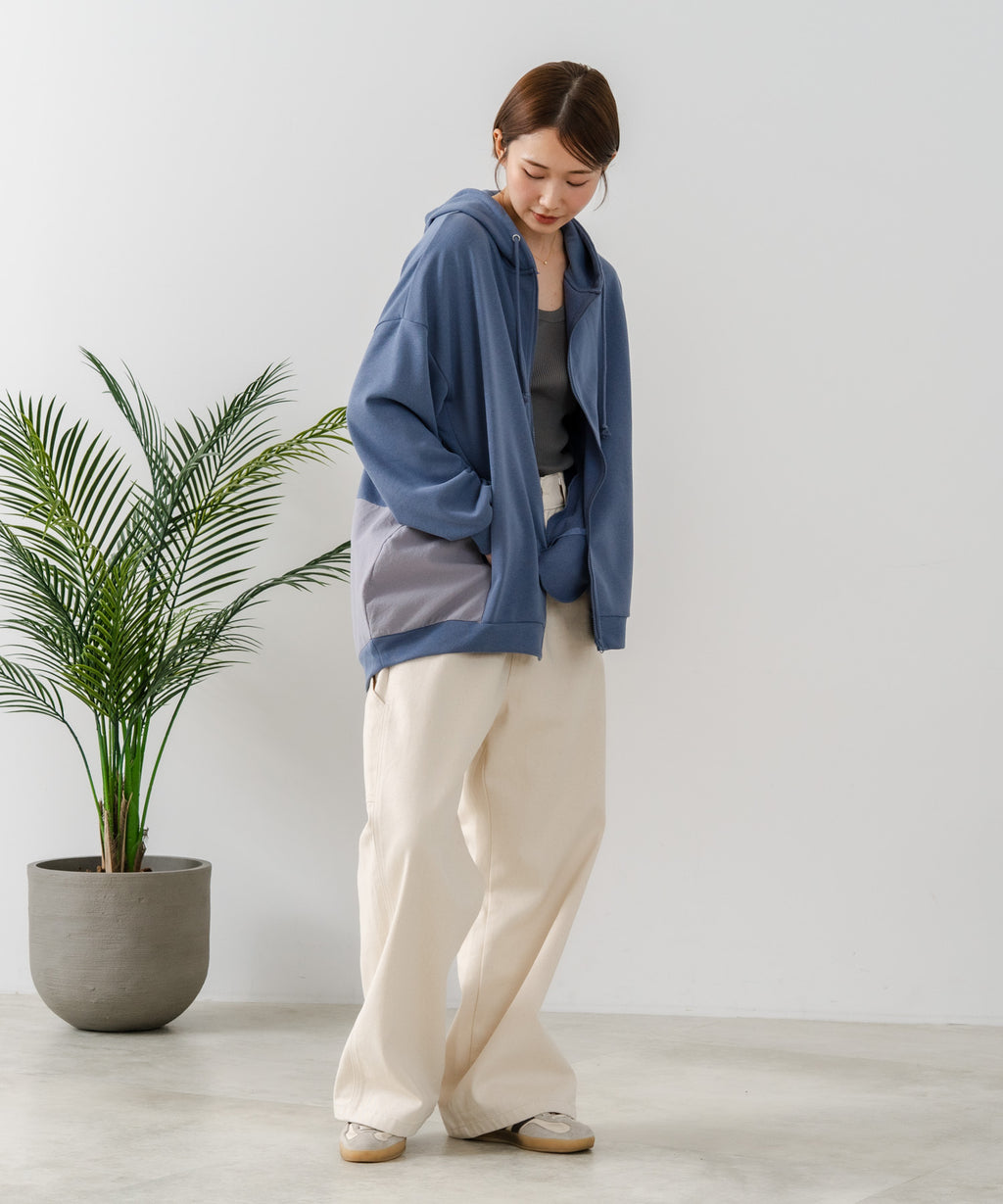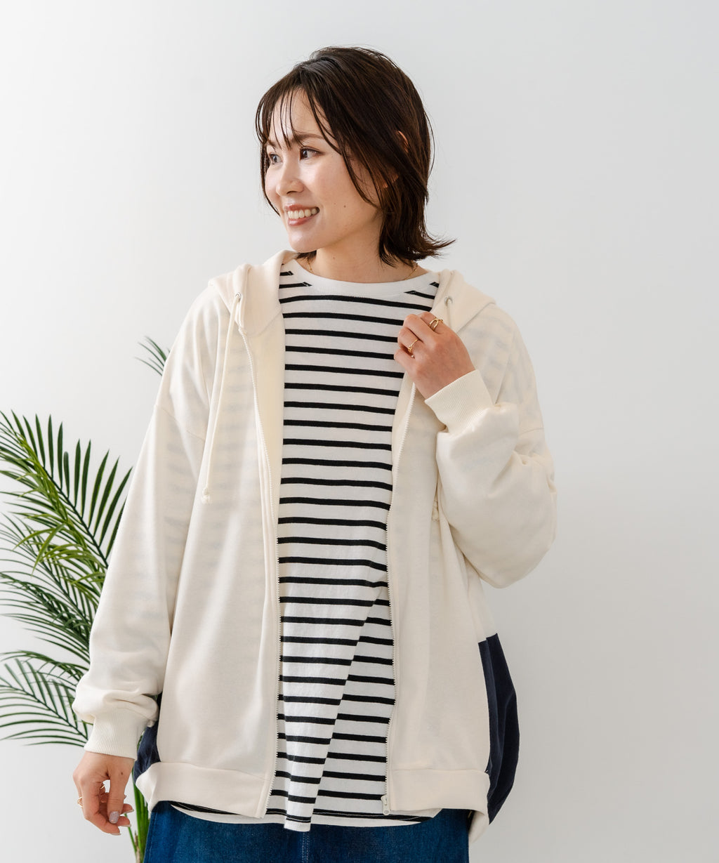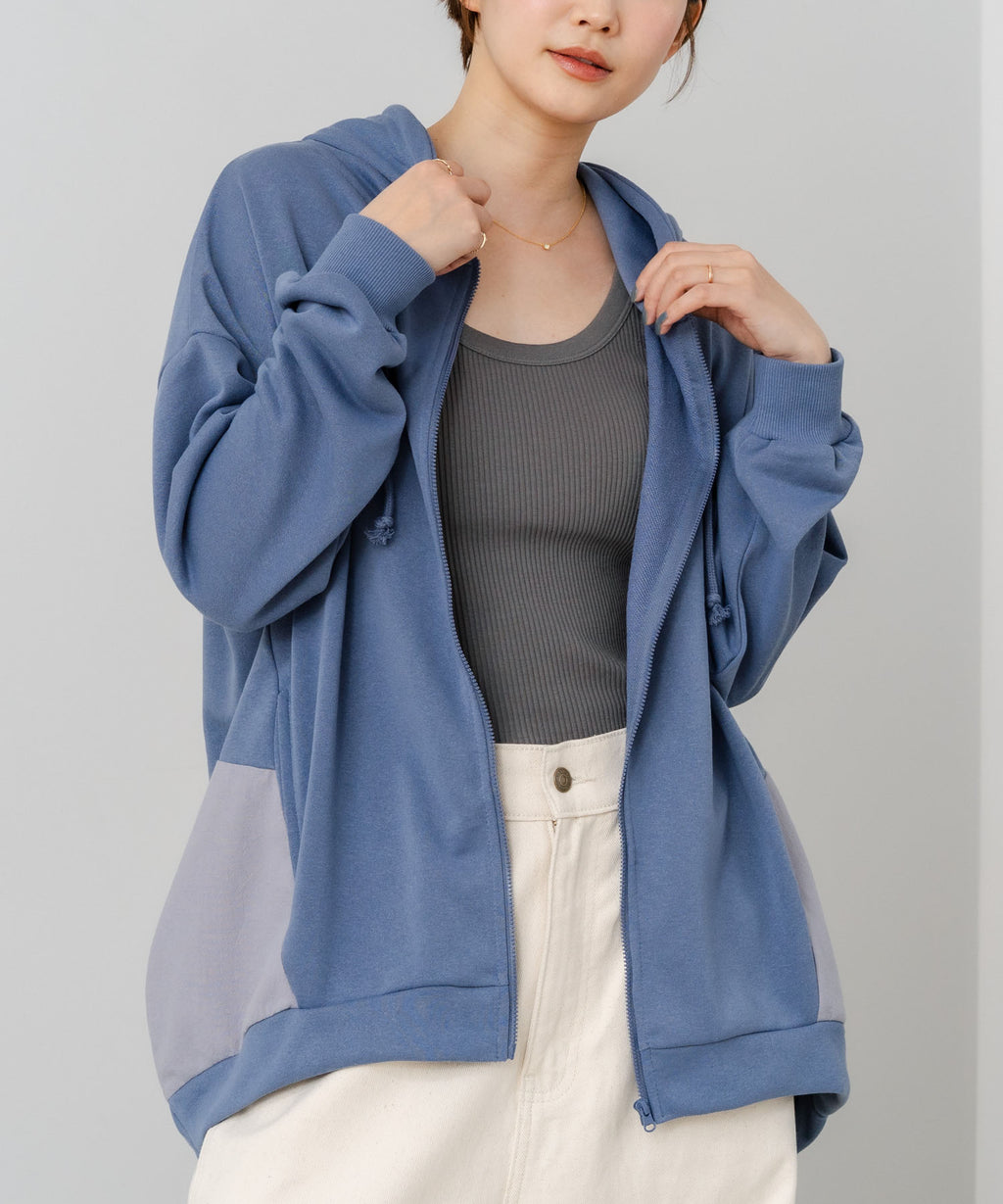 コクーンシルエットが特徴のフルジップパーカー。