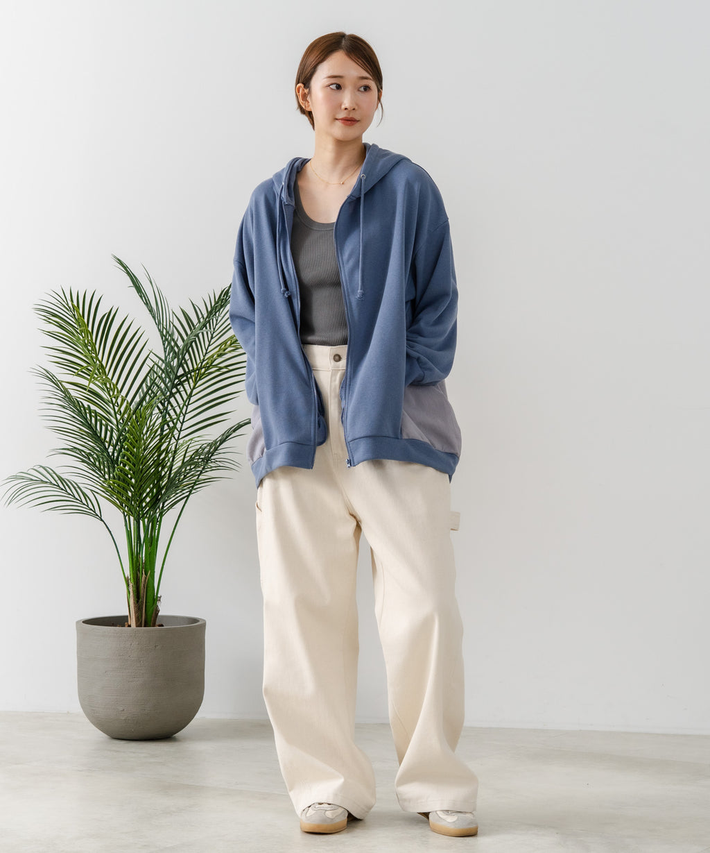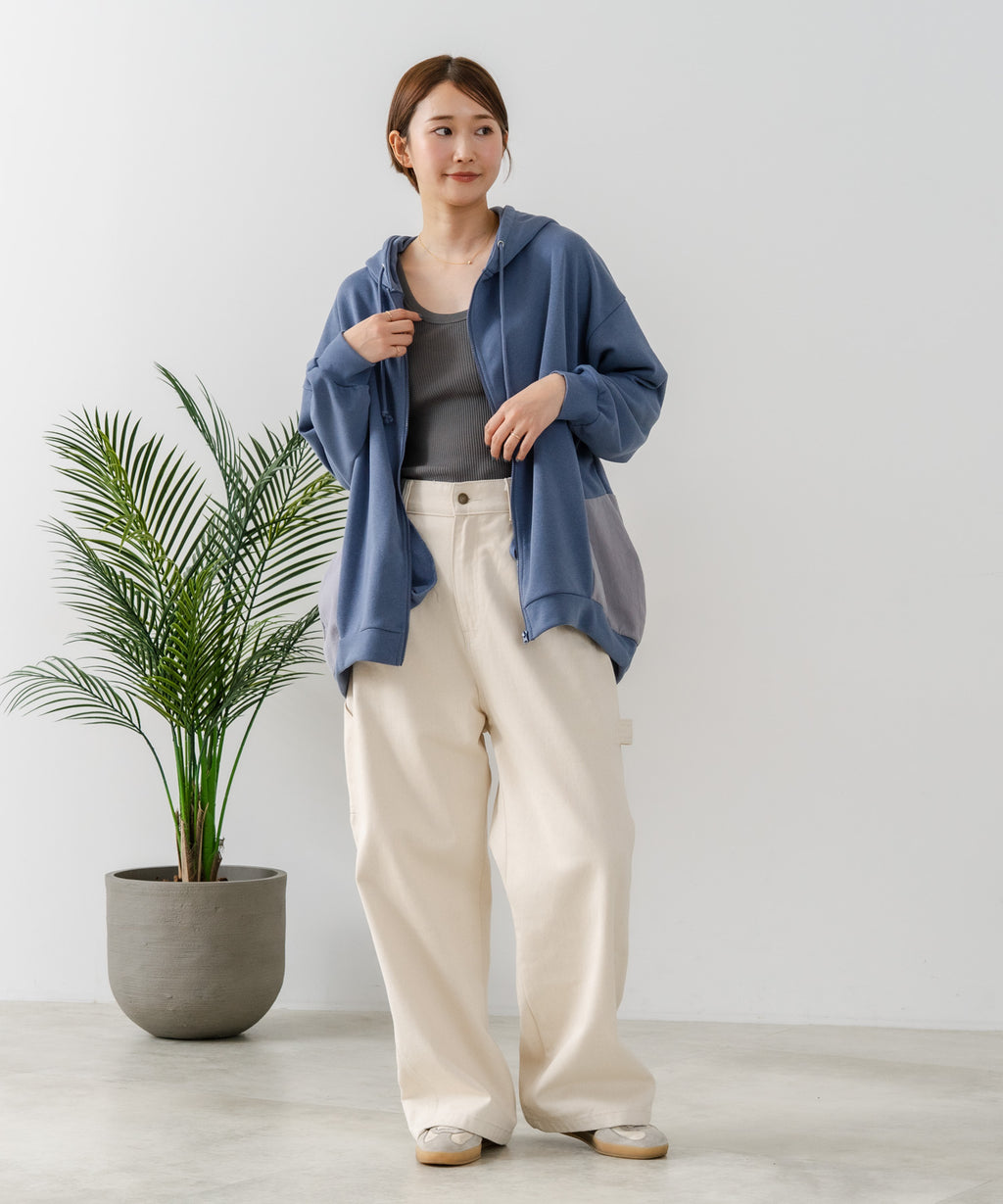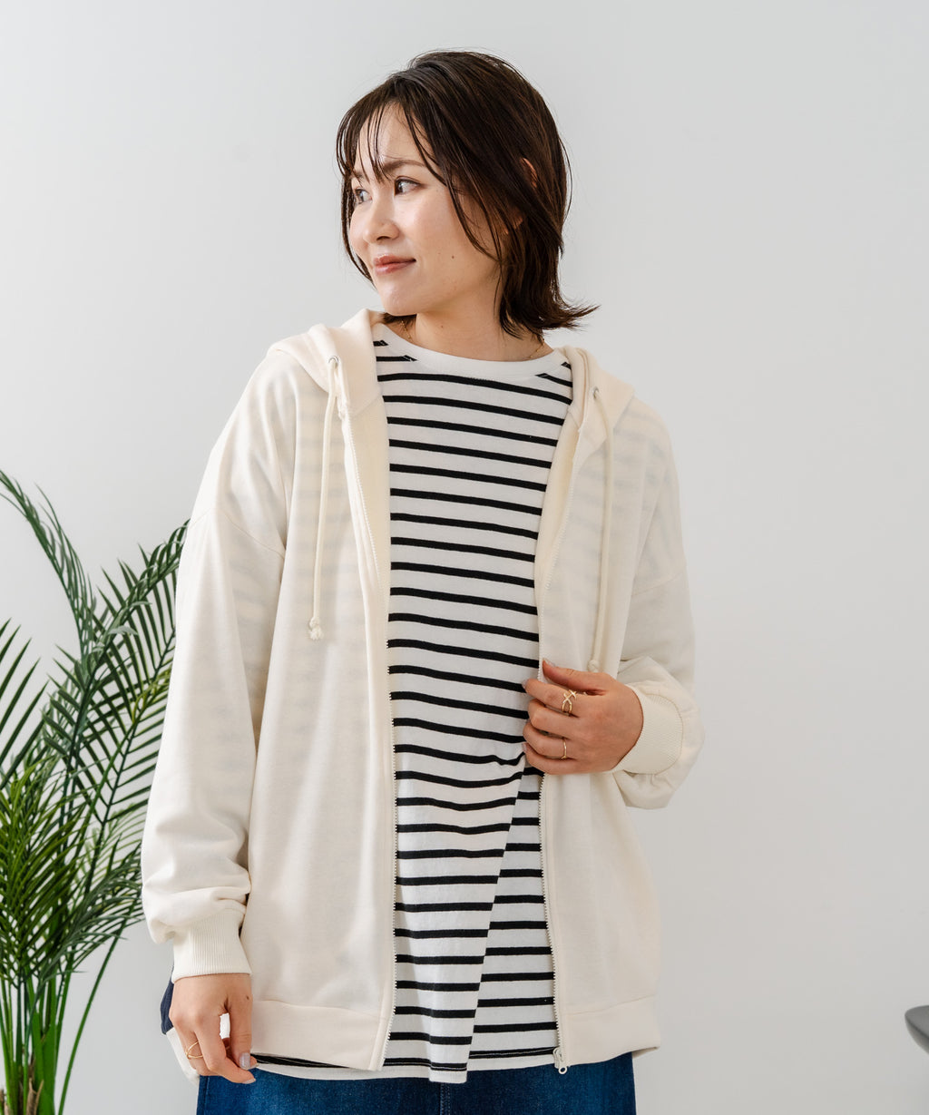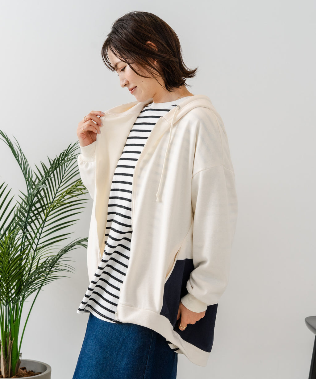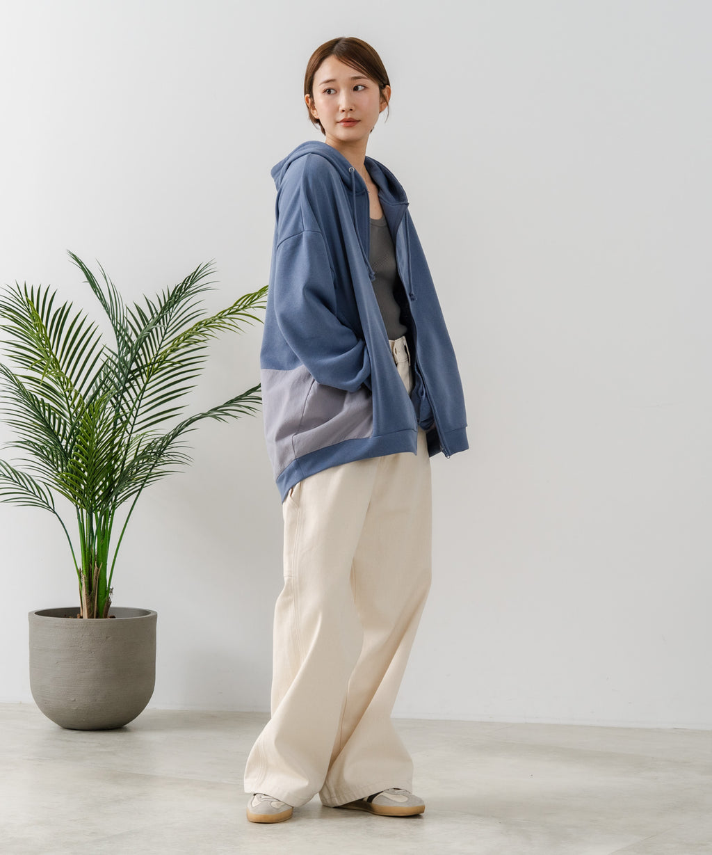 コクーンシルエットが特徴のフルジップパーカー。