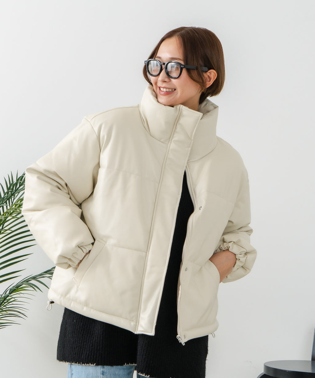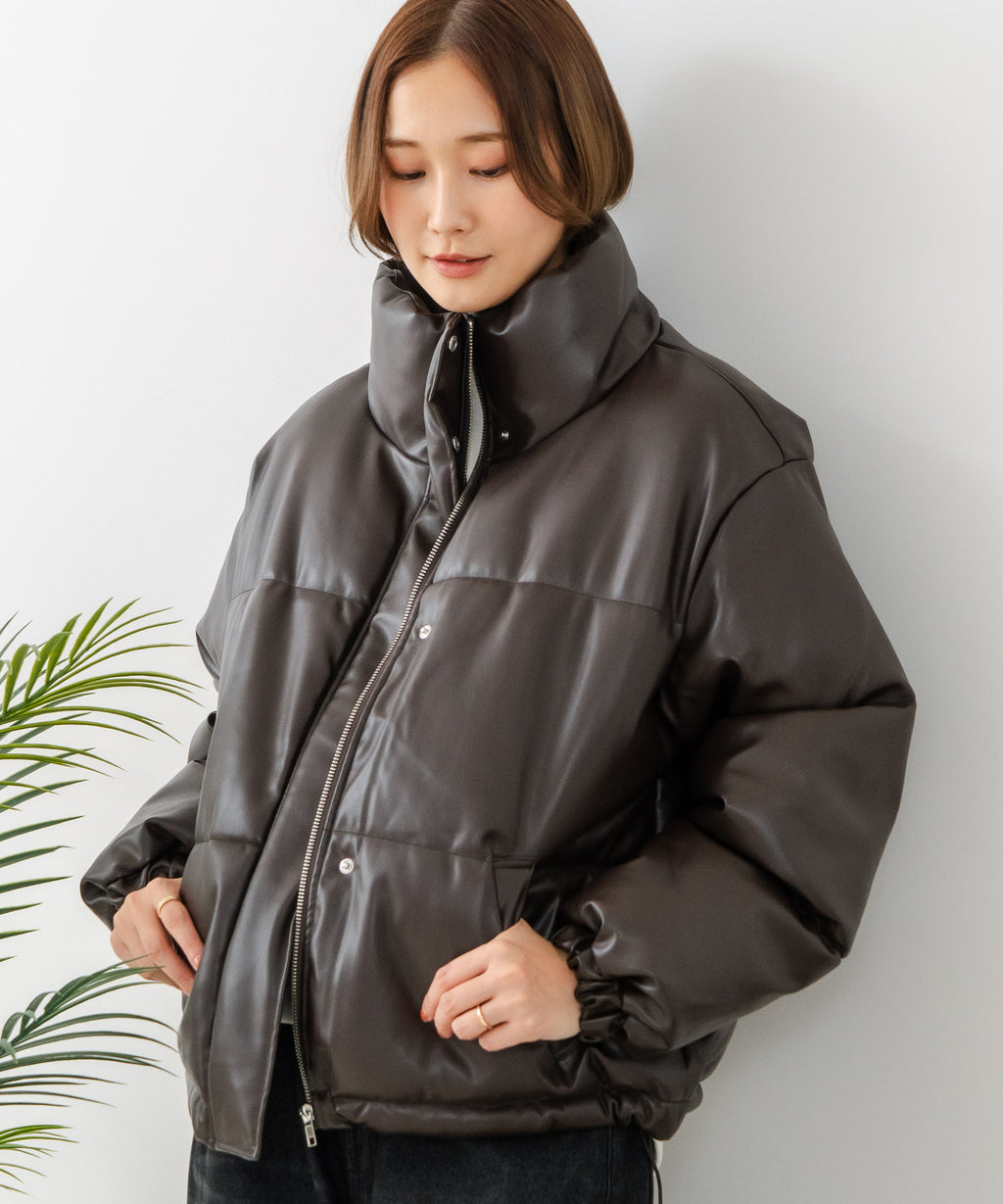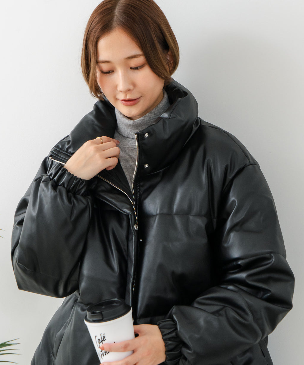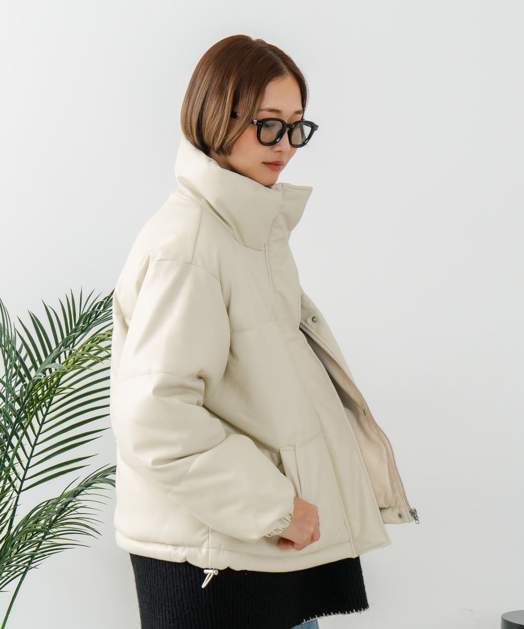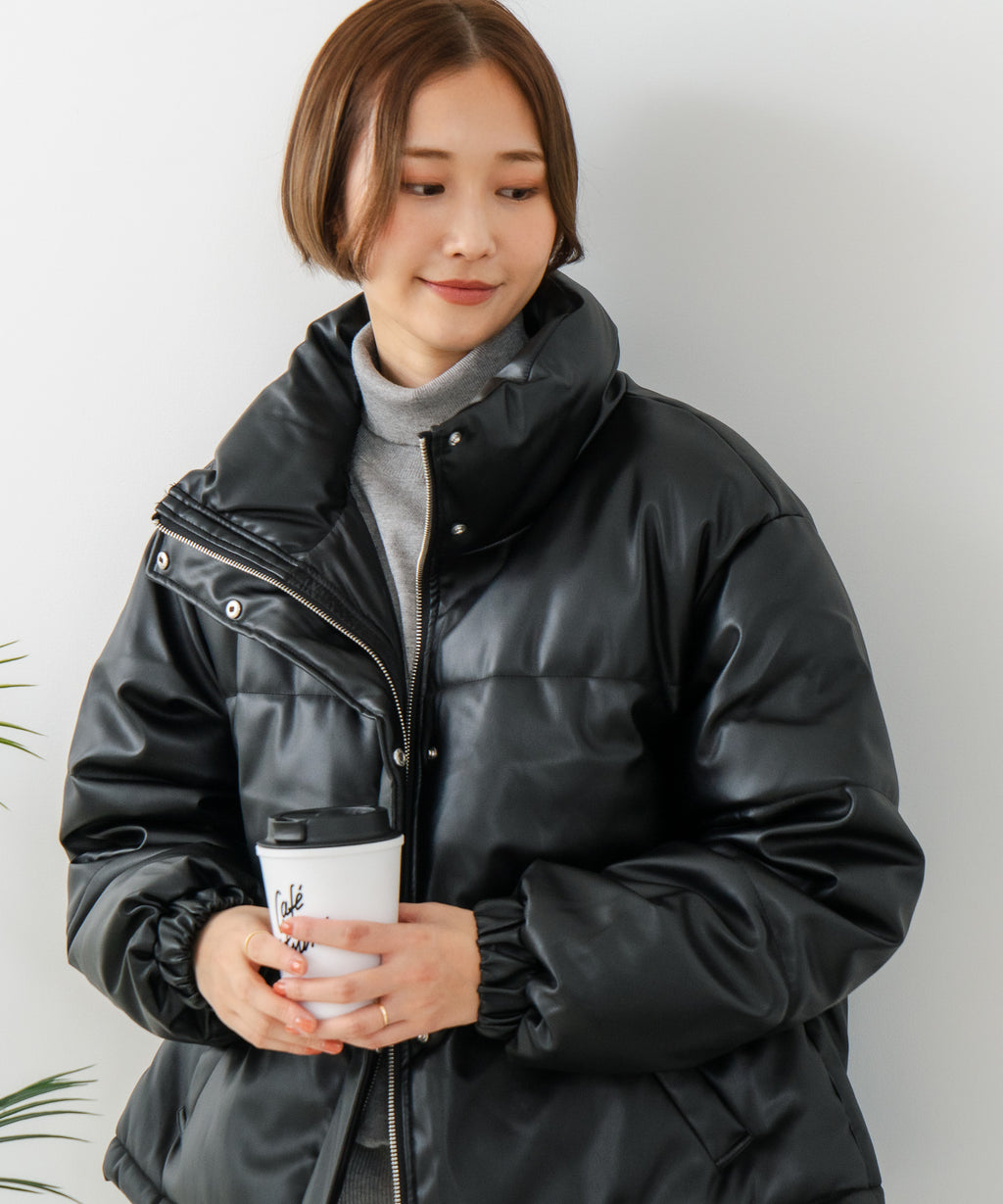 ボリューミーなシルエットの表地が合皮の中綿ブルゾン。