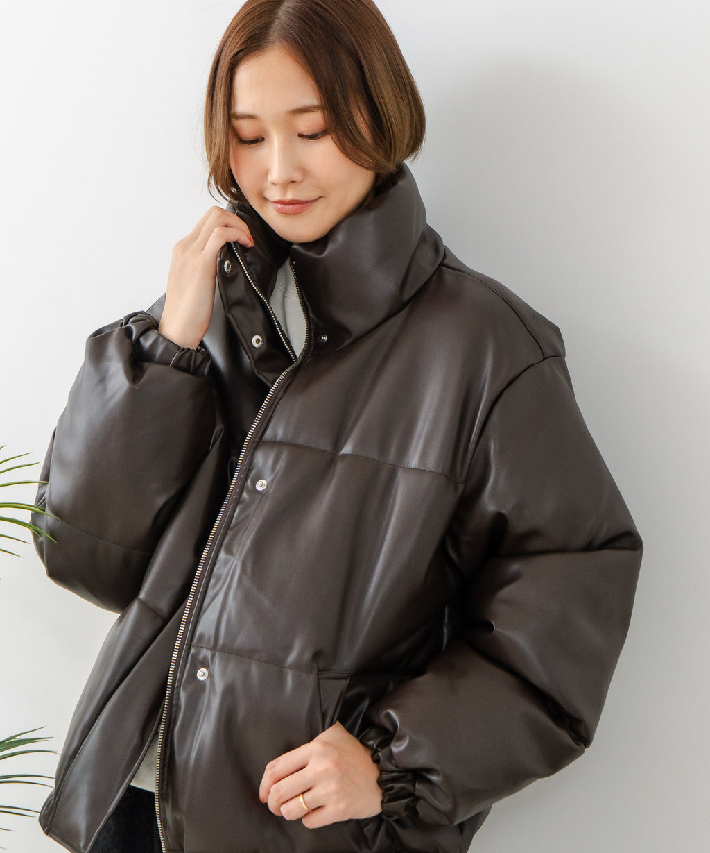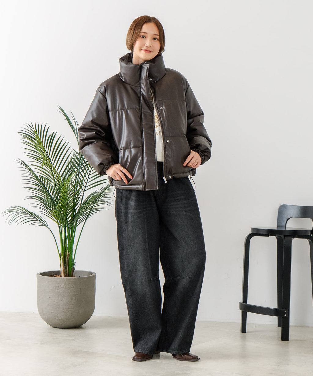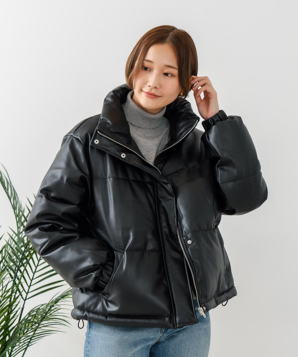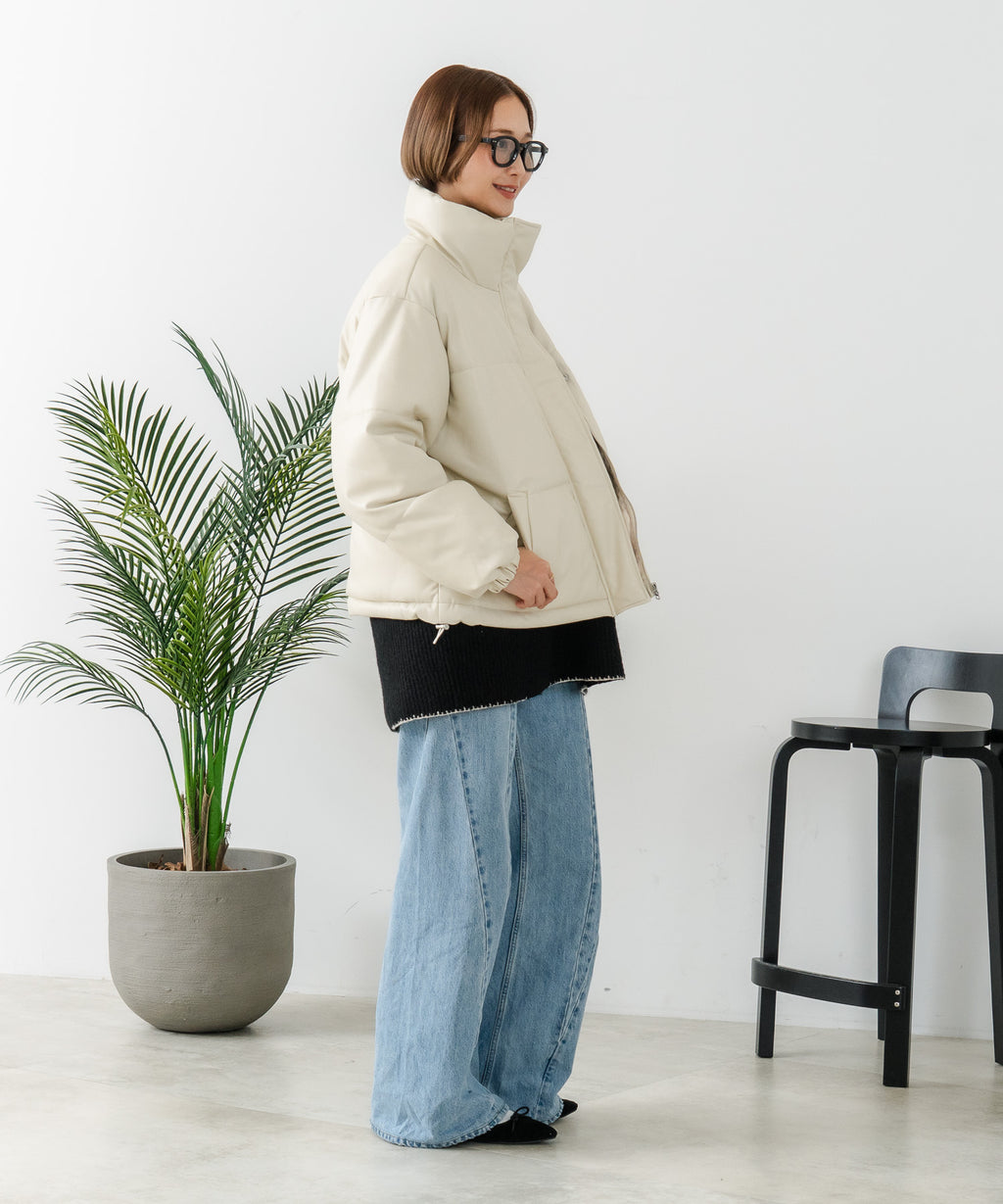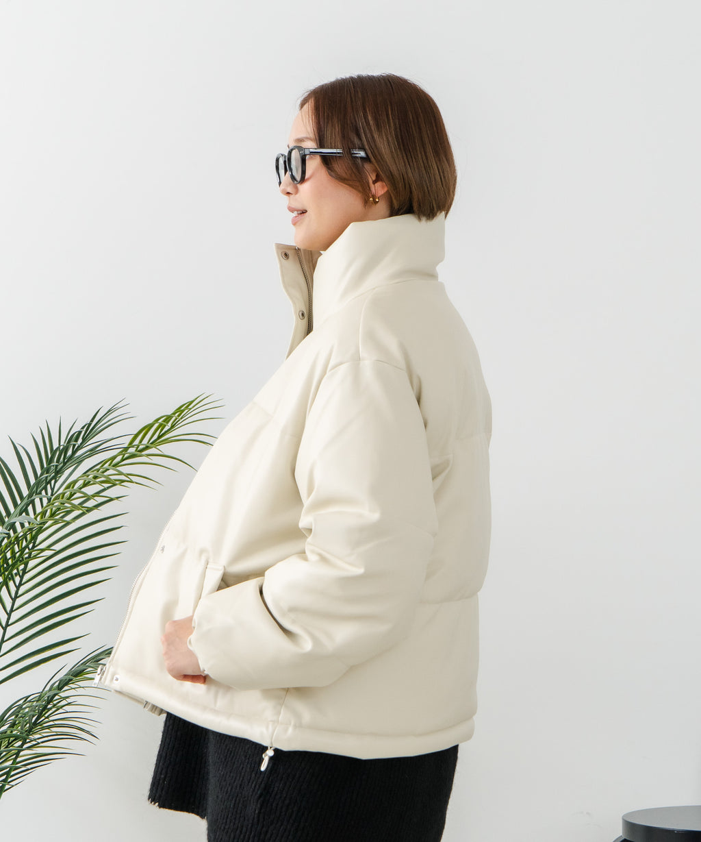 ボリューミーなシルエットの表地が合皮の中綿ブルゾン。