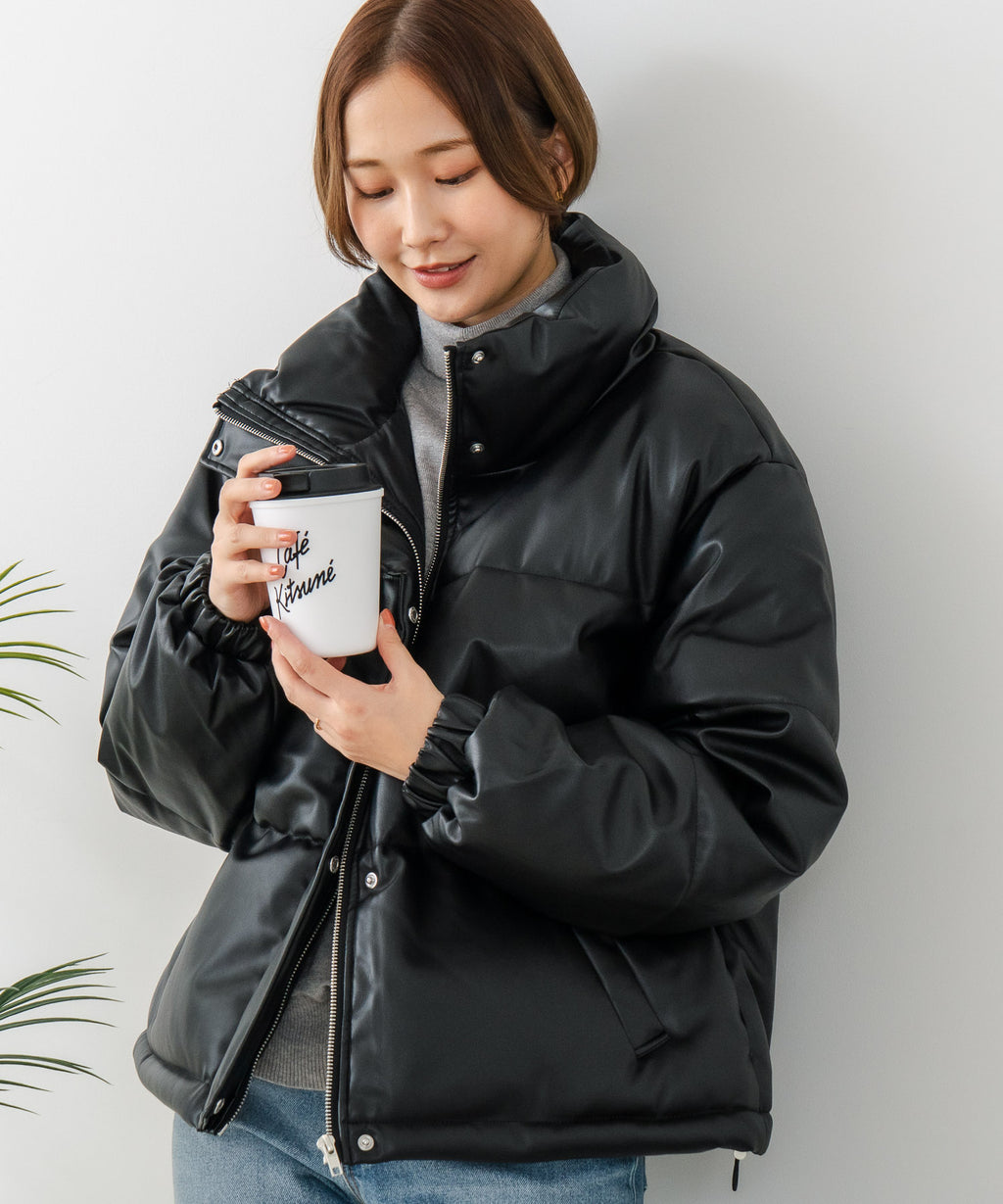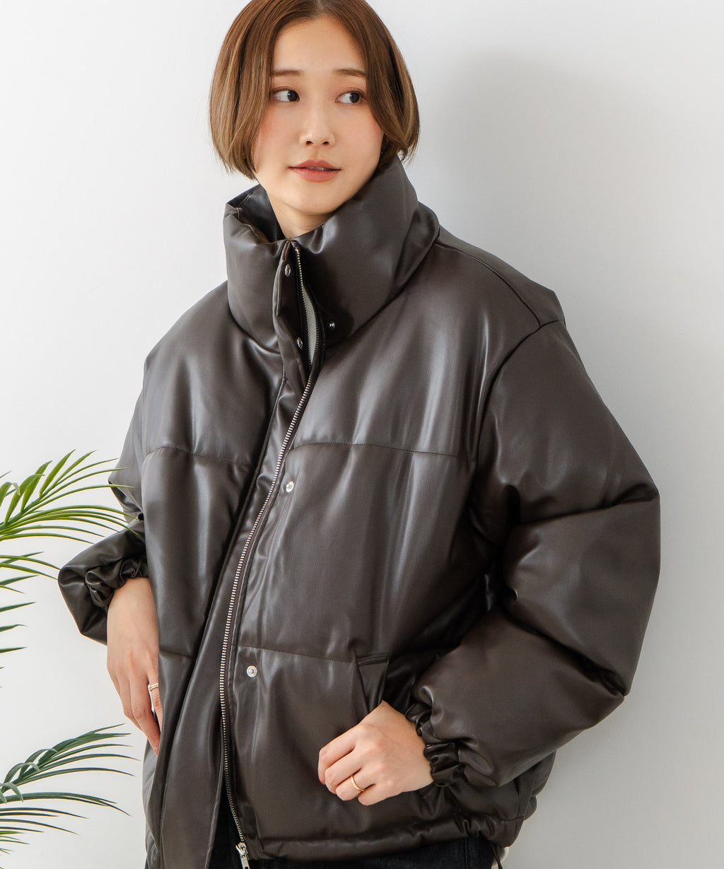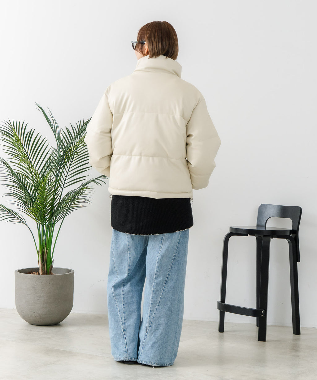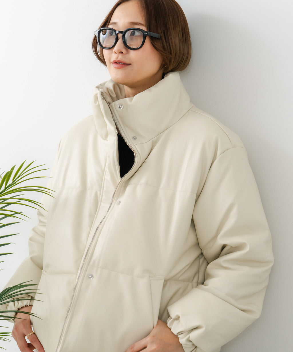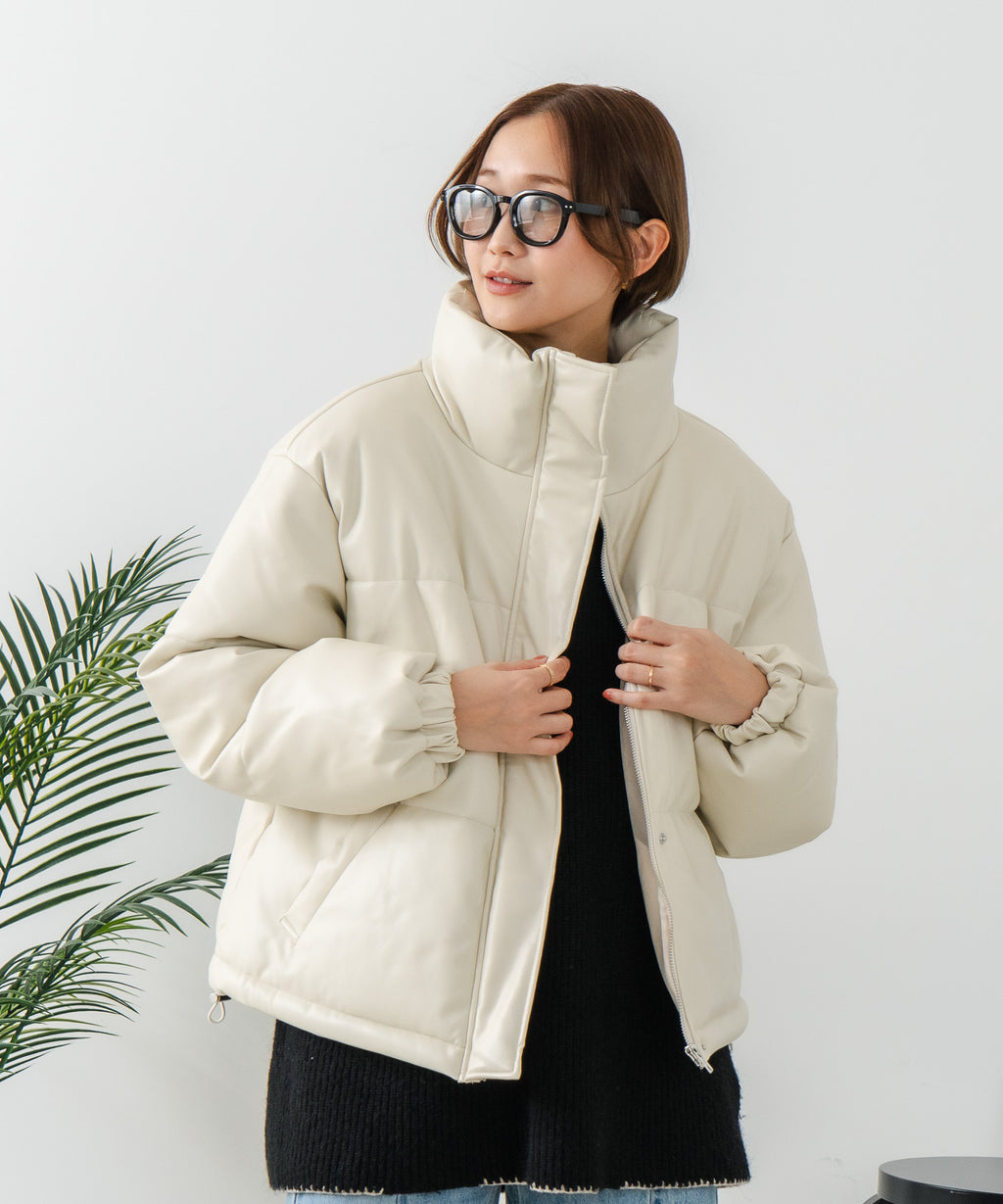 ボリューミーなシルエットの表地が合皮の中綿ブルゾン。