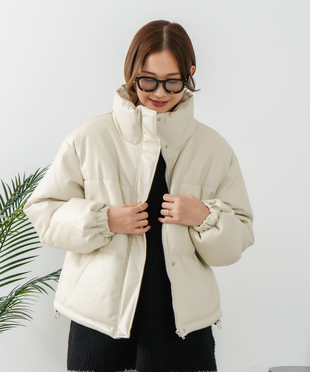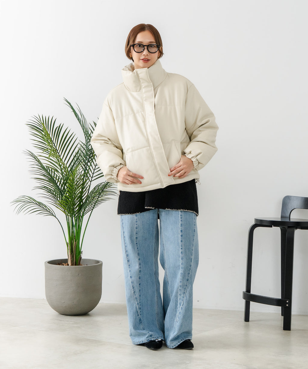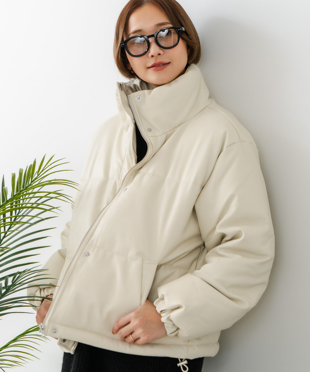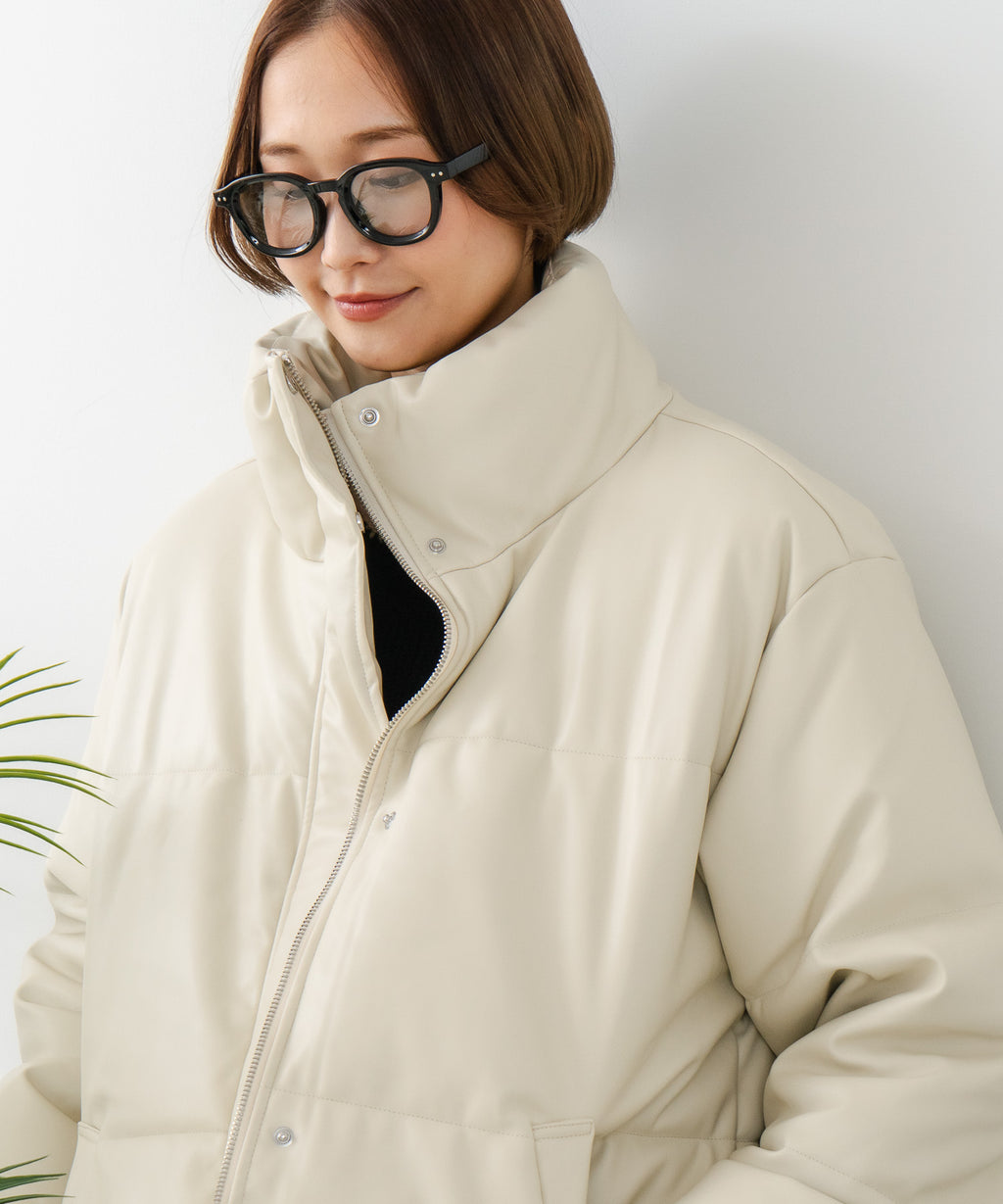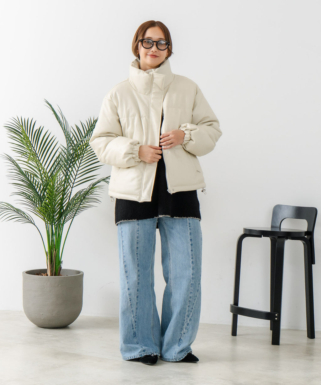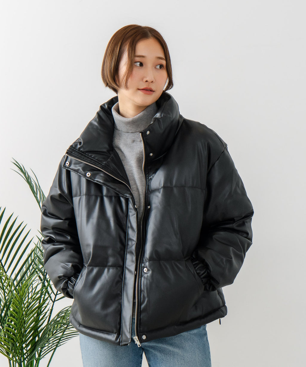 ボリューミーなシルエットの表地が合皮の中綿ブルゾン。
