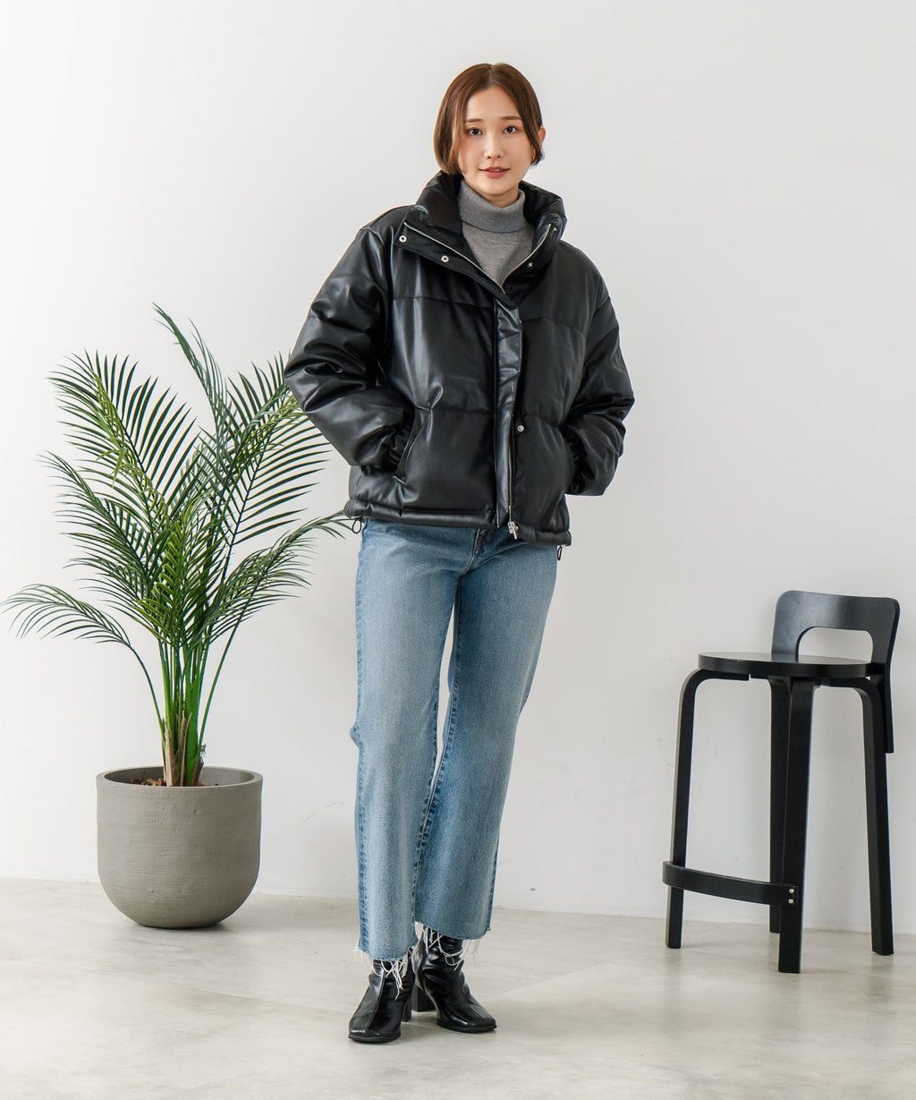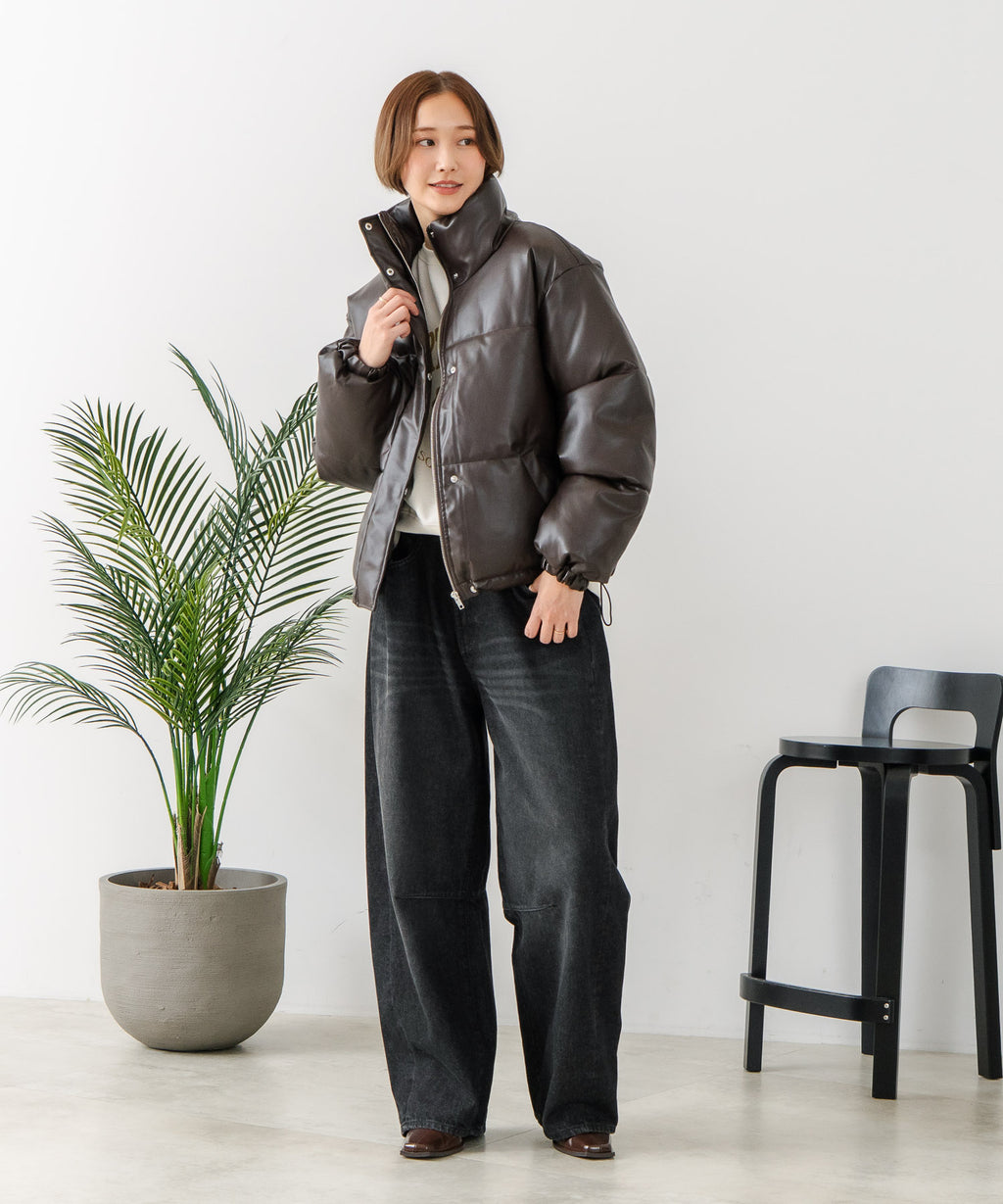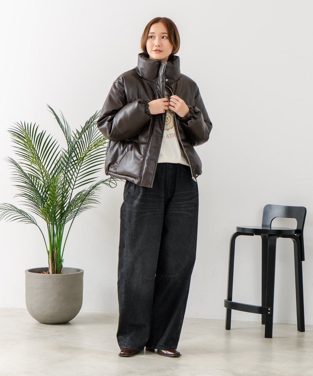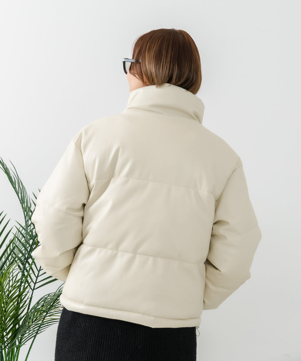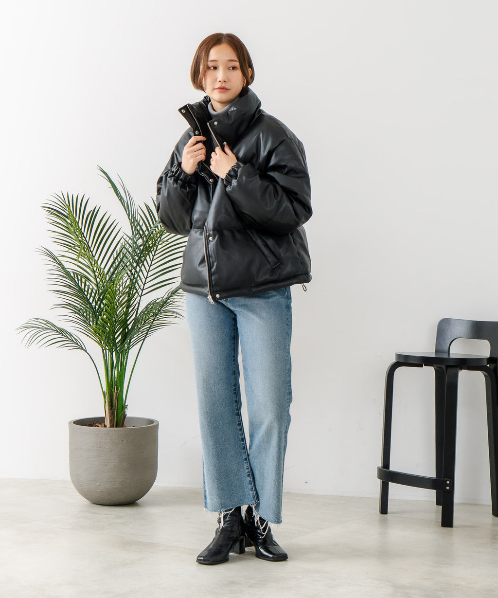 ボリューミーなシルエットの表地が合皮の中綿ブルゾン。