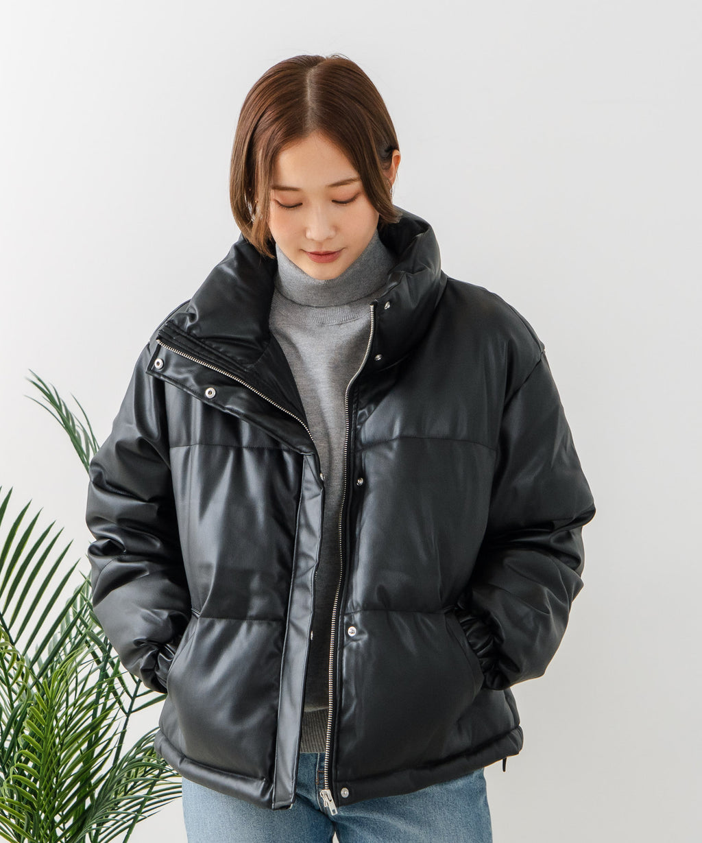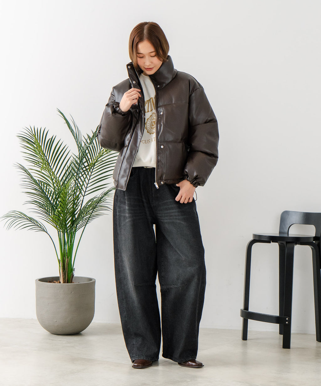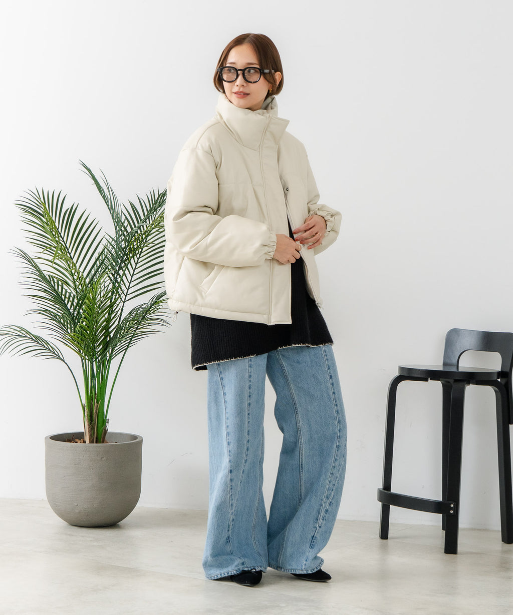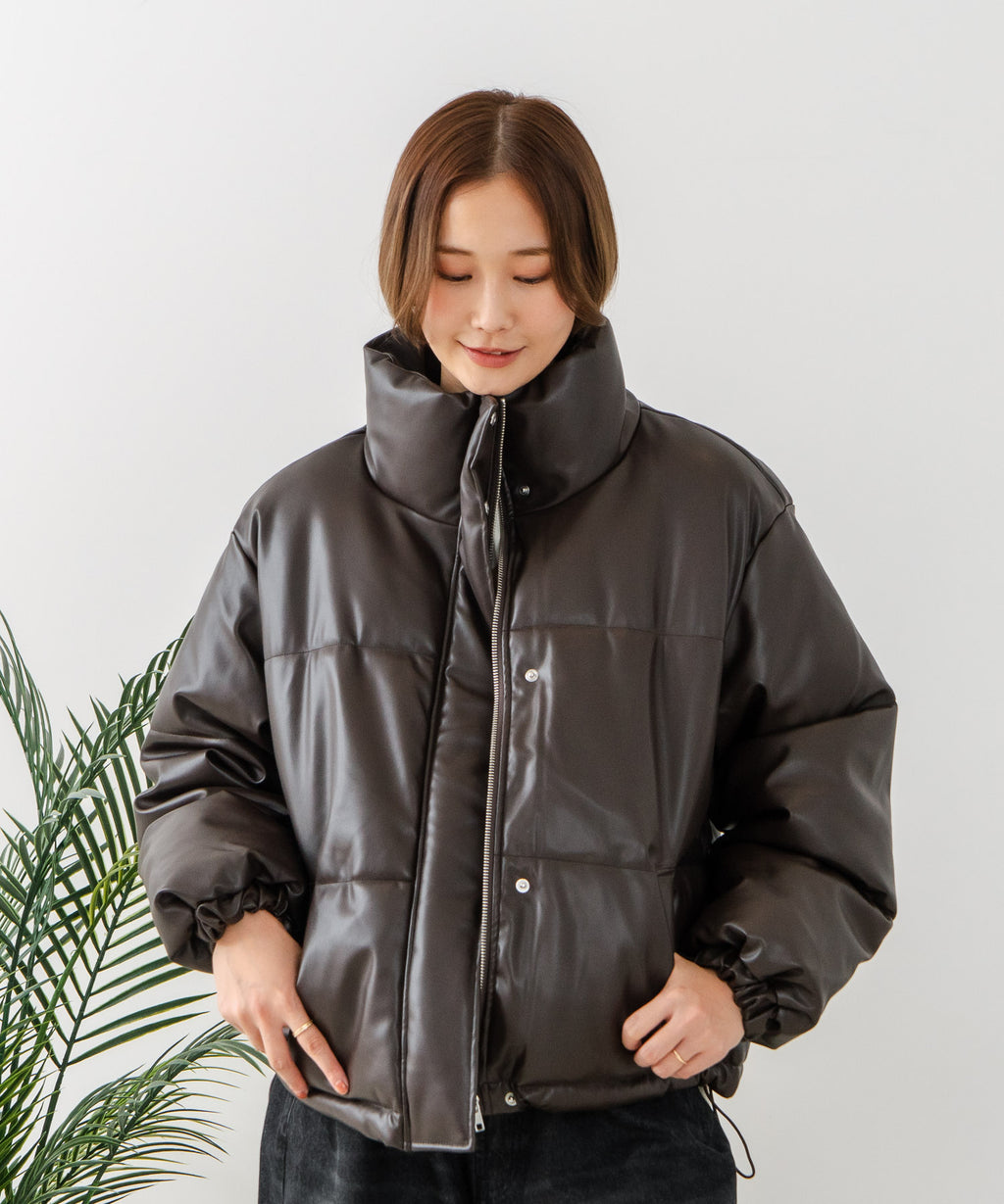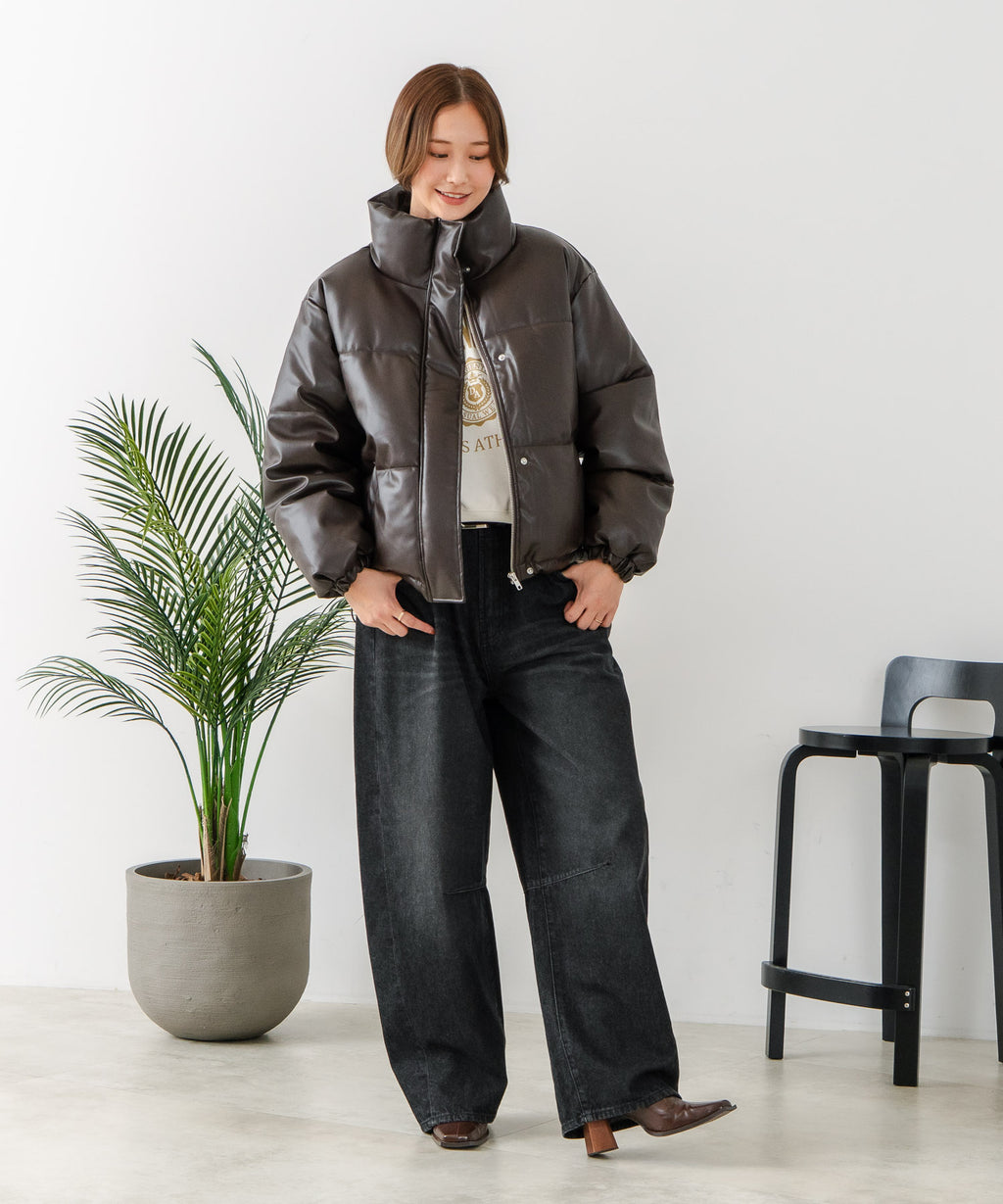 ボリューミーなシルエットの表地が合皮の中綿ブルゾン。