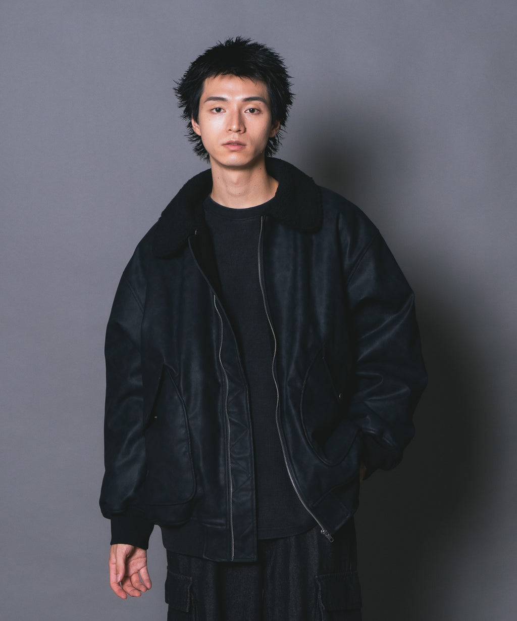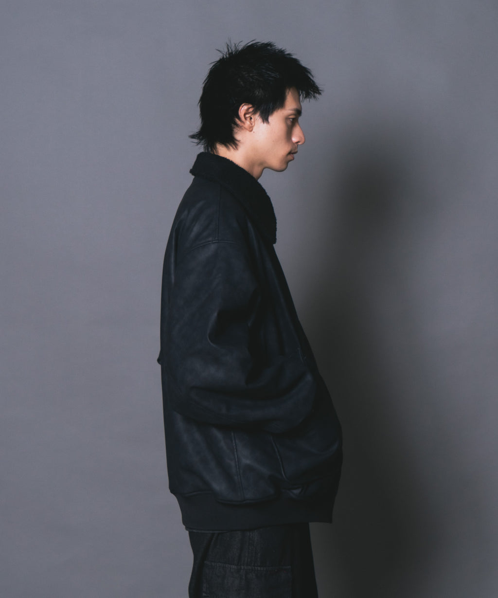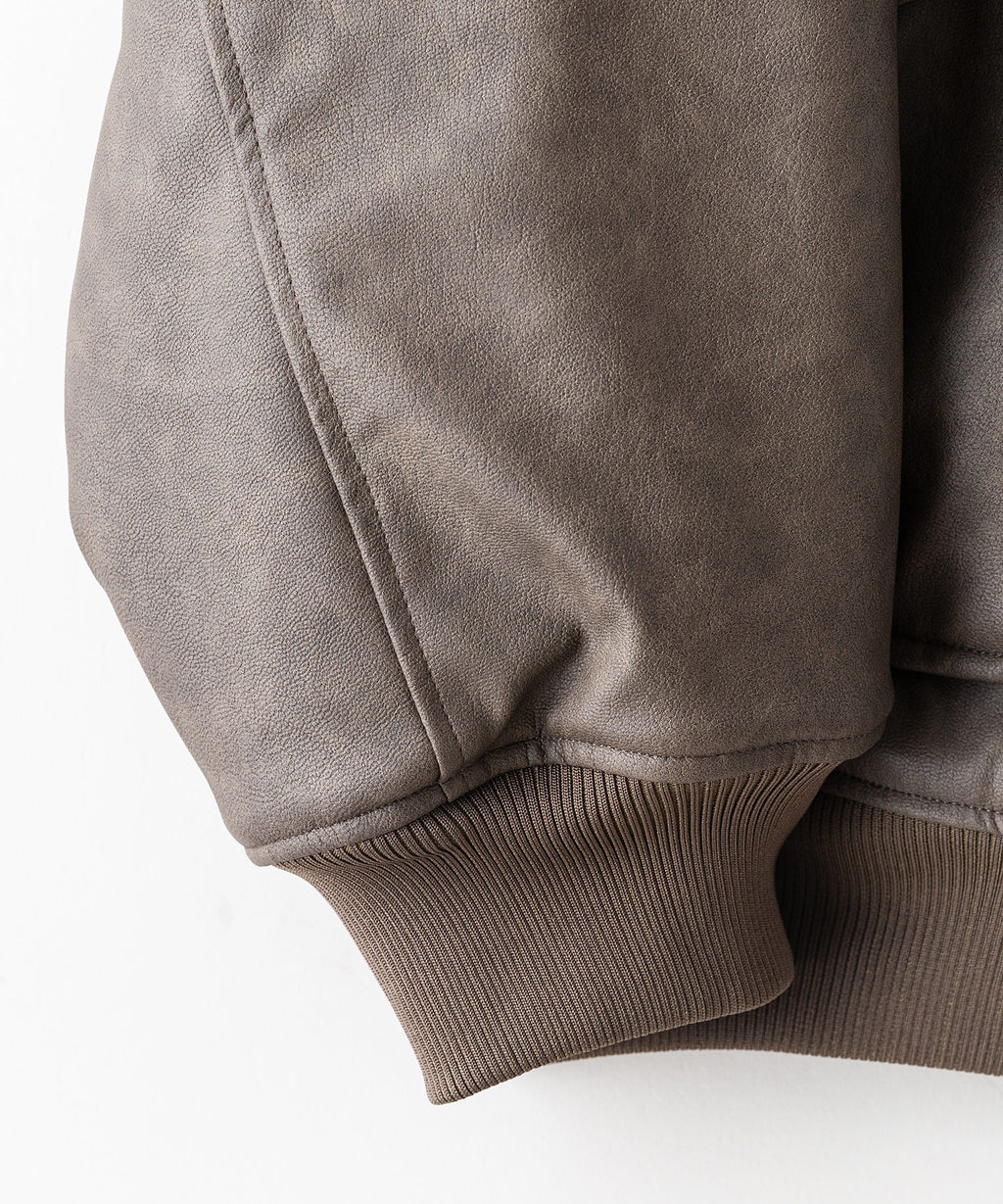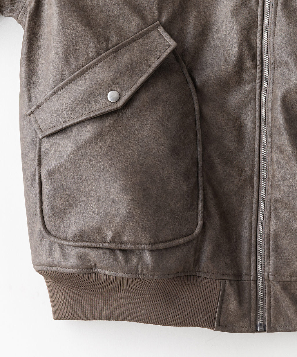 表地:合成皮革 裏地:ポリエステル100% 衿部分:ポリエステル100% リブ部分:ポリエステル97%ポリウレタン3%