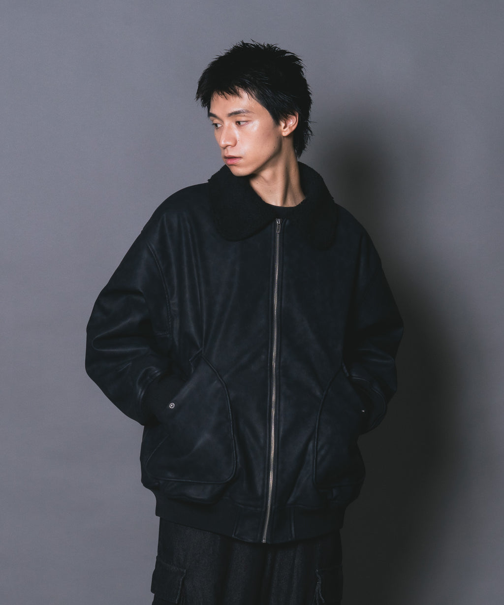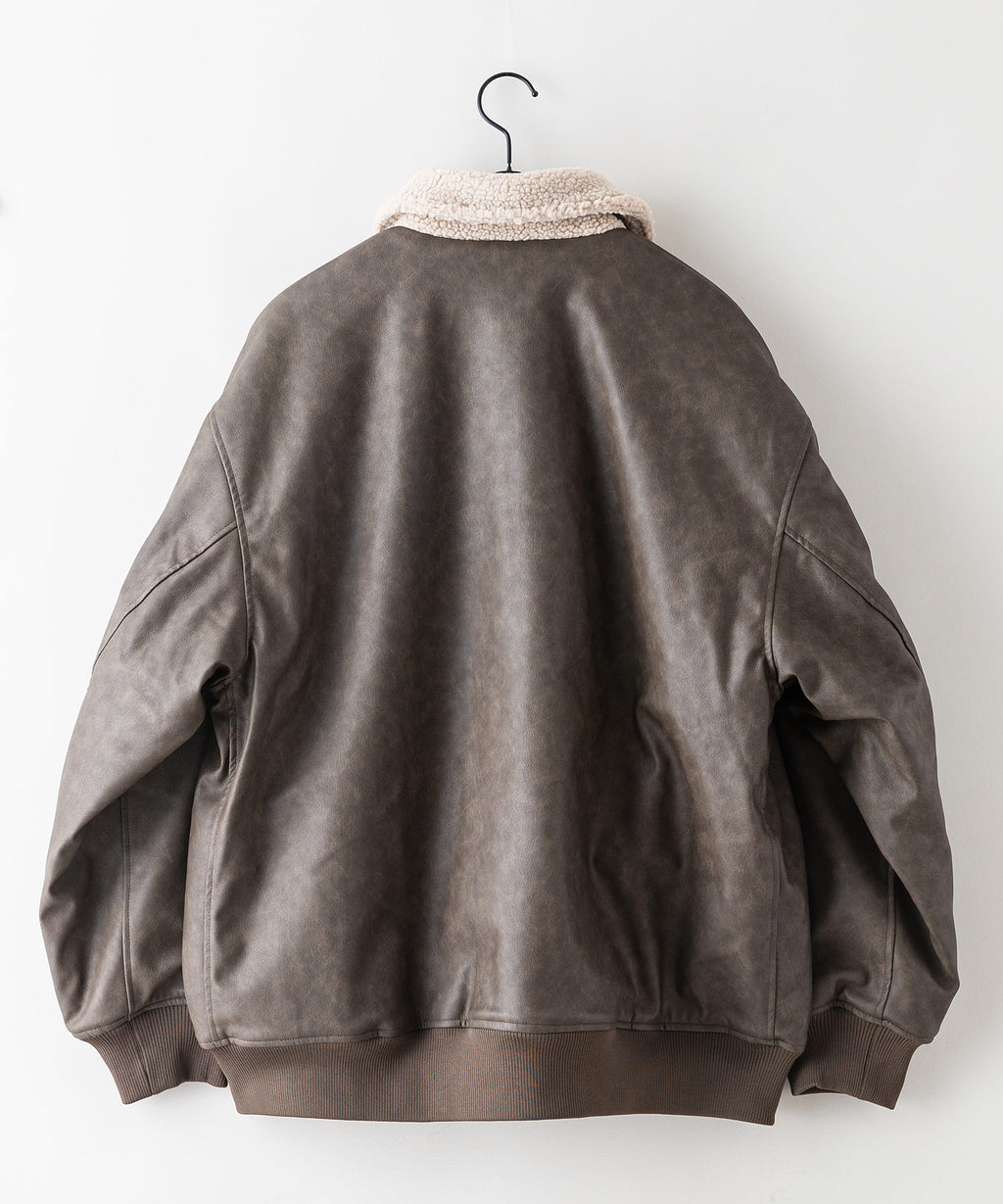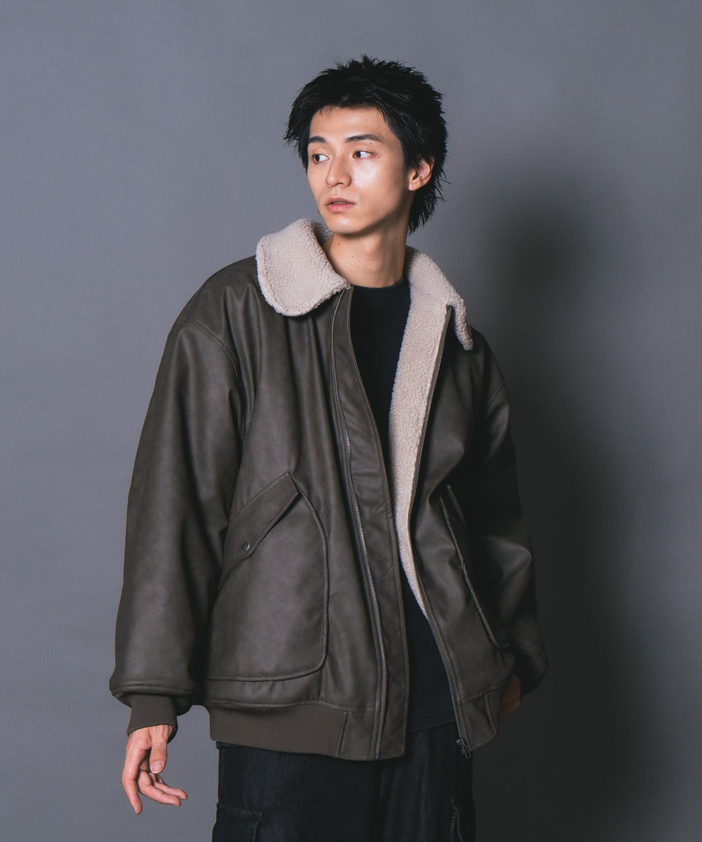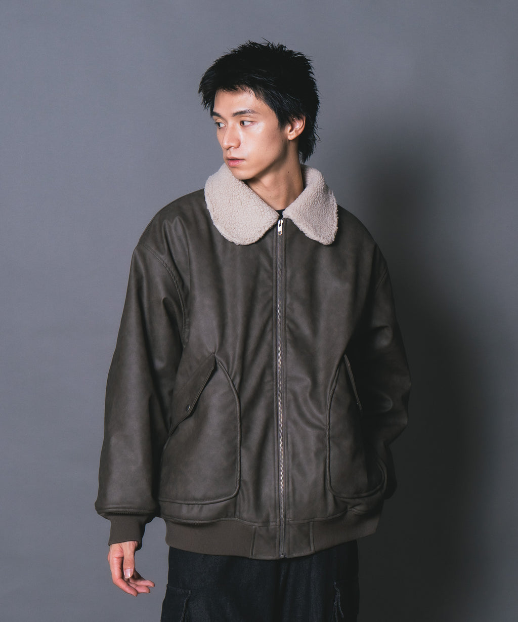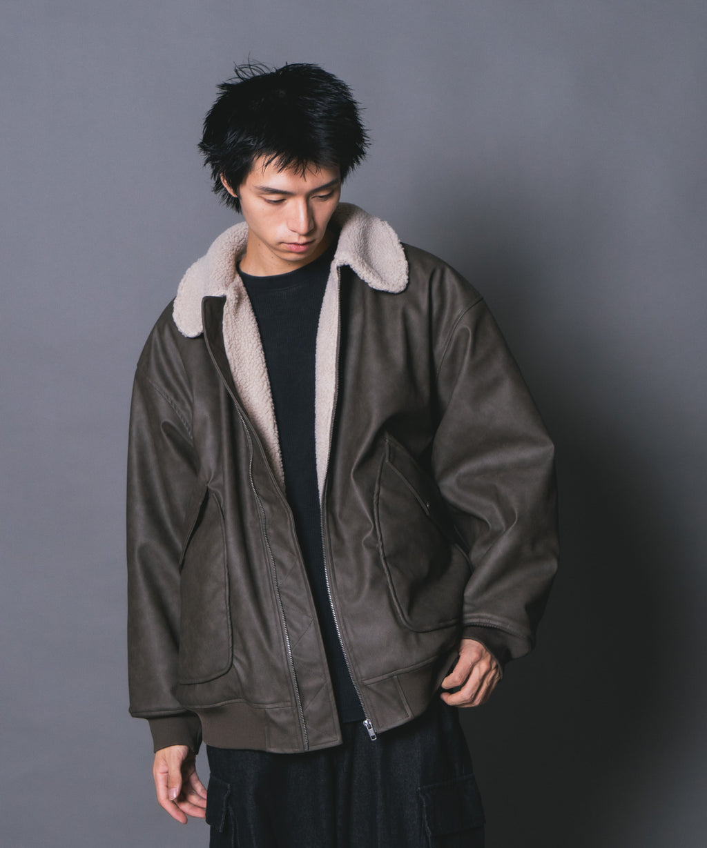 表地:合成皮革 裏地:ポリエステル100% 衿部分:ポリエステル100% リブ部分:ポリエステル97%ポリウレタン3%