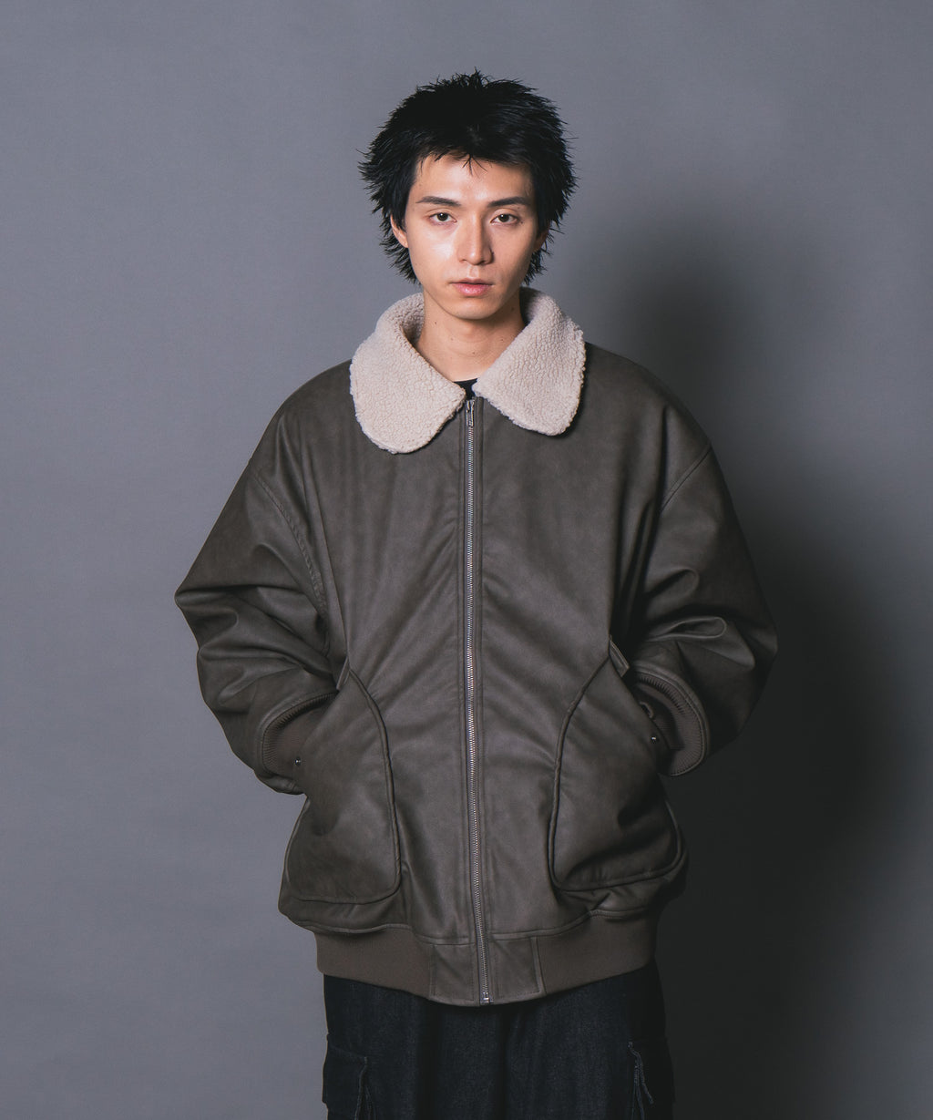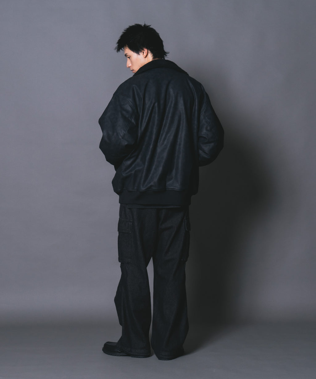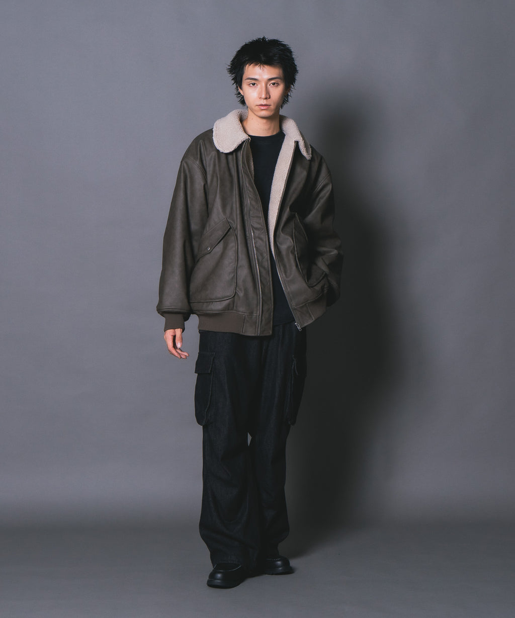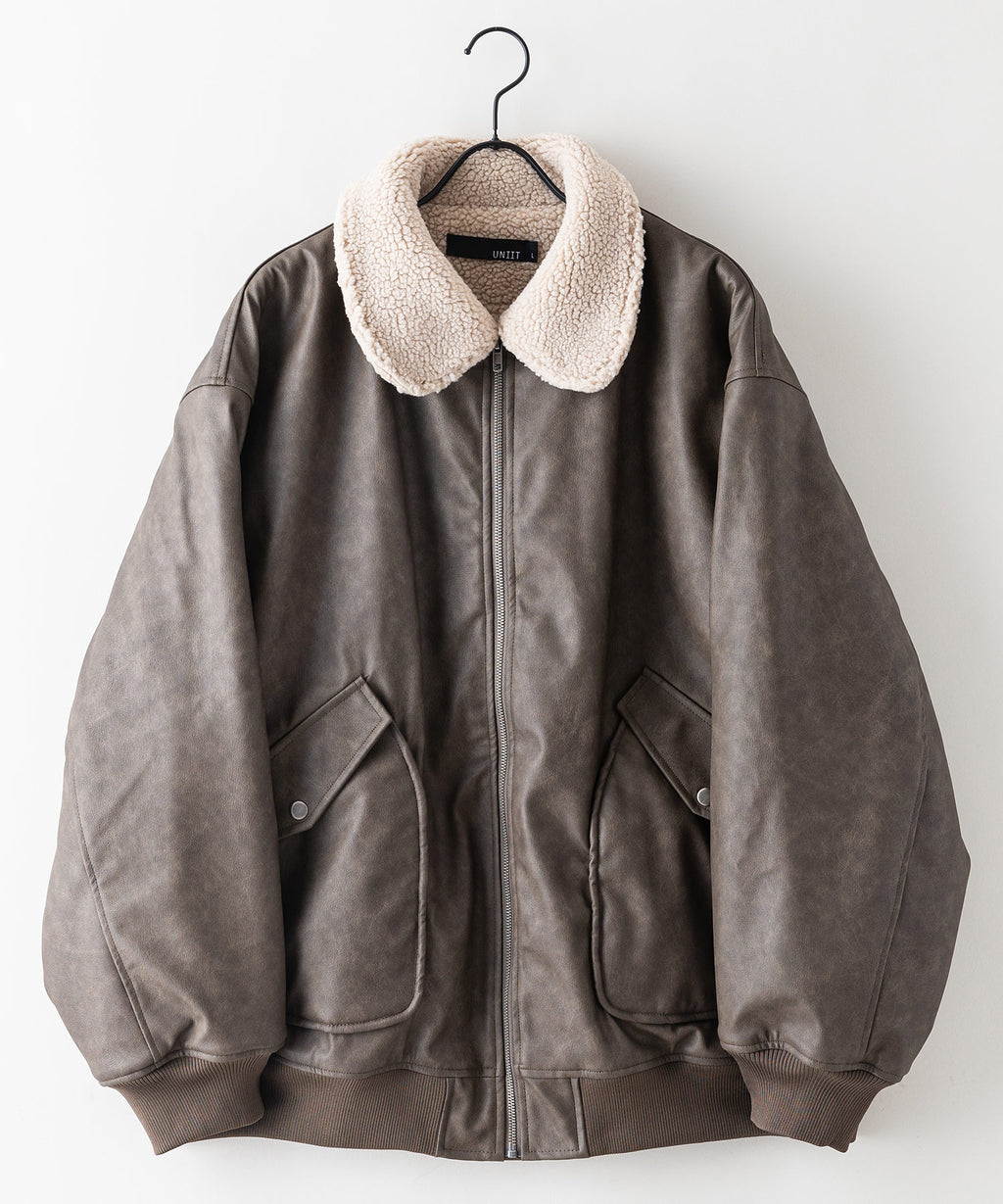 表地:合成皮革 裏地:ポリエステル100% 衿部分:ポリエステル100% リブ部分:ポリエステル97%ポリウレタン3%