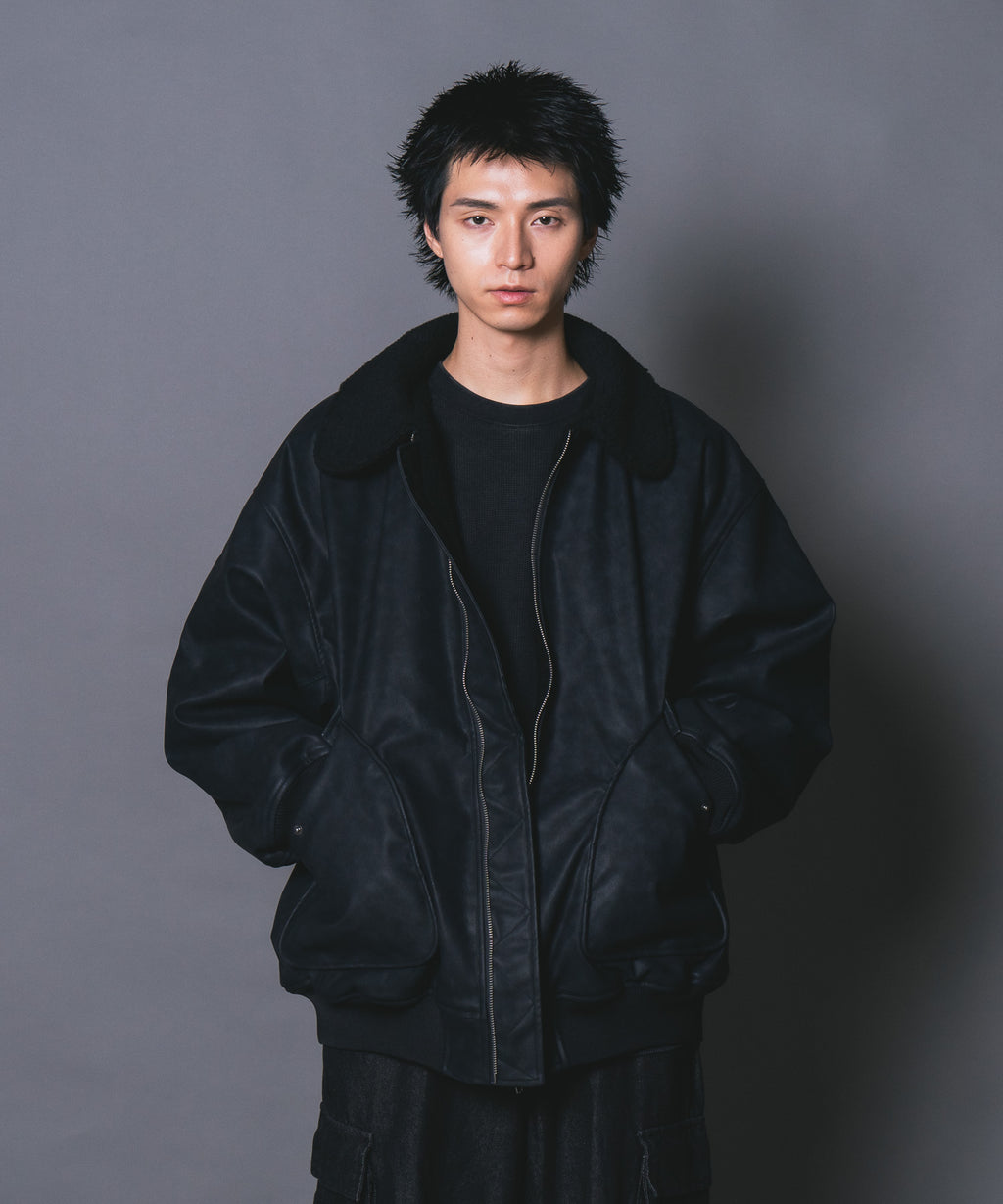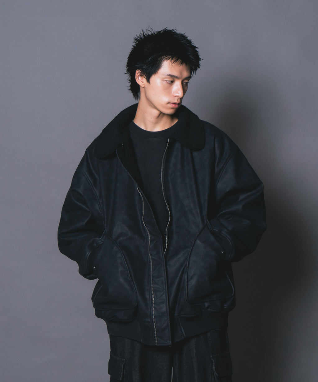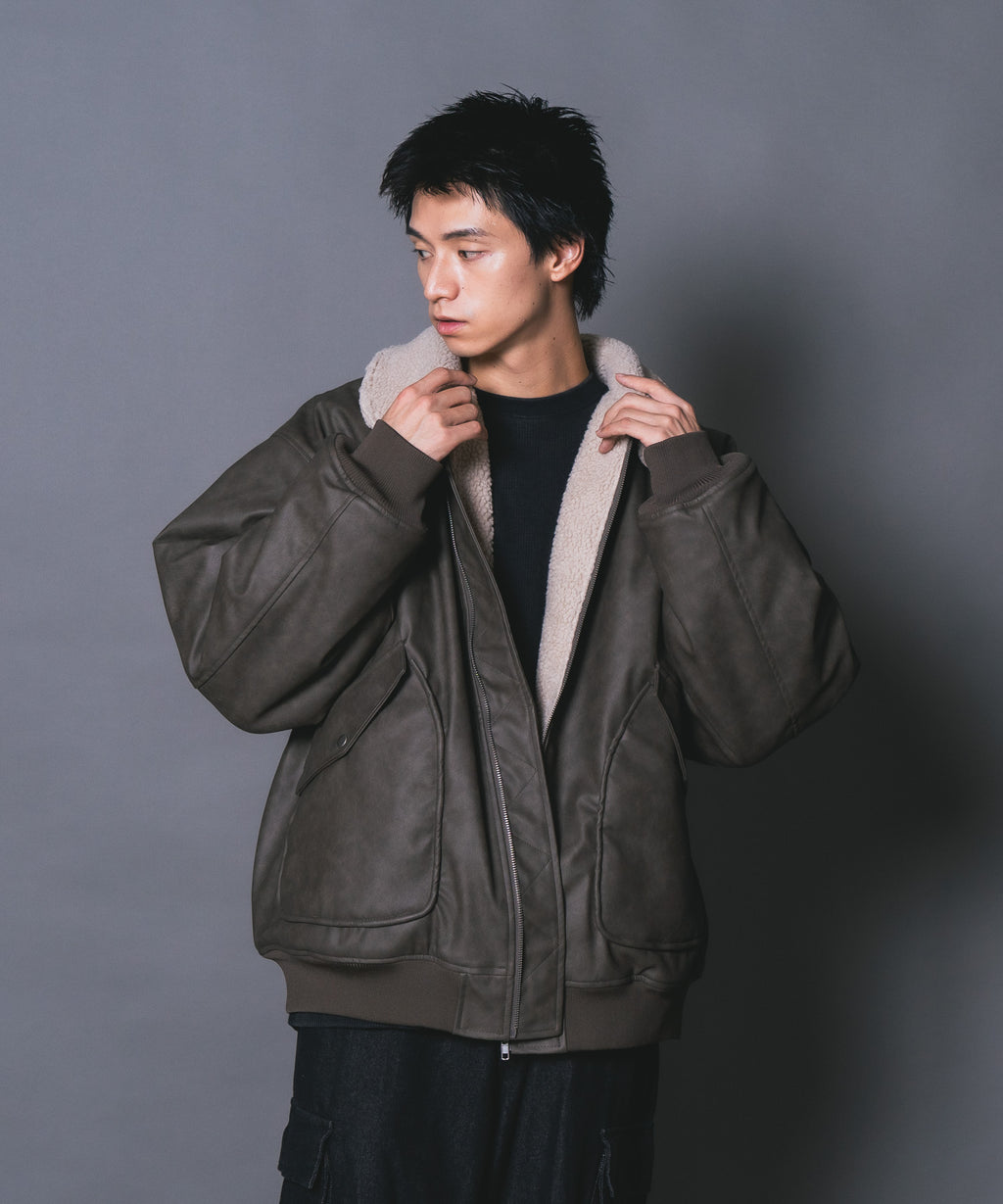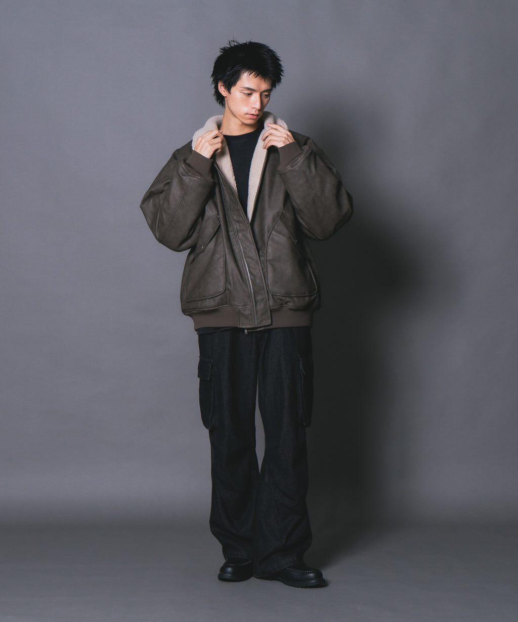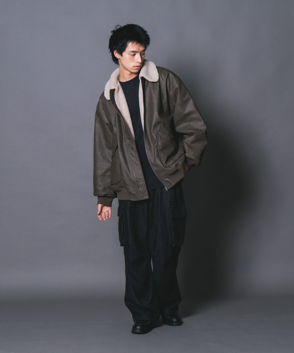 表地:合成皮革 裏地:ポリエステル100% 衿部分:ポリエステル100% リブ部分:ポリエステル97%ポリウレタン3%