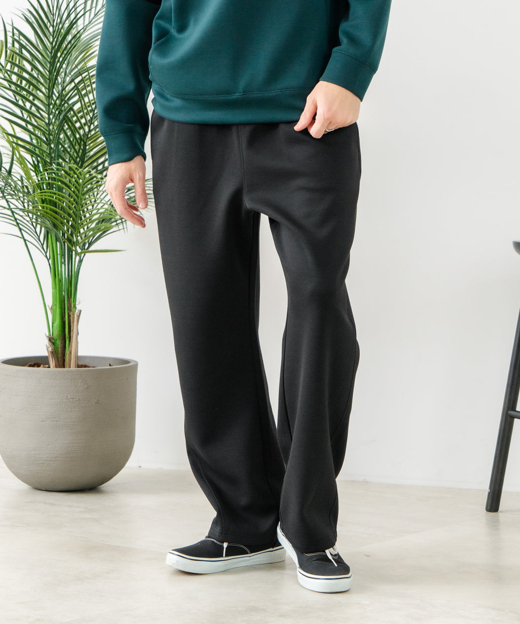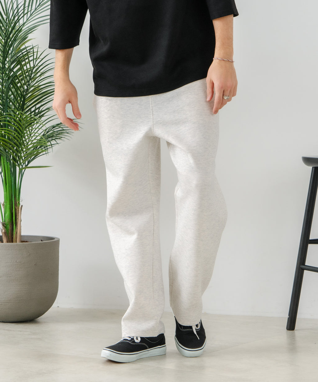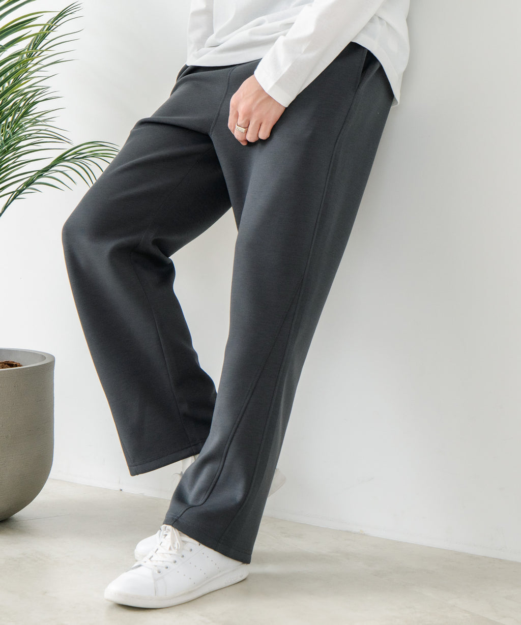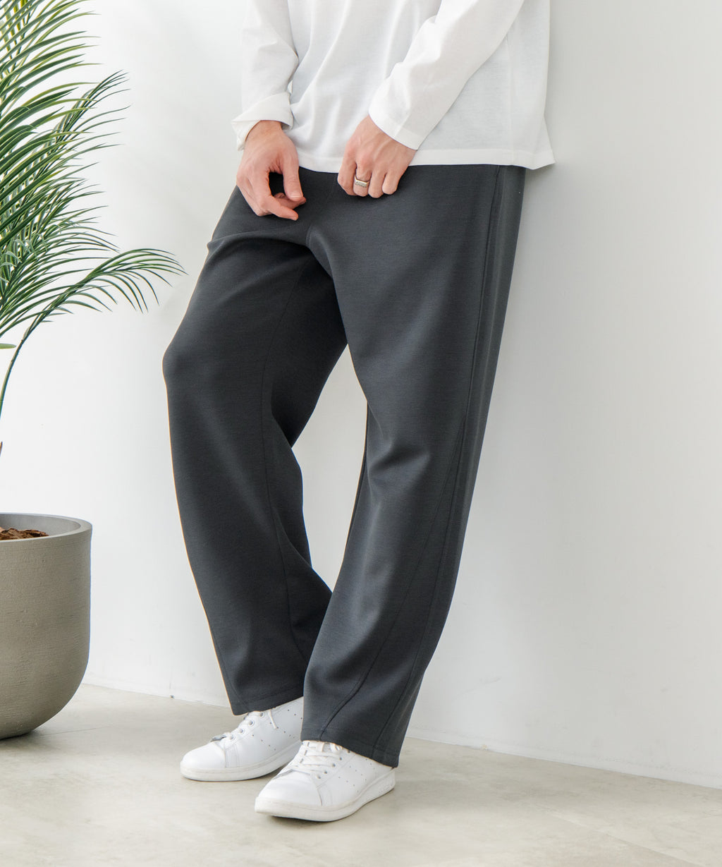 ハリがありシワになりにくく、ストレッチ性も高く動きやすいパフィースウェットを使用した、トレンド感あるバレルレッグパンツです。