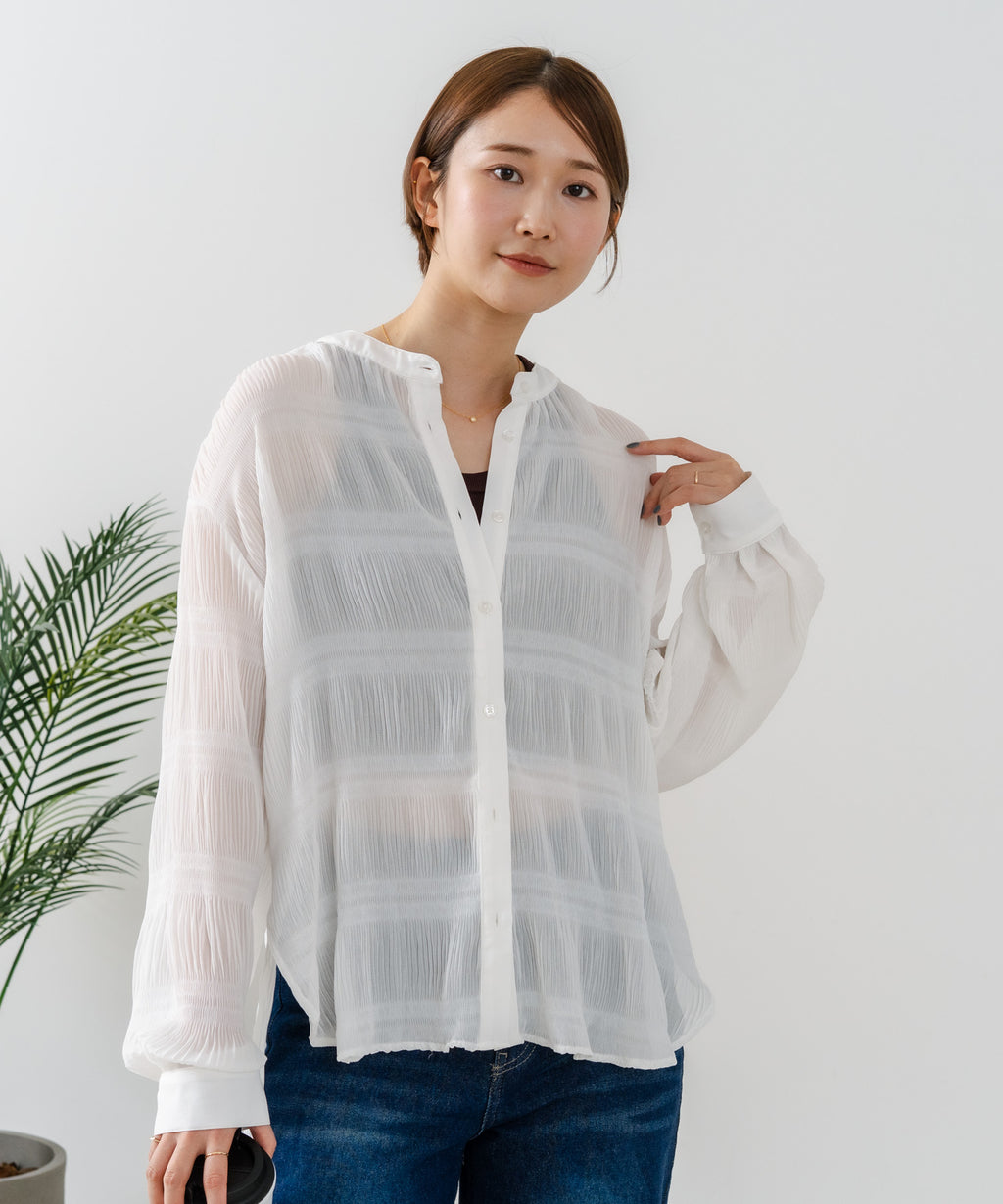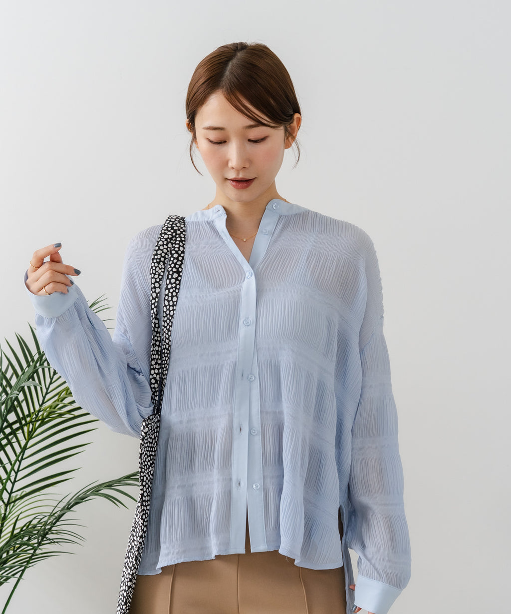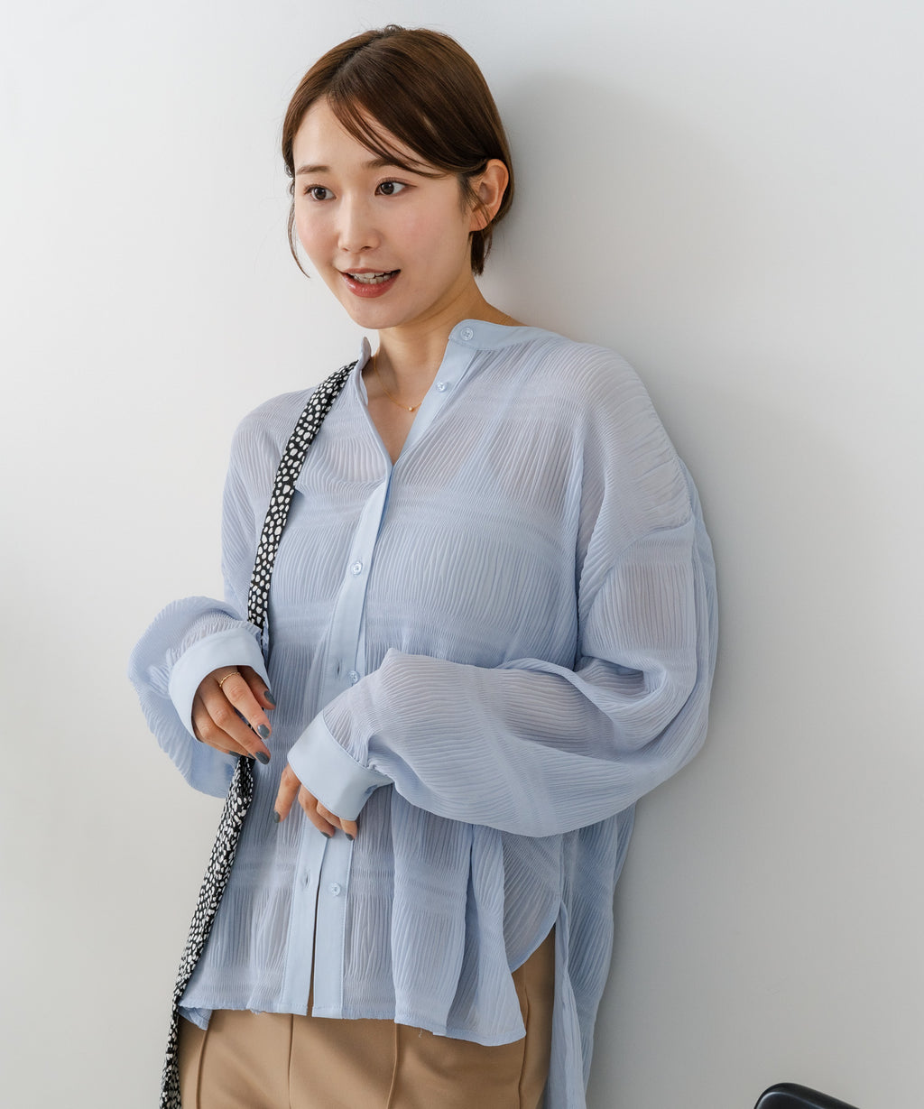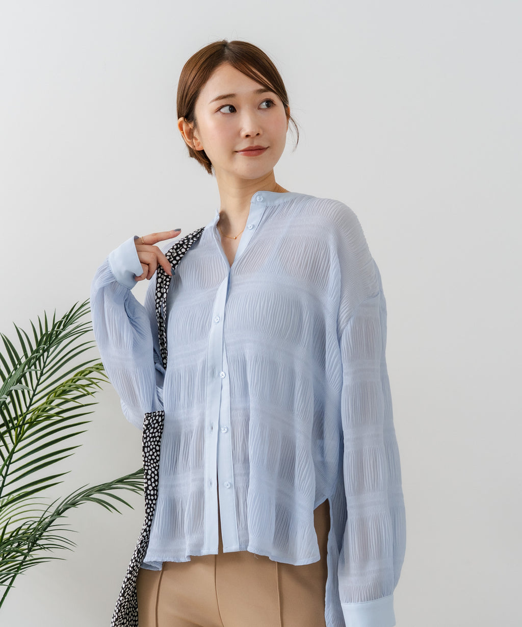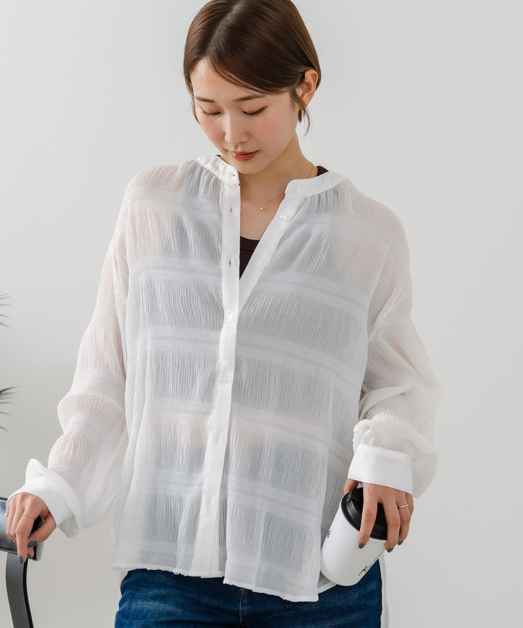 無地、ワンポイント刺繍、ストライプ、総柄シャツと共に、今期の人気アイテムとなるプリーツブラウス。