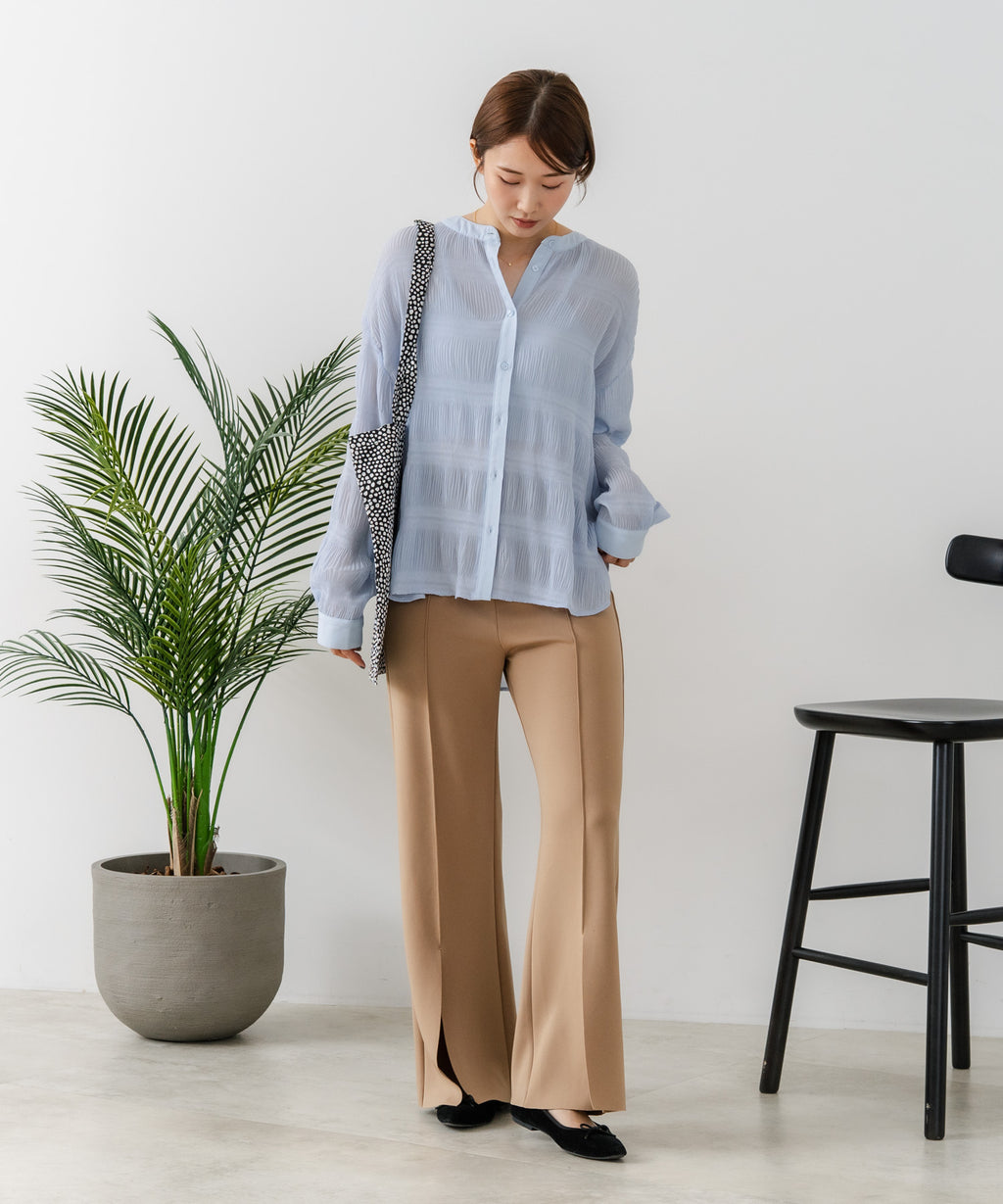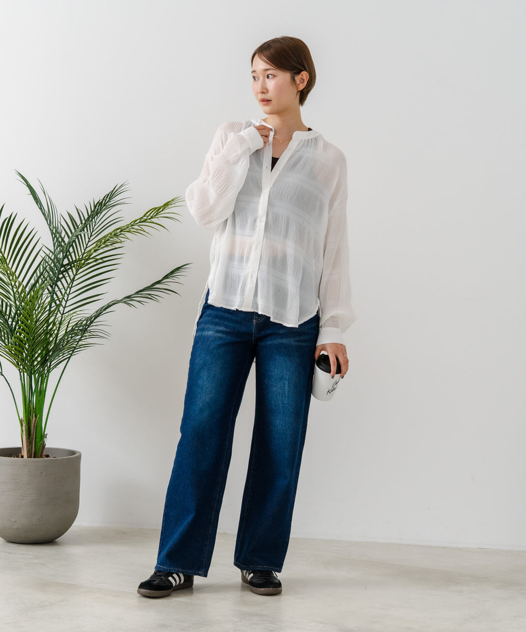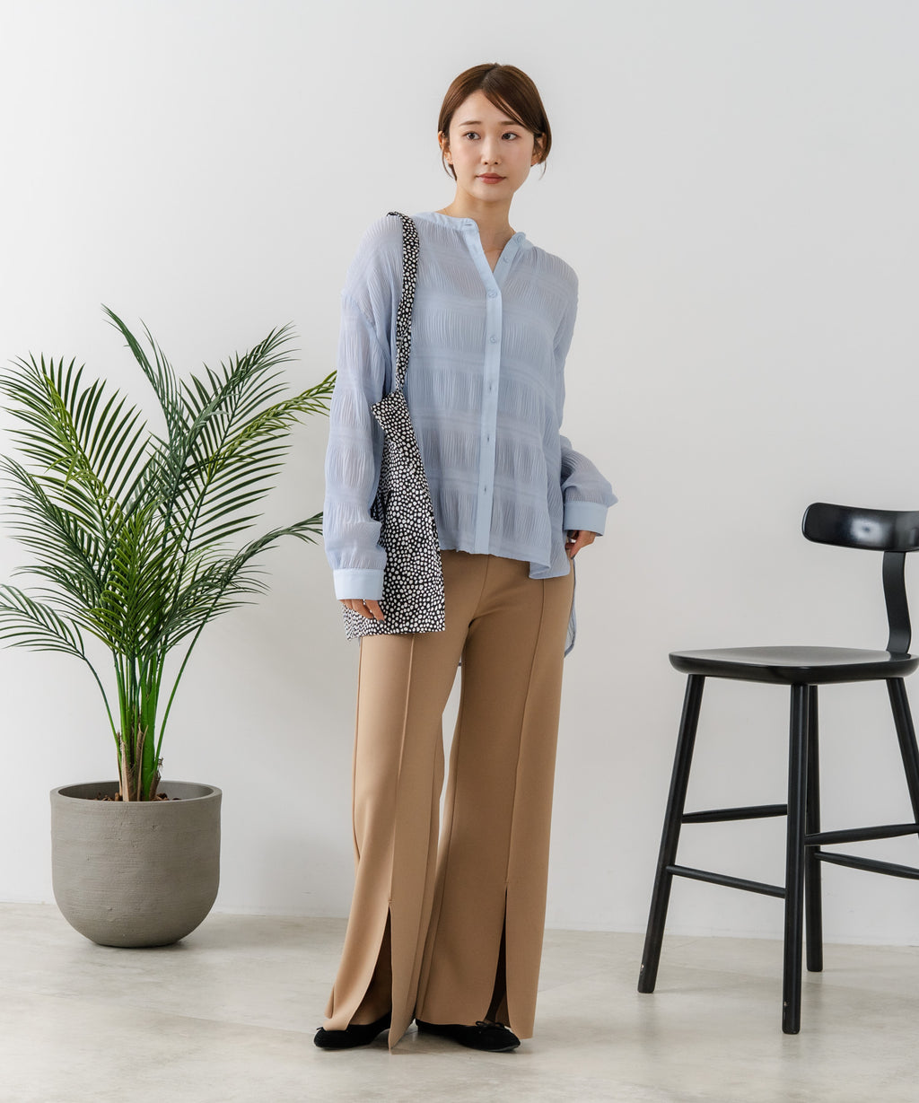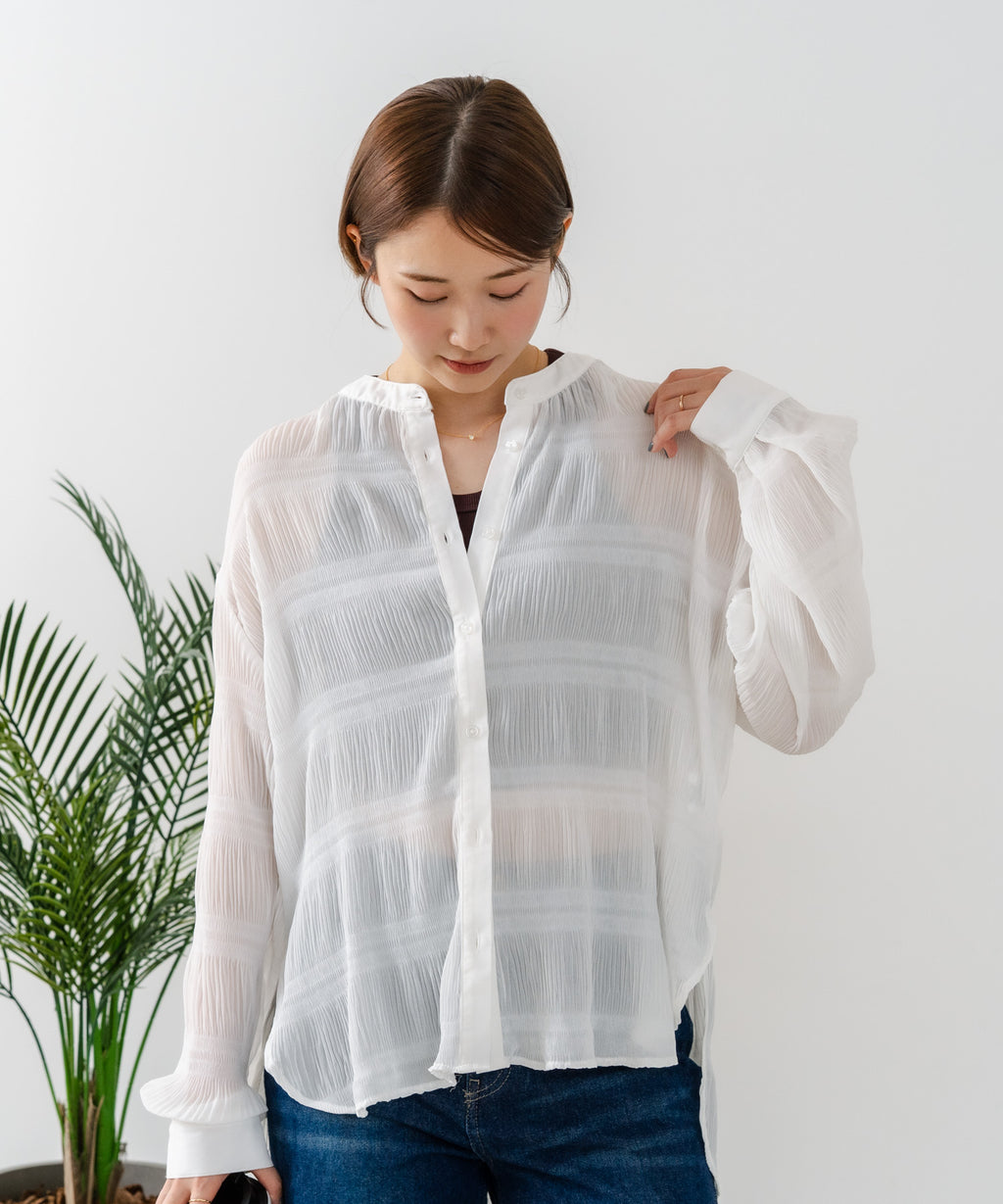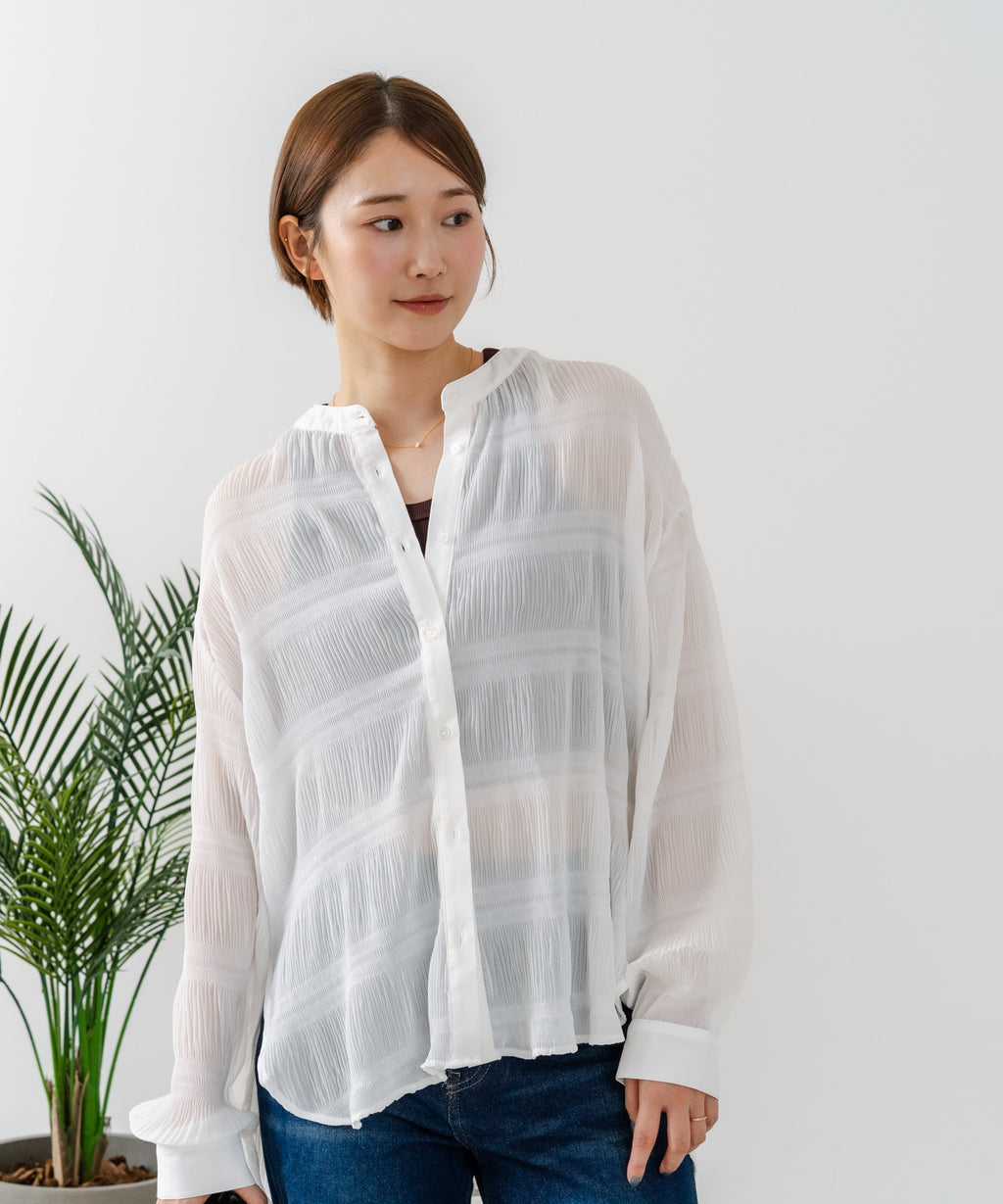 無地、ワンポイント刺繍、ストライプ、総柄シャツと共に、今期の人気アイテムとなるプリーツブラウス。