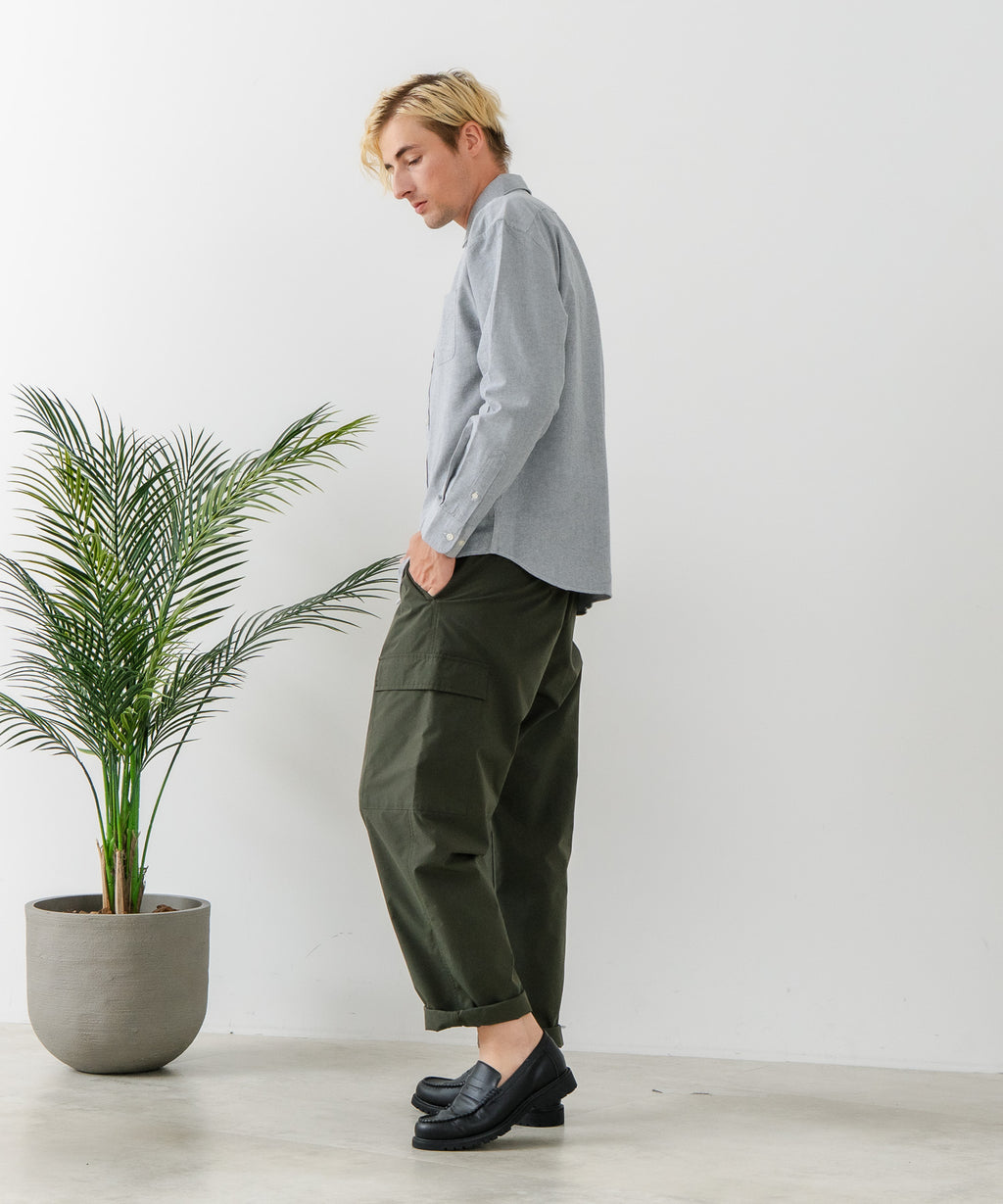 横糸に太番手の糸を使用した、しっかりした頑丈なコットンを採用しており、着込むことで風合いが増し、経年変化も楽しみな1着です。