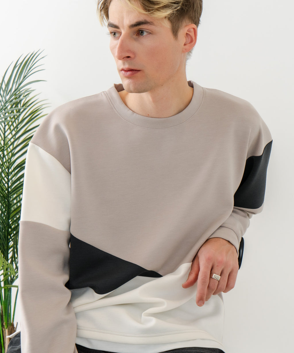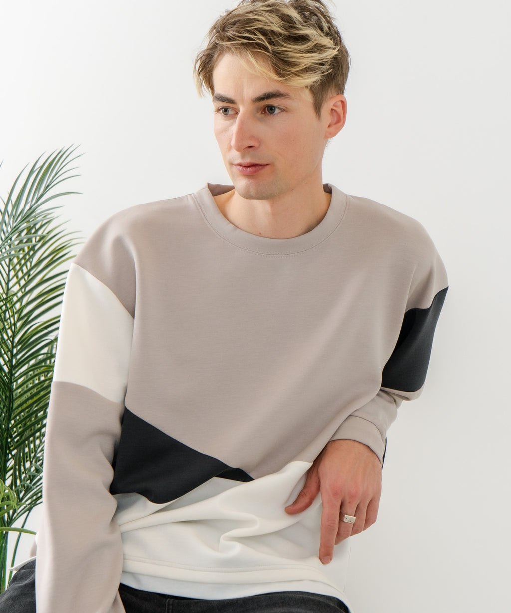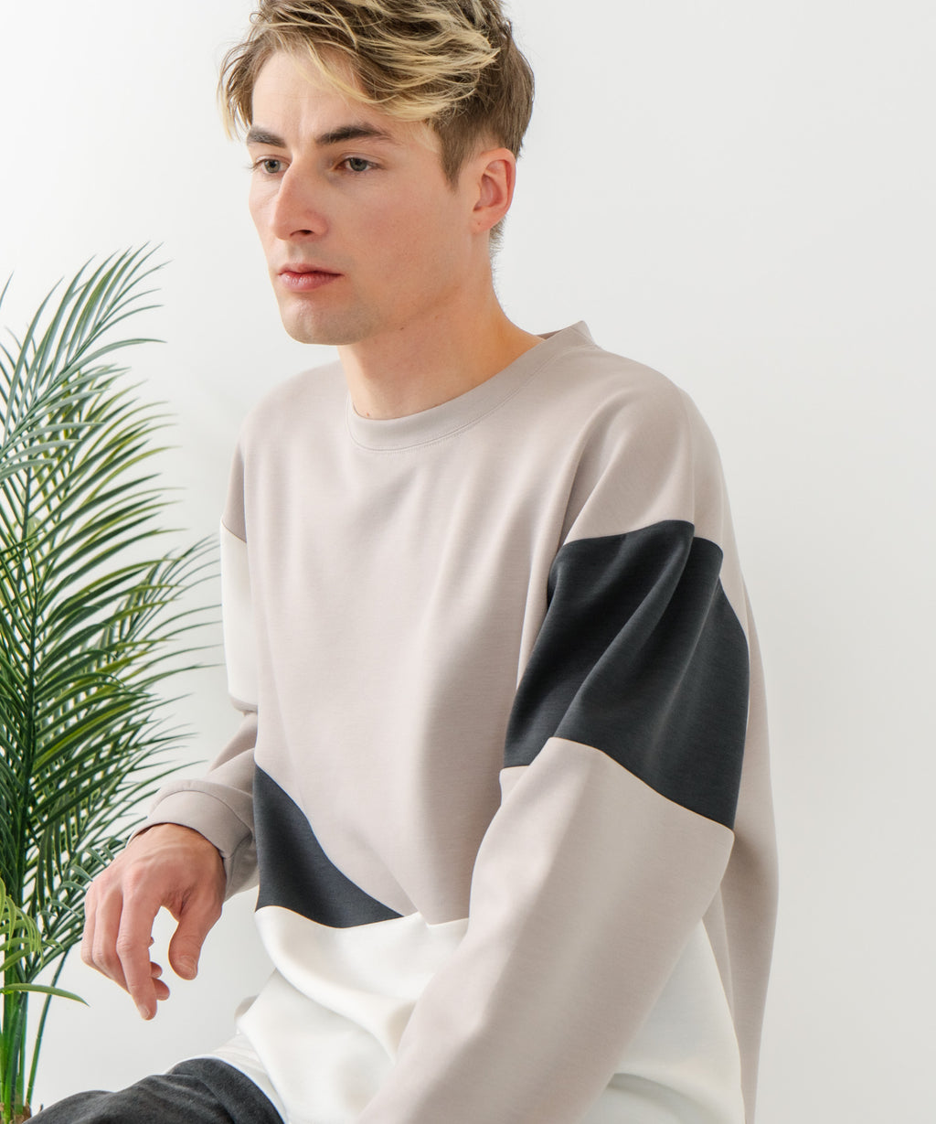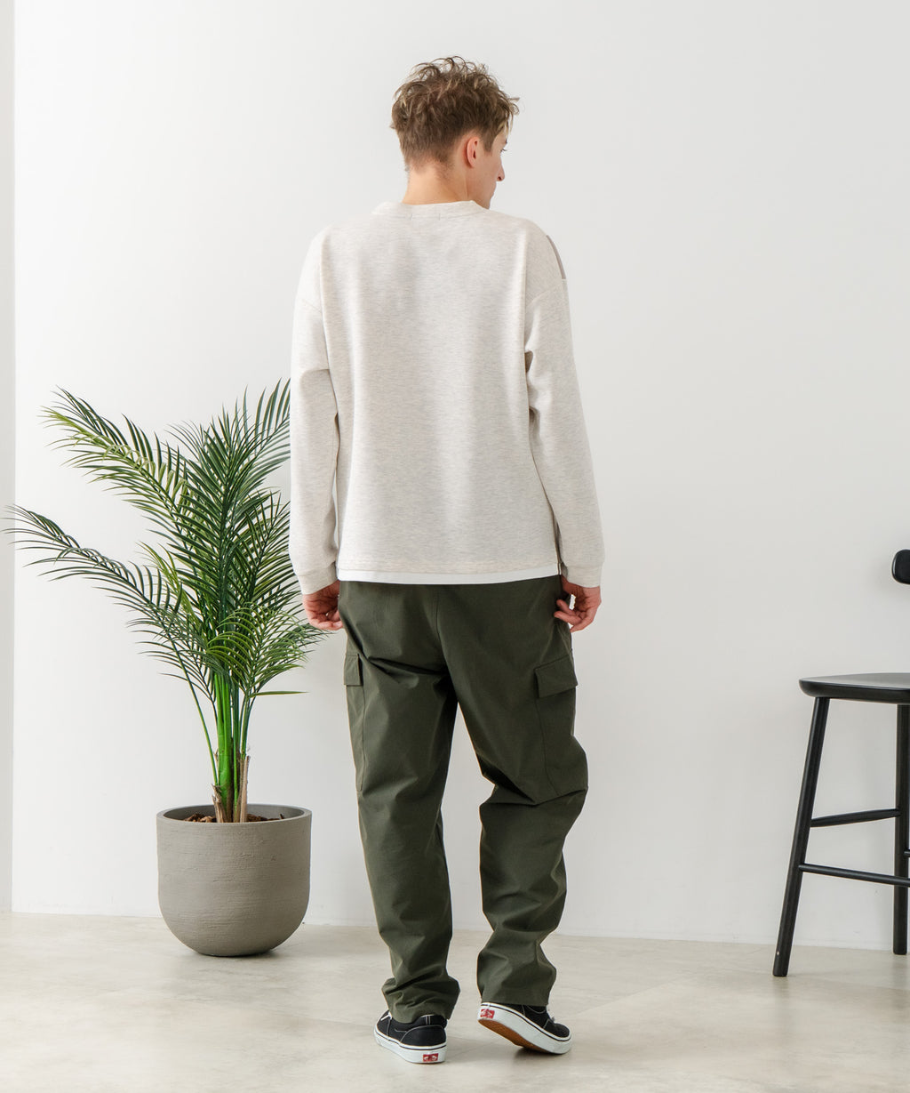 ハリがありシワになりにくく、ストレッチ性も高く動きやすいパフィースウェットを使用したクルーネックトレーナーです。
