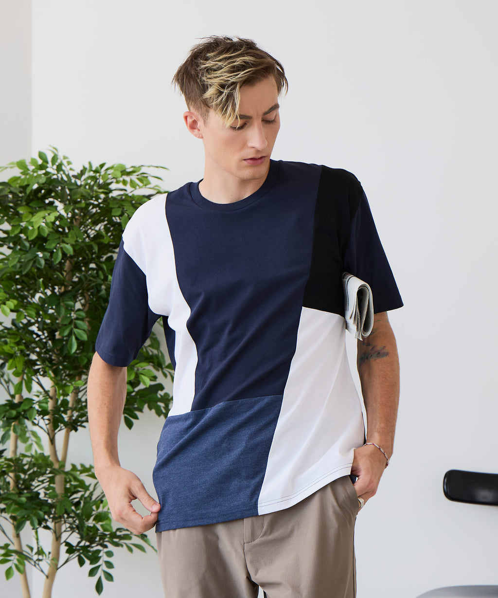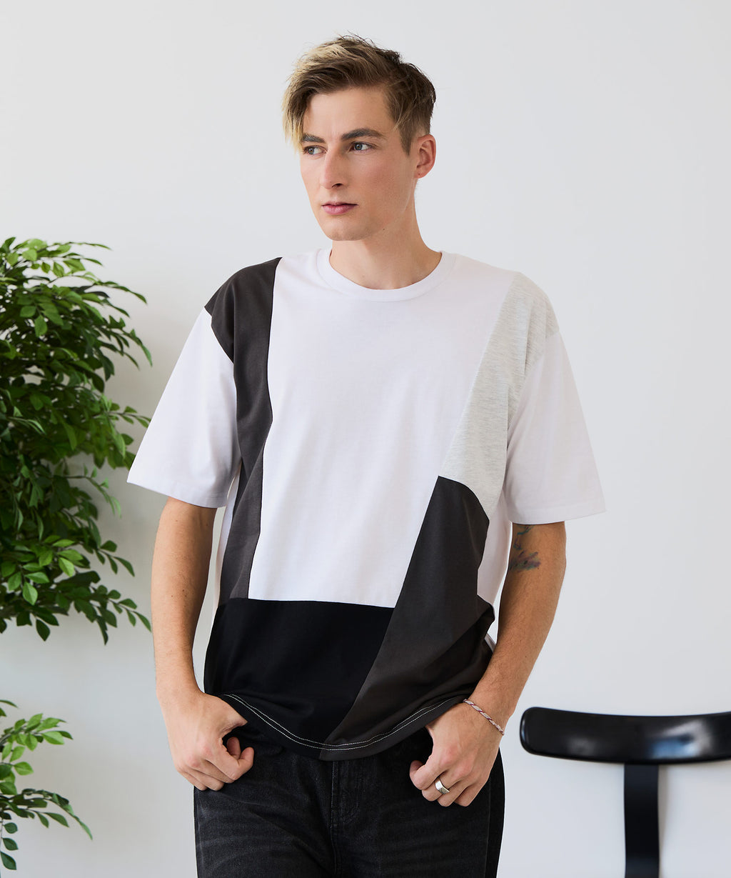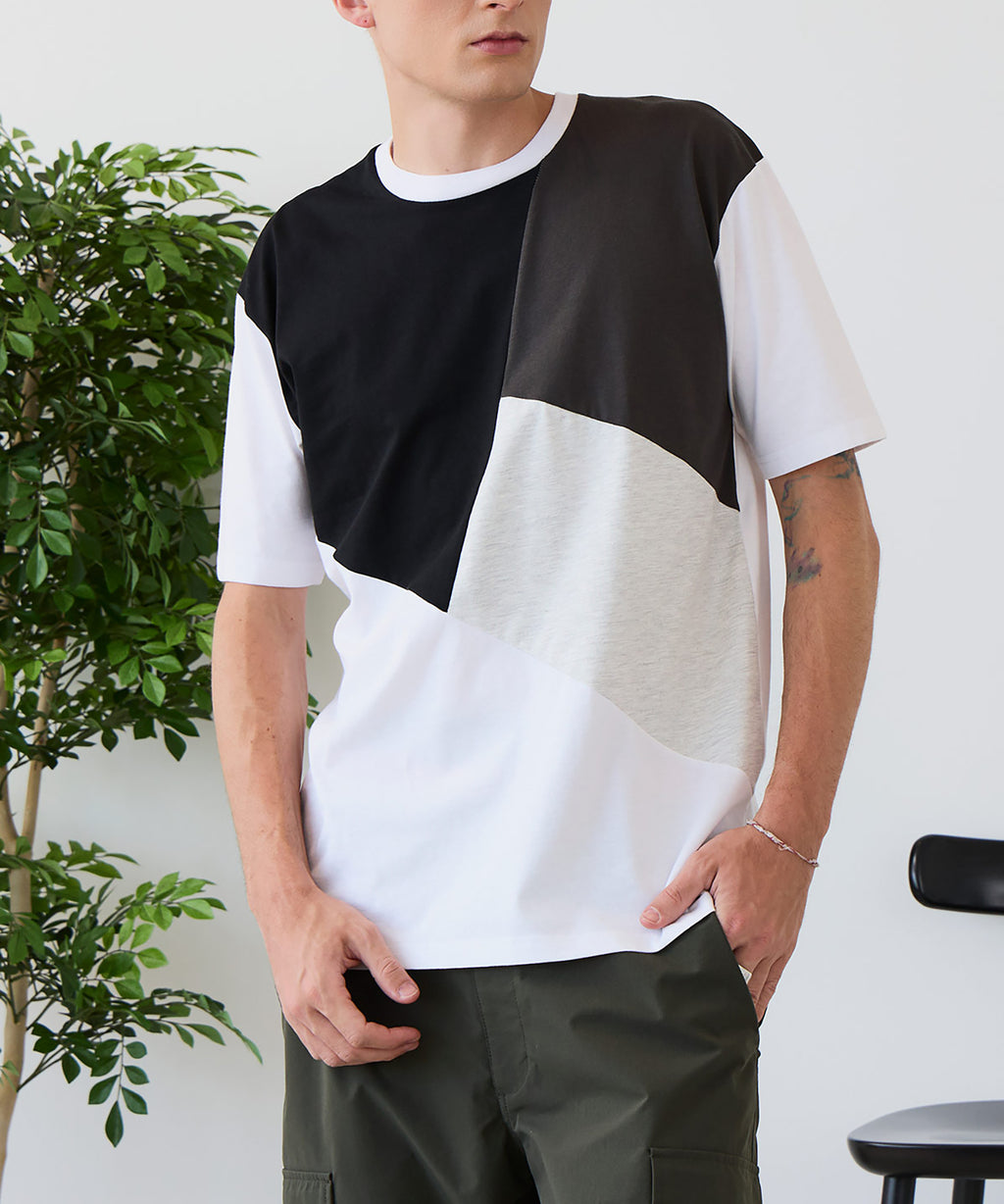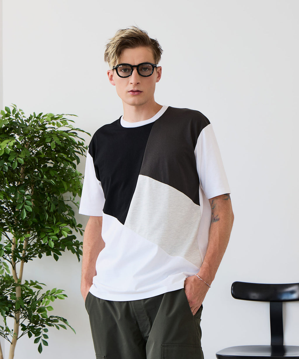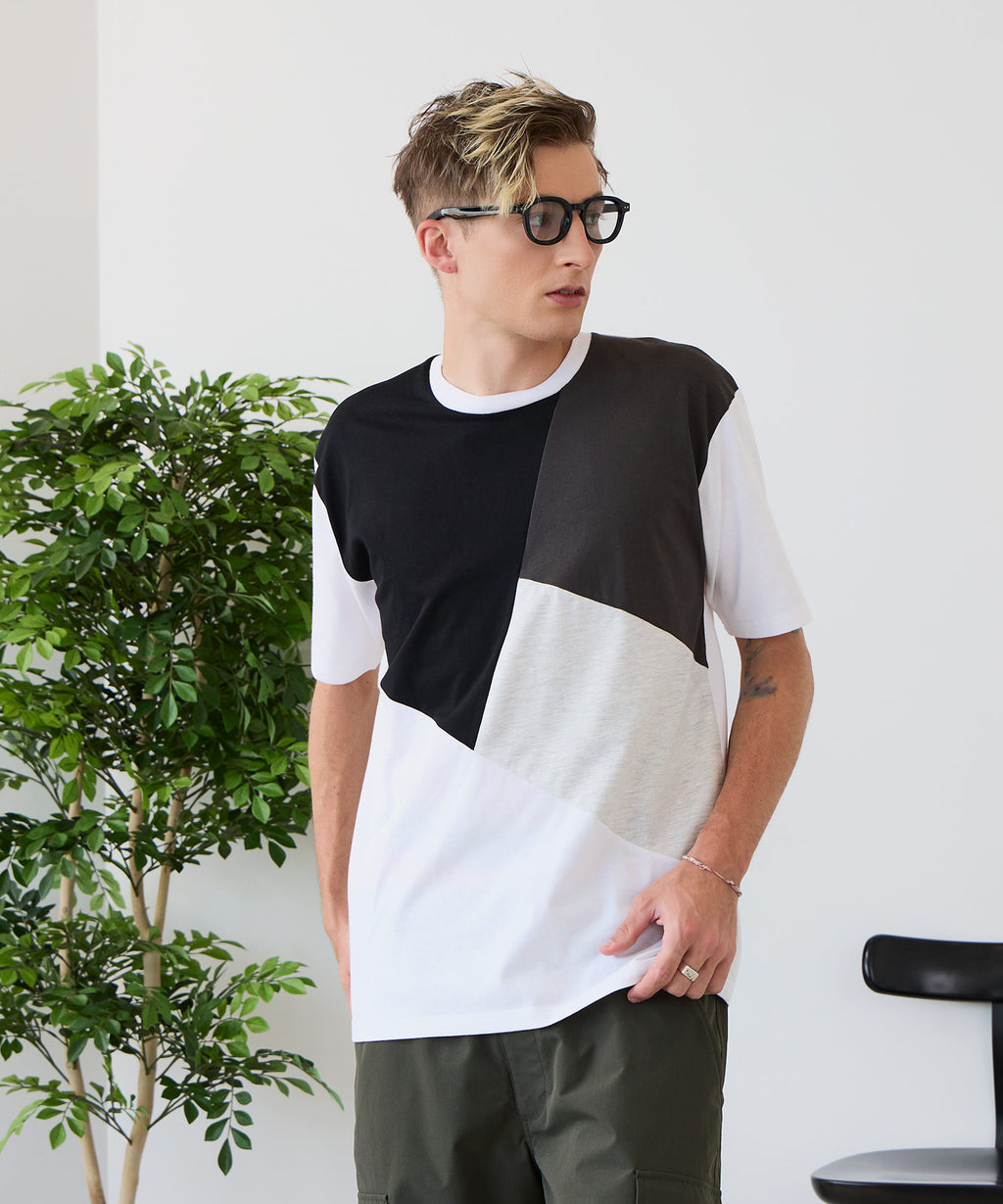 大胆な切り替えデザインが目を惹くデザインTシャツは、1枚でサマになる優れものです。