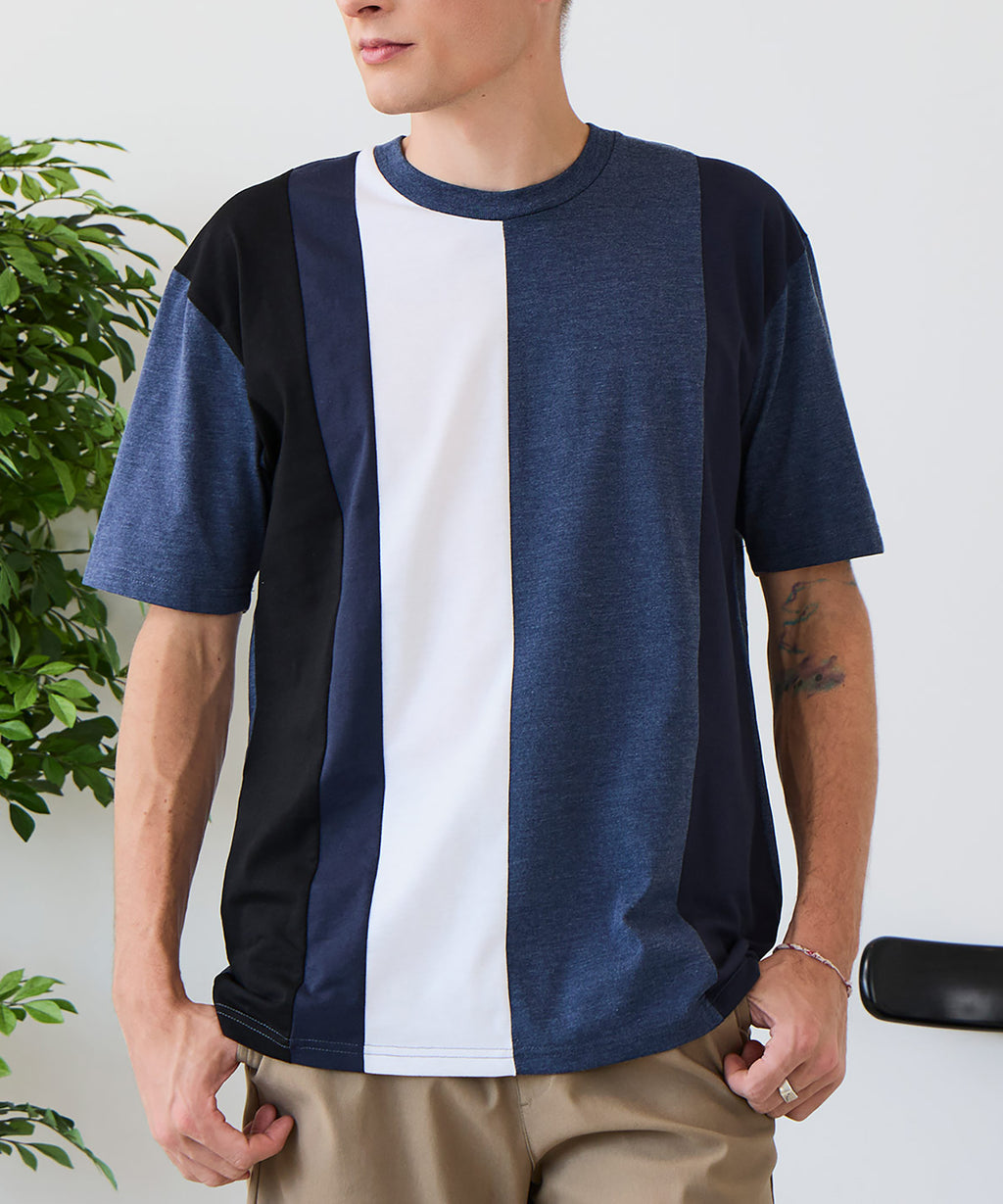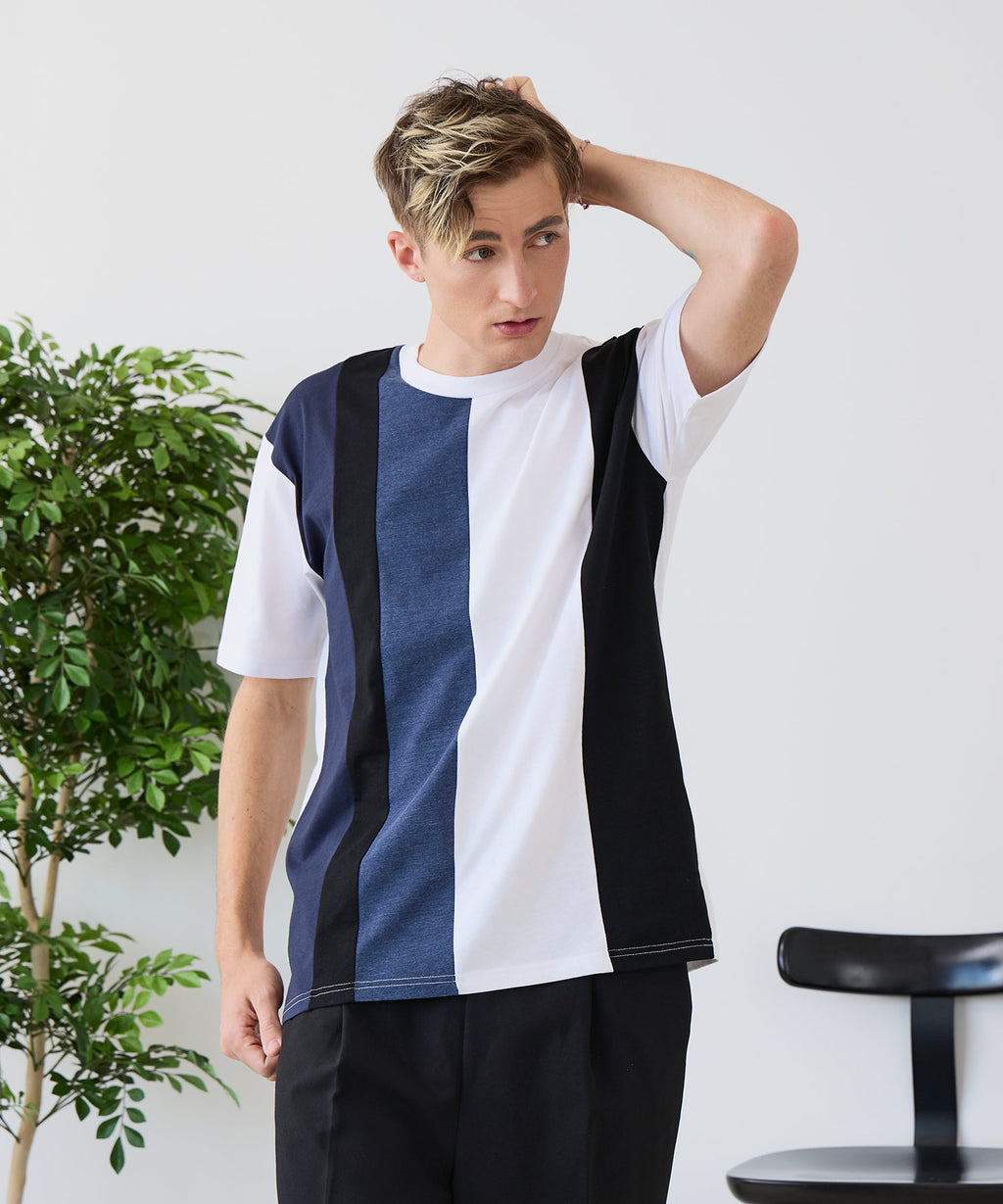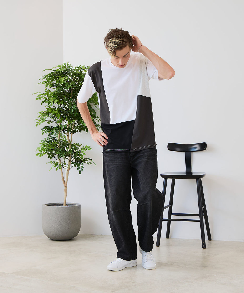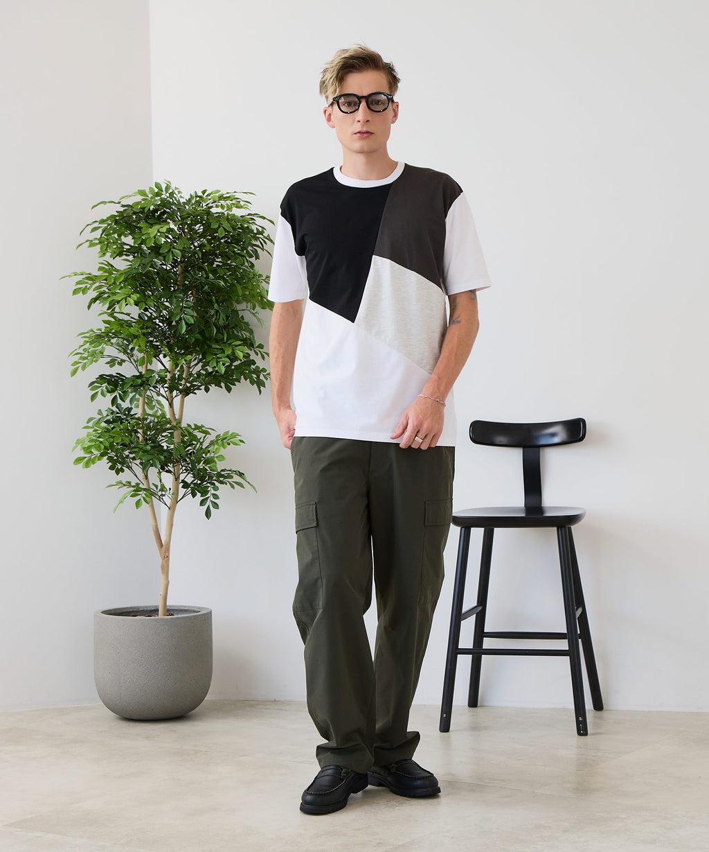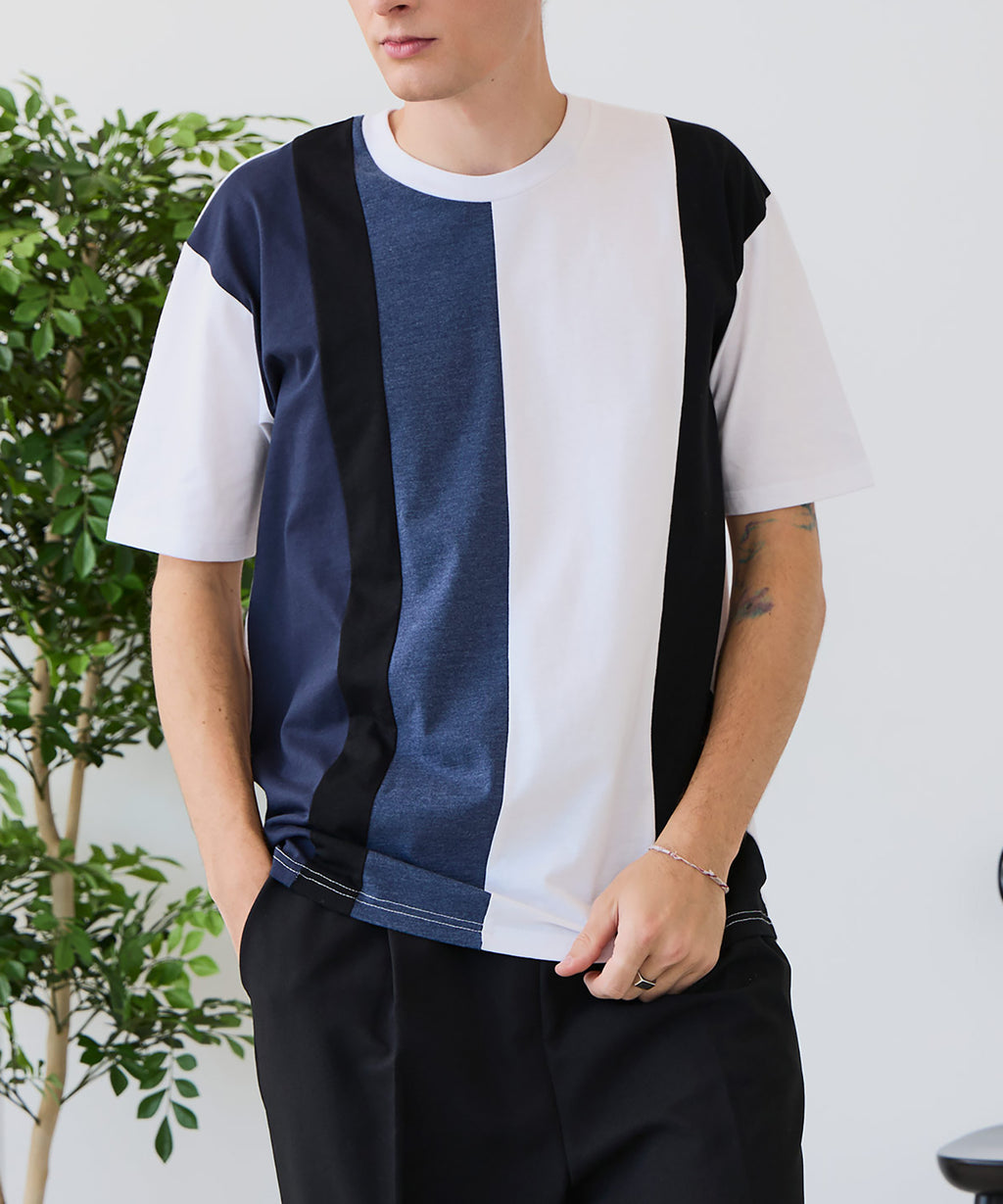 大胆な切り替えデザインが目を惹くデザインTシャツは、1枚でサマになる優れものです。