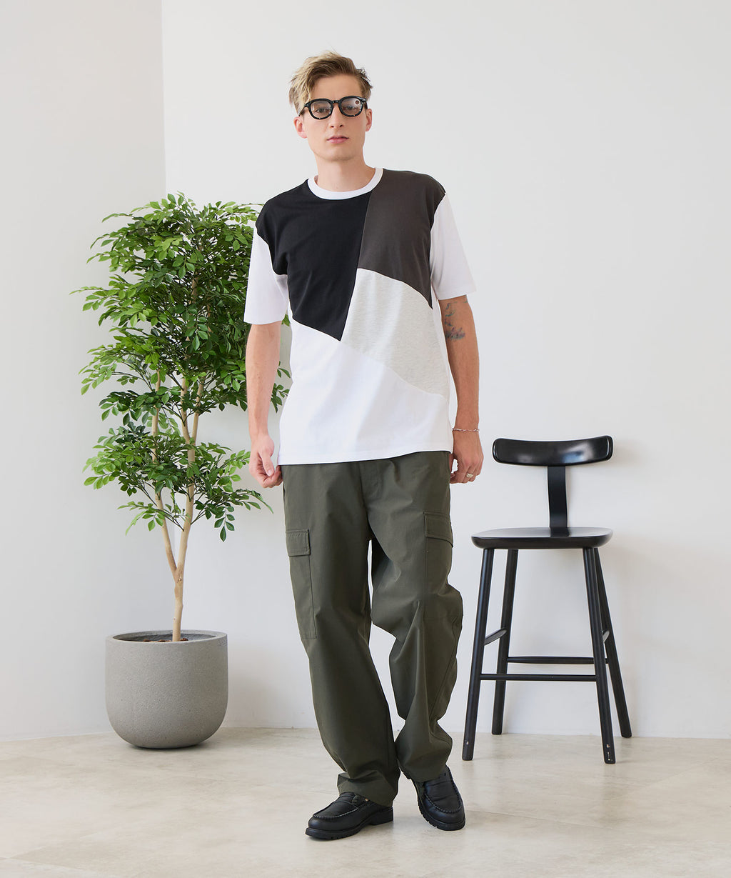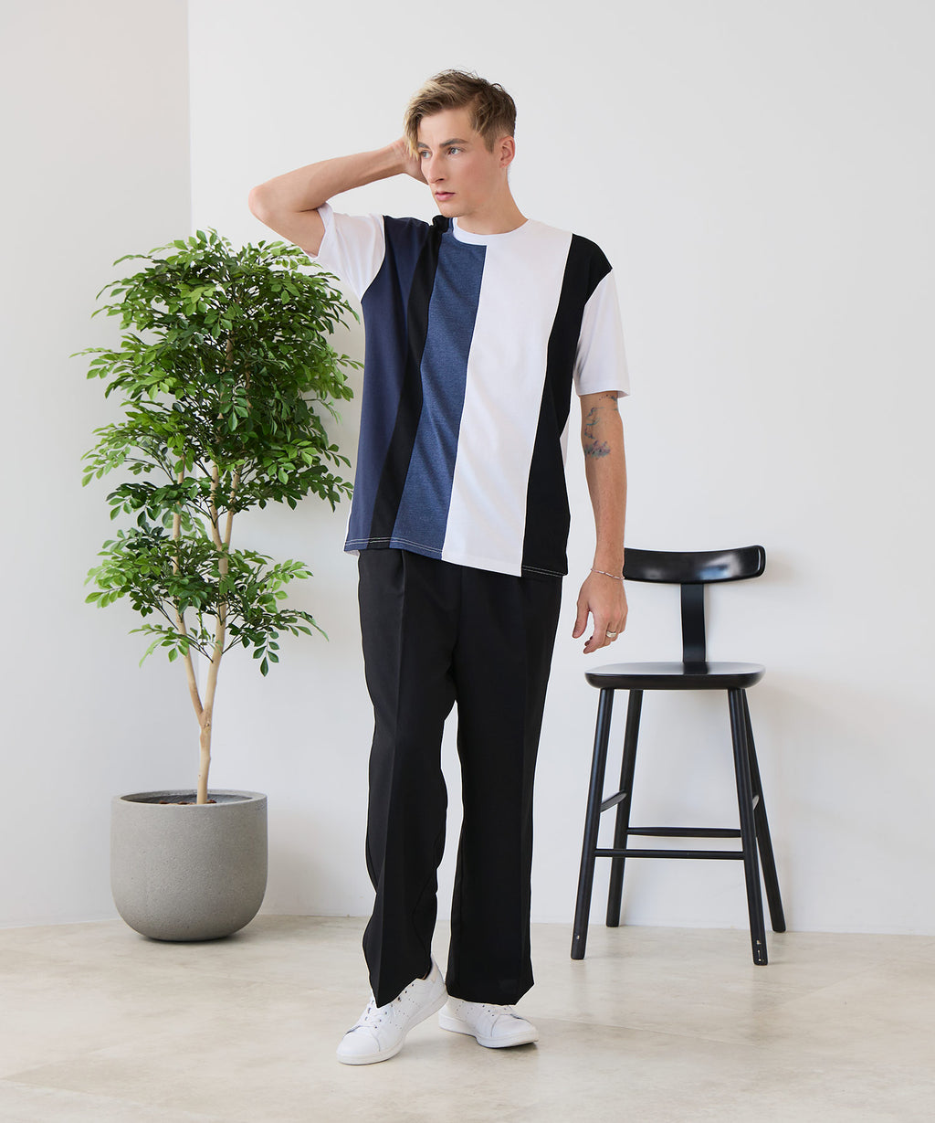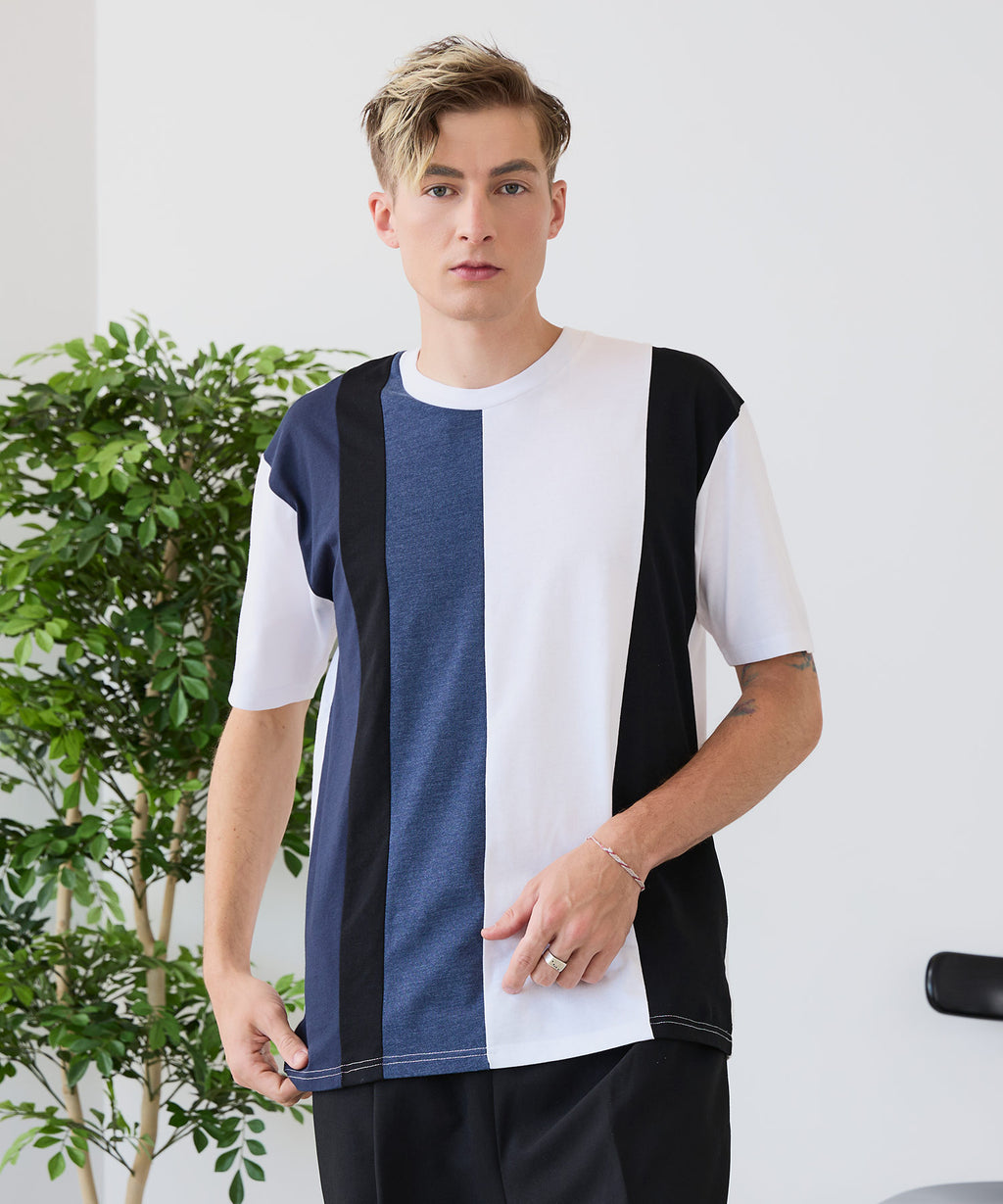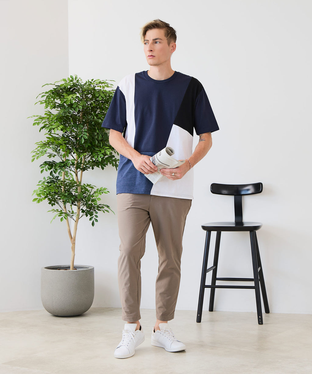 大胆な切り替えデザインが目を惹くデザインTシャツは、1枚でサマになる優れものです。
