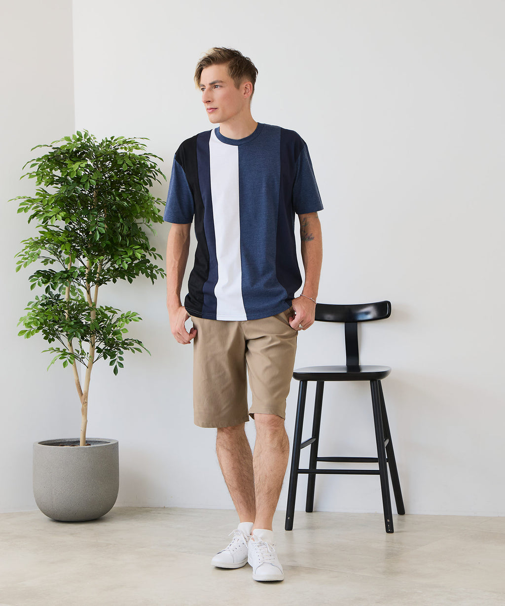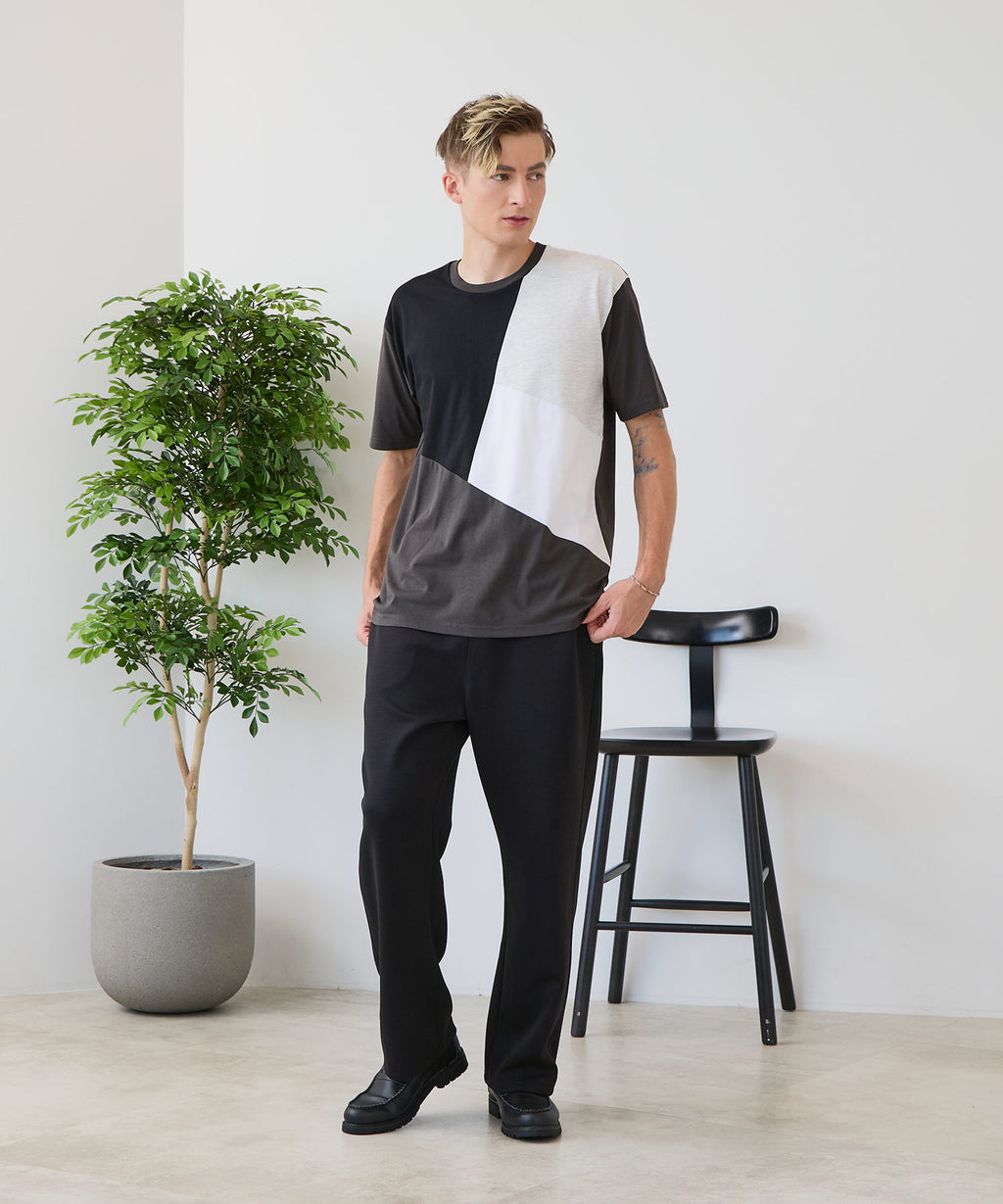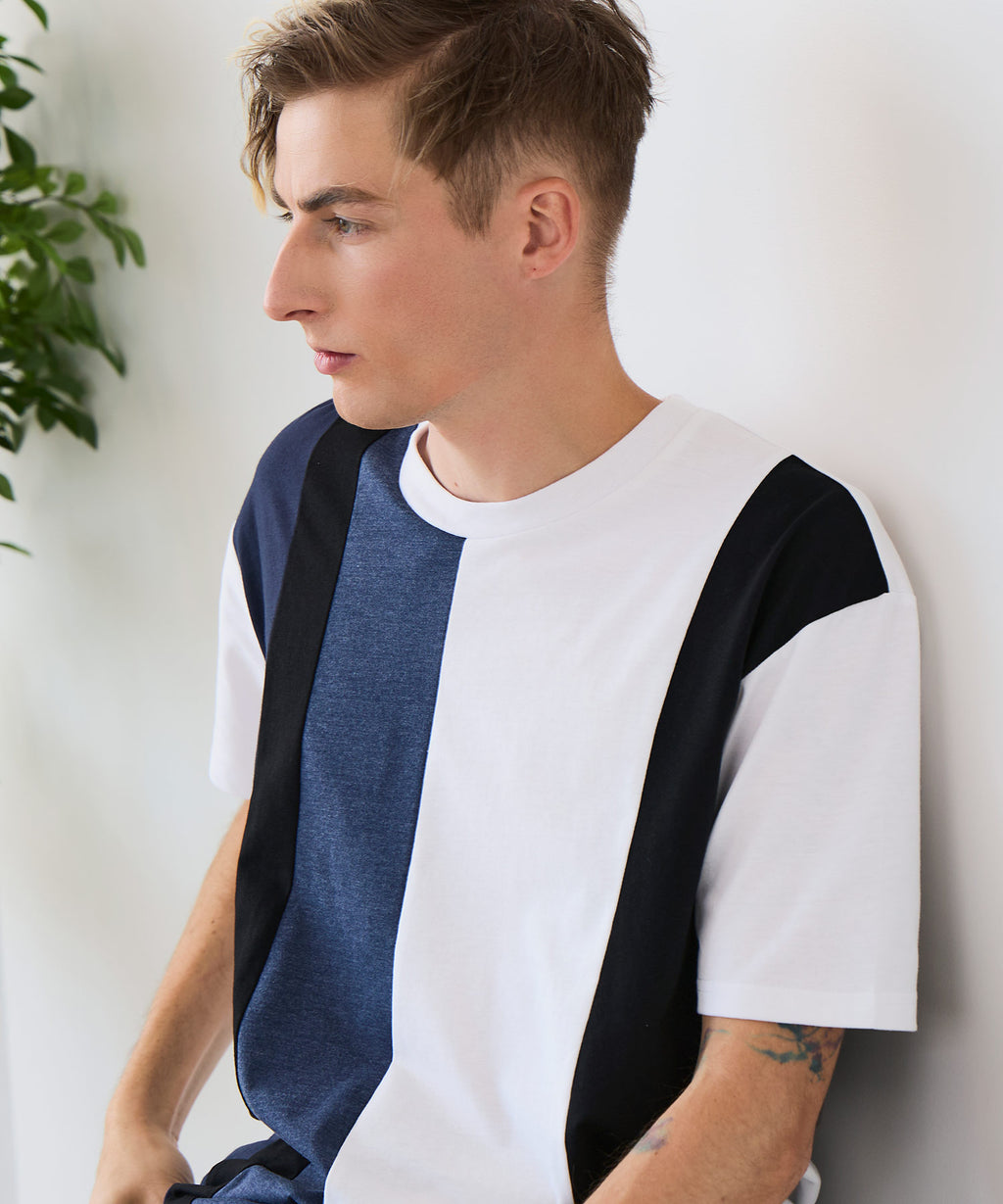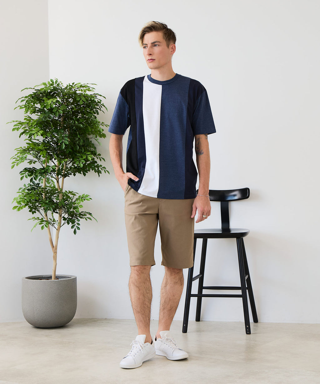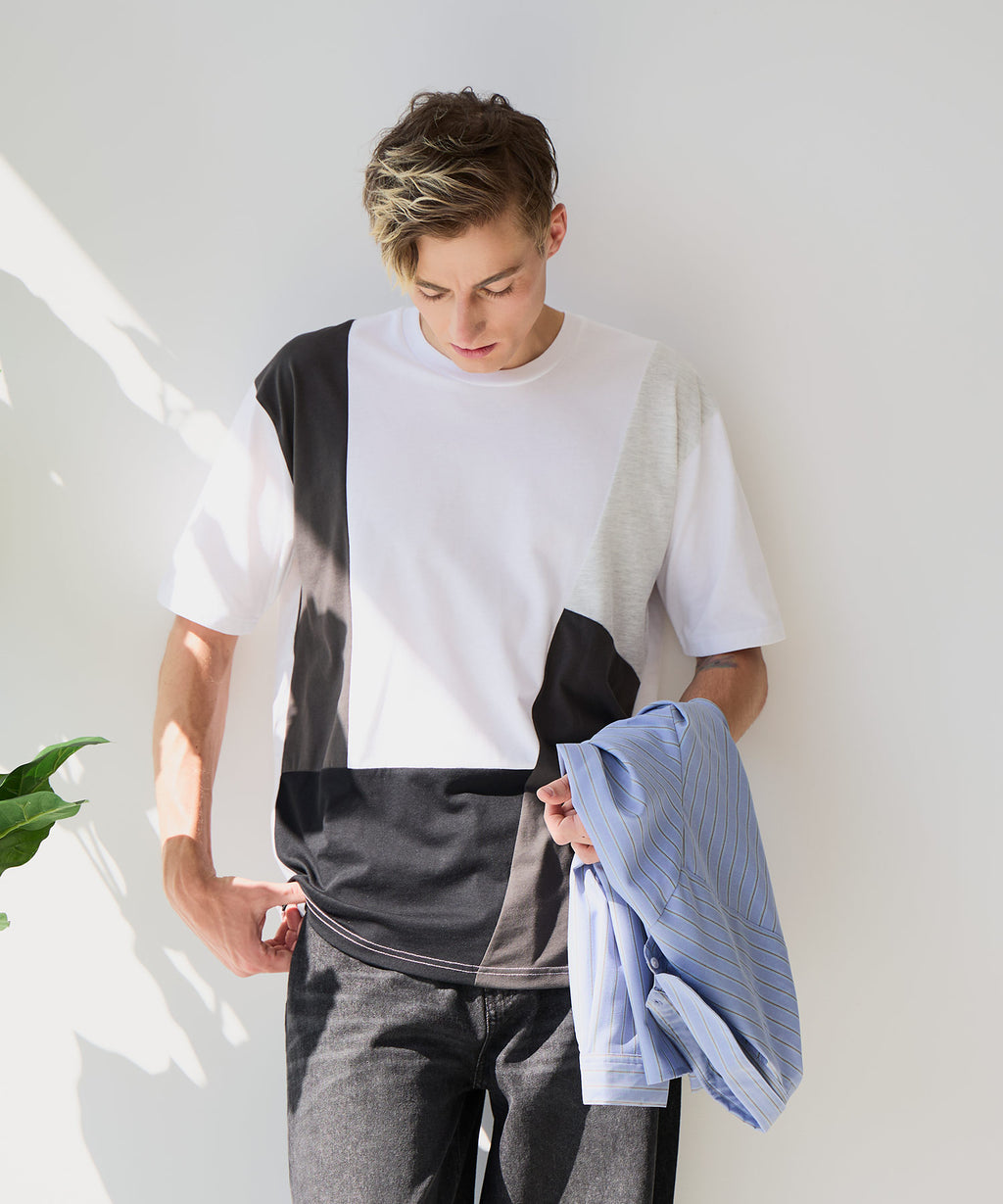 大胆な切り替えデザインが目を惹くデザインTシャツは、1枚でサマになる優れものです。