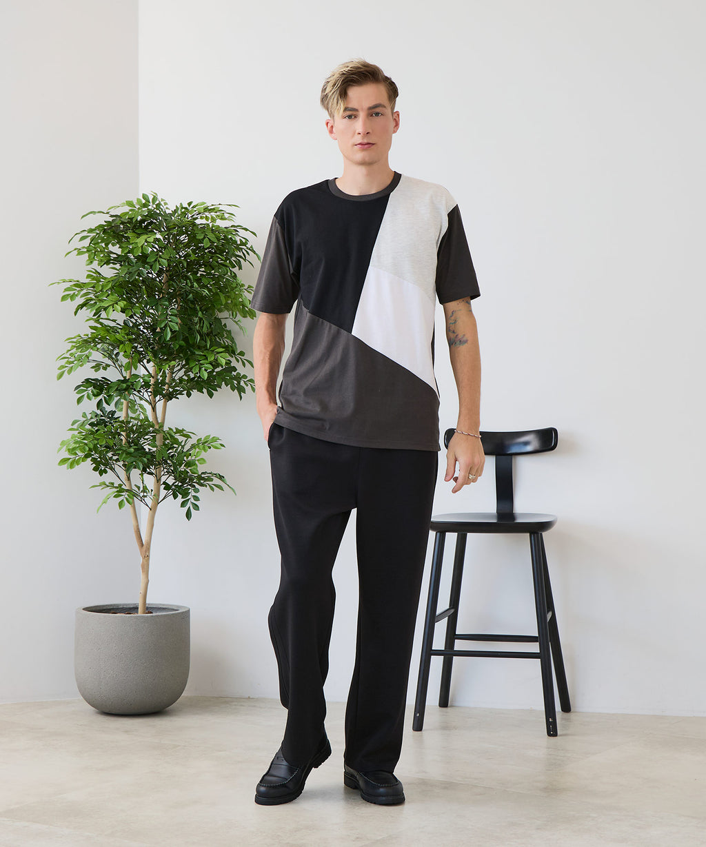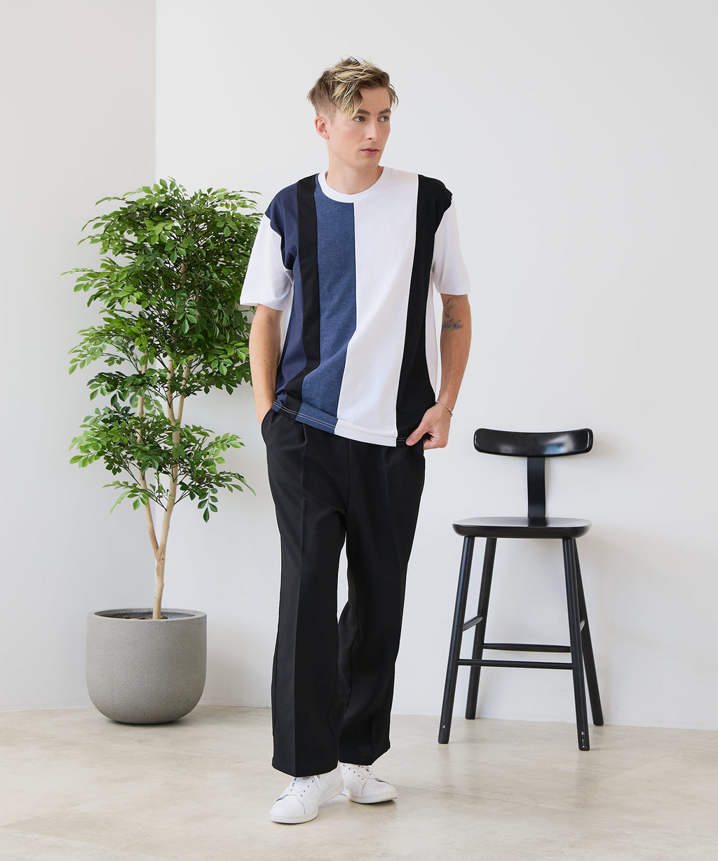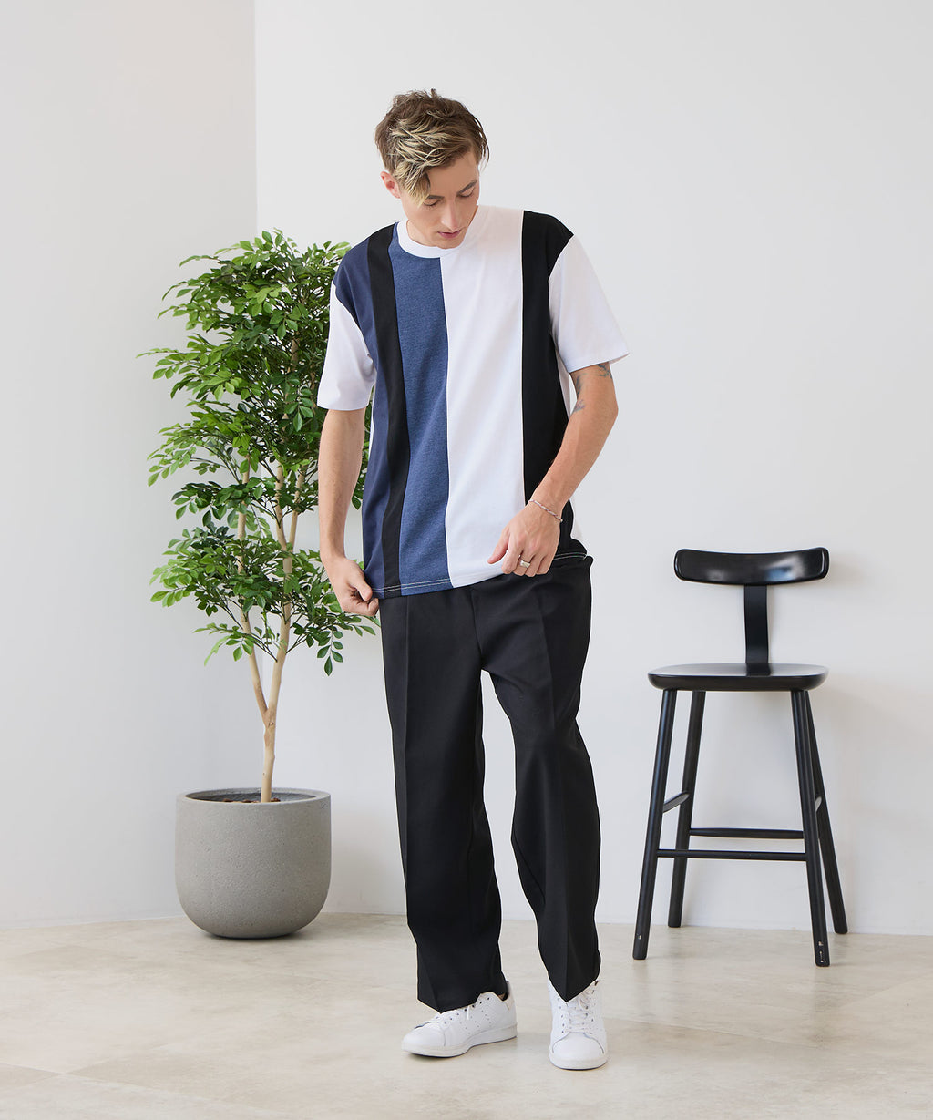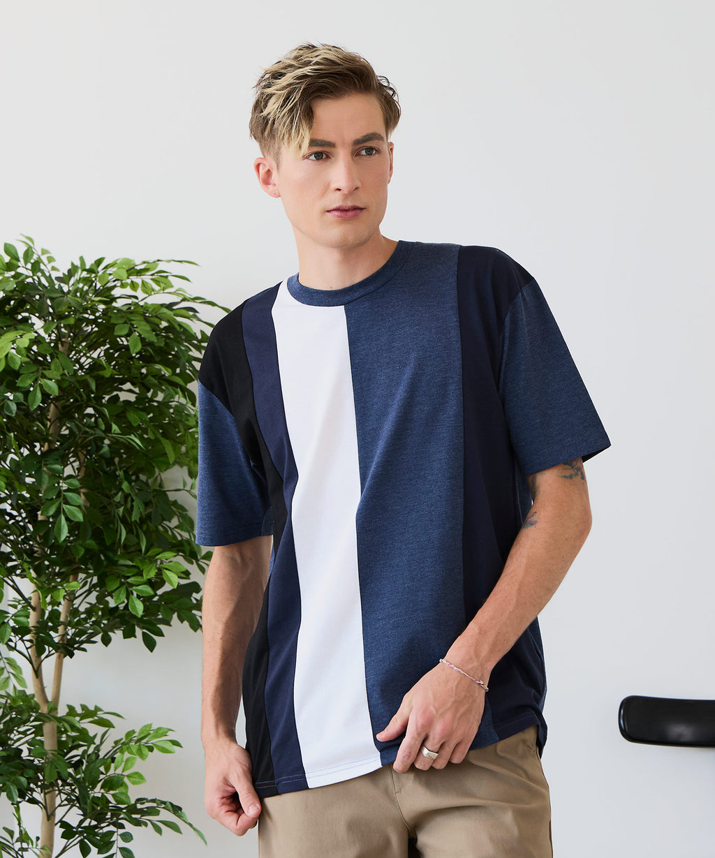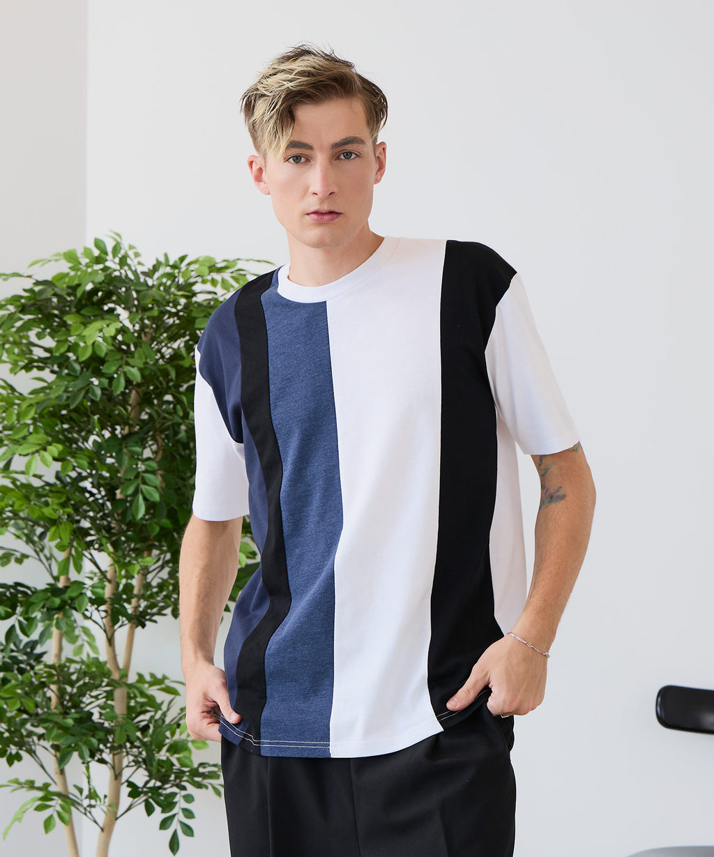 大胆な切り替えデザインが目を惹くデザインTシャツは、1枚でサマになる優れものです。