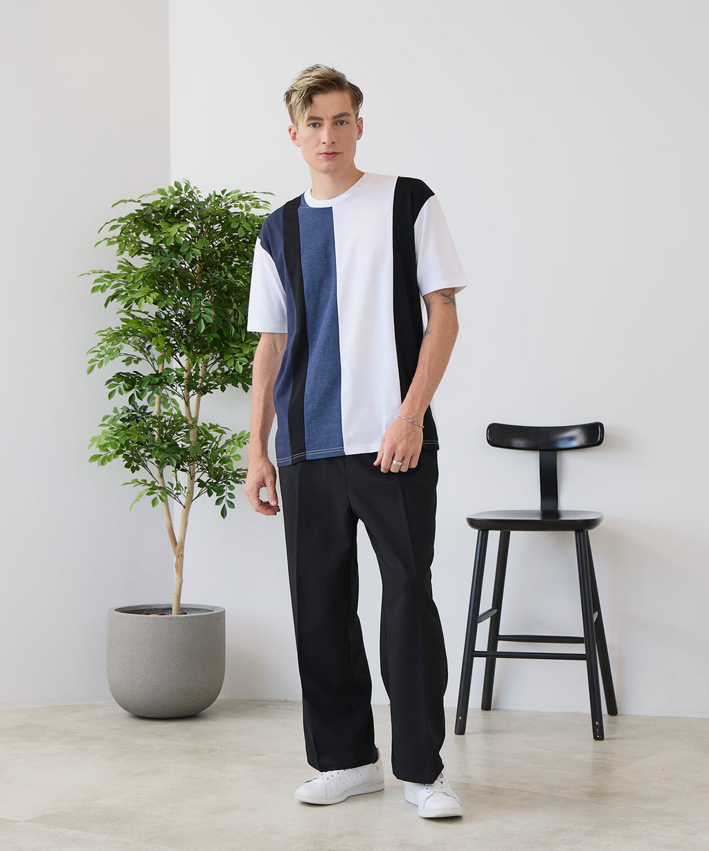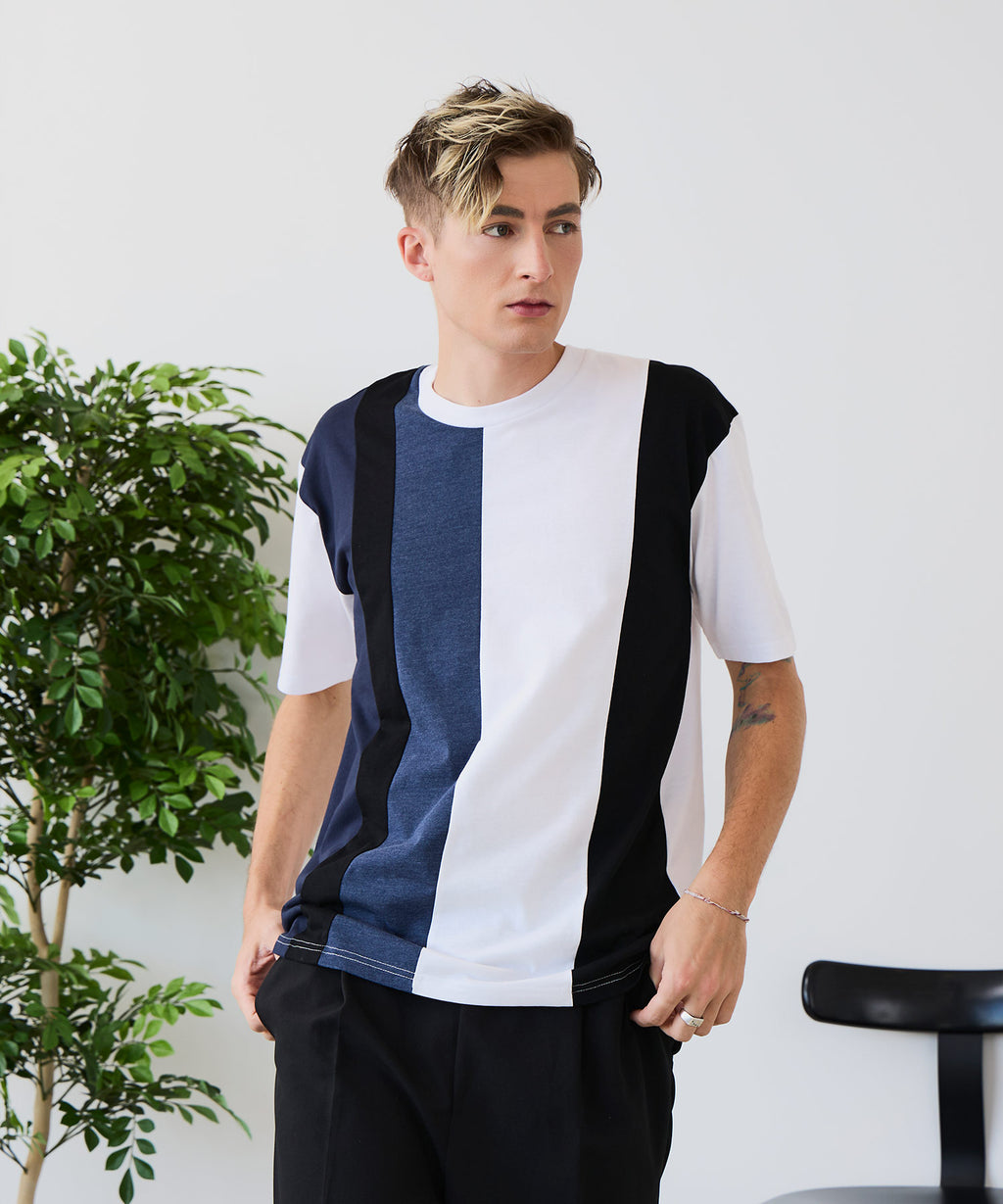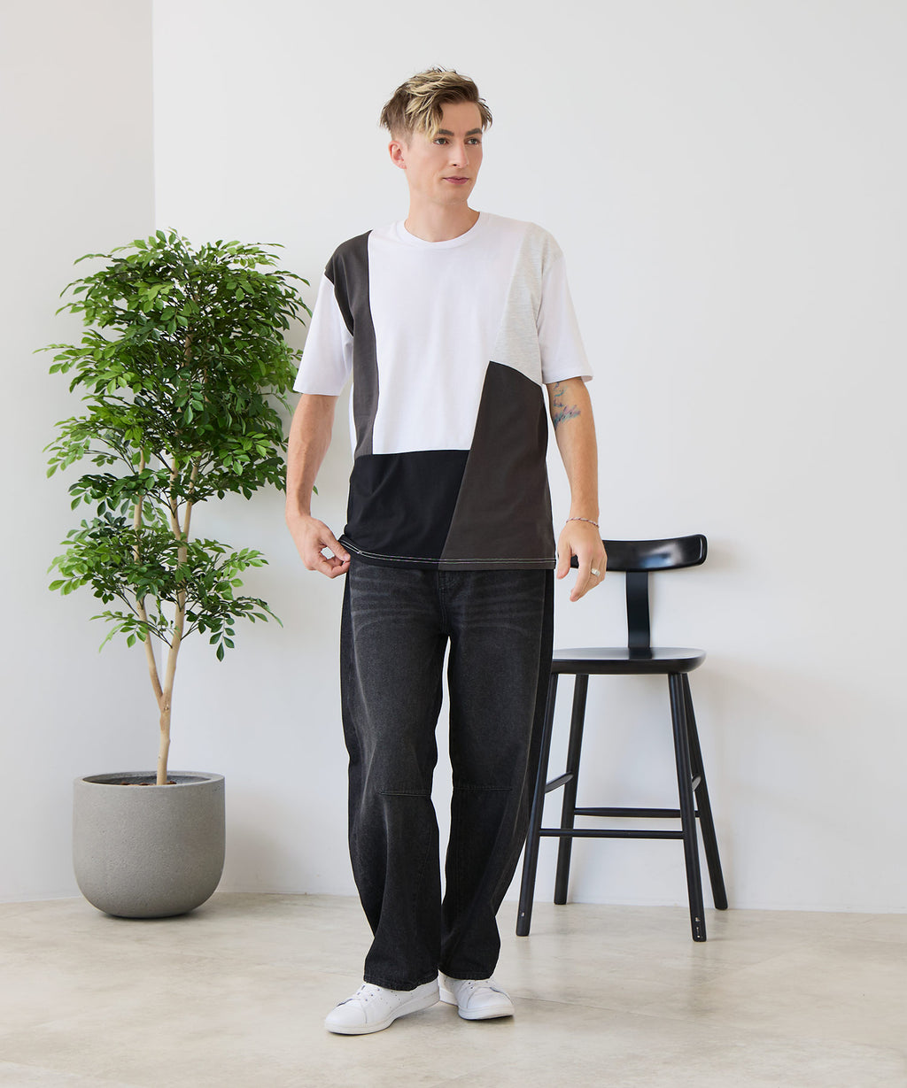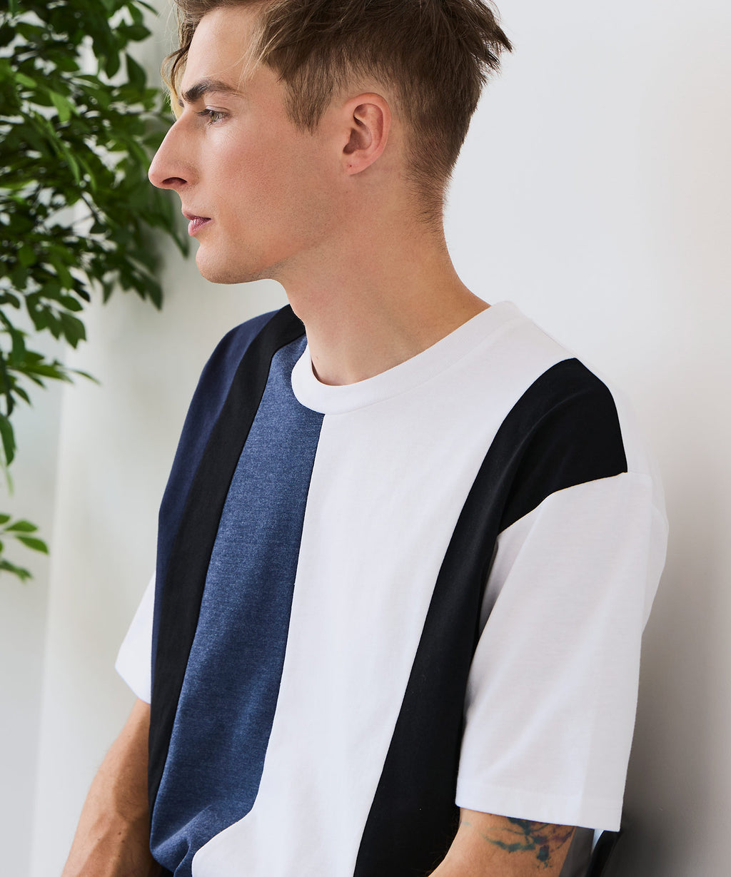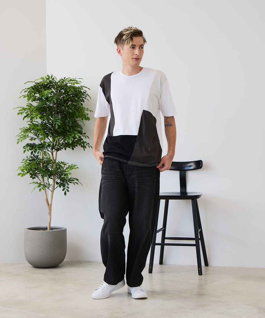 大胆な切り替えデザインが目を惹くデザインTシャツは、1枚でサマになる優れものです。