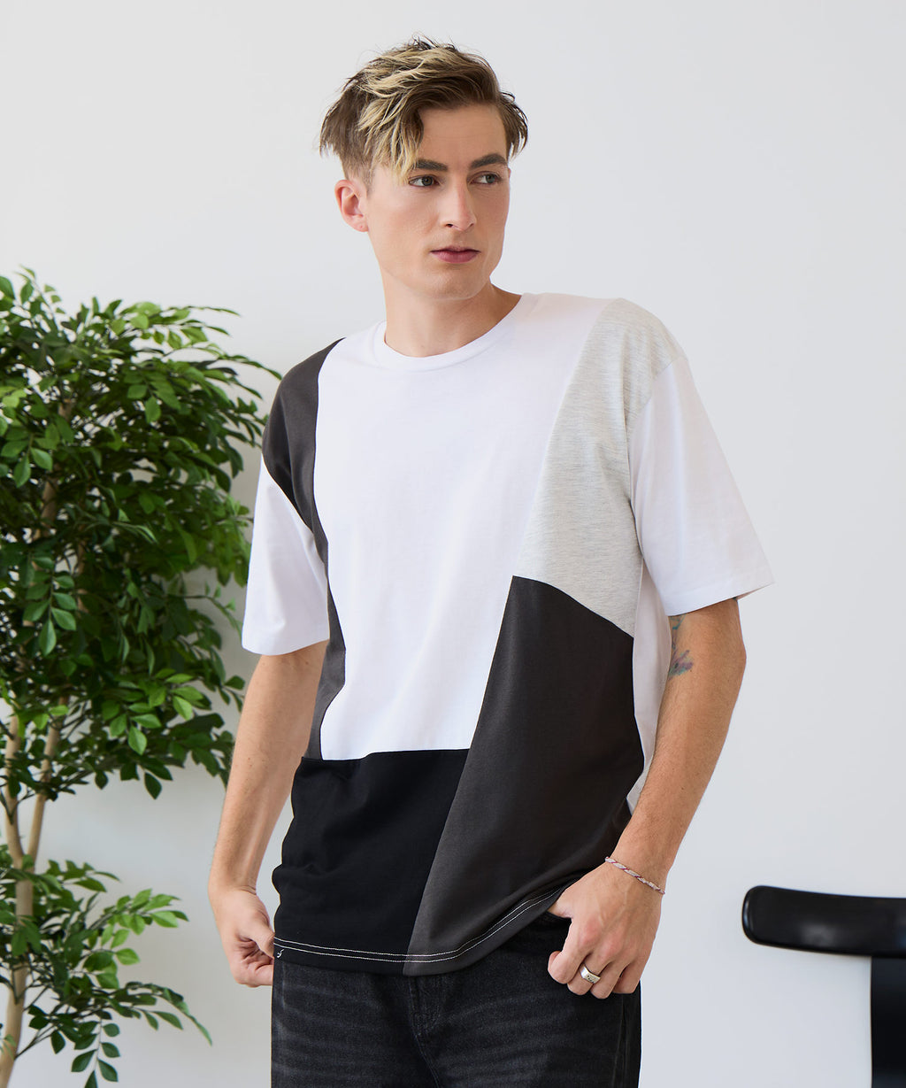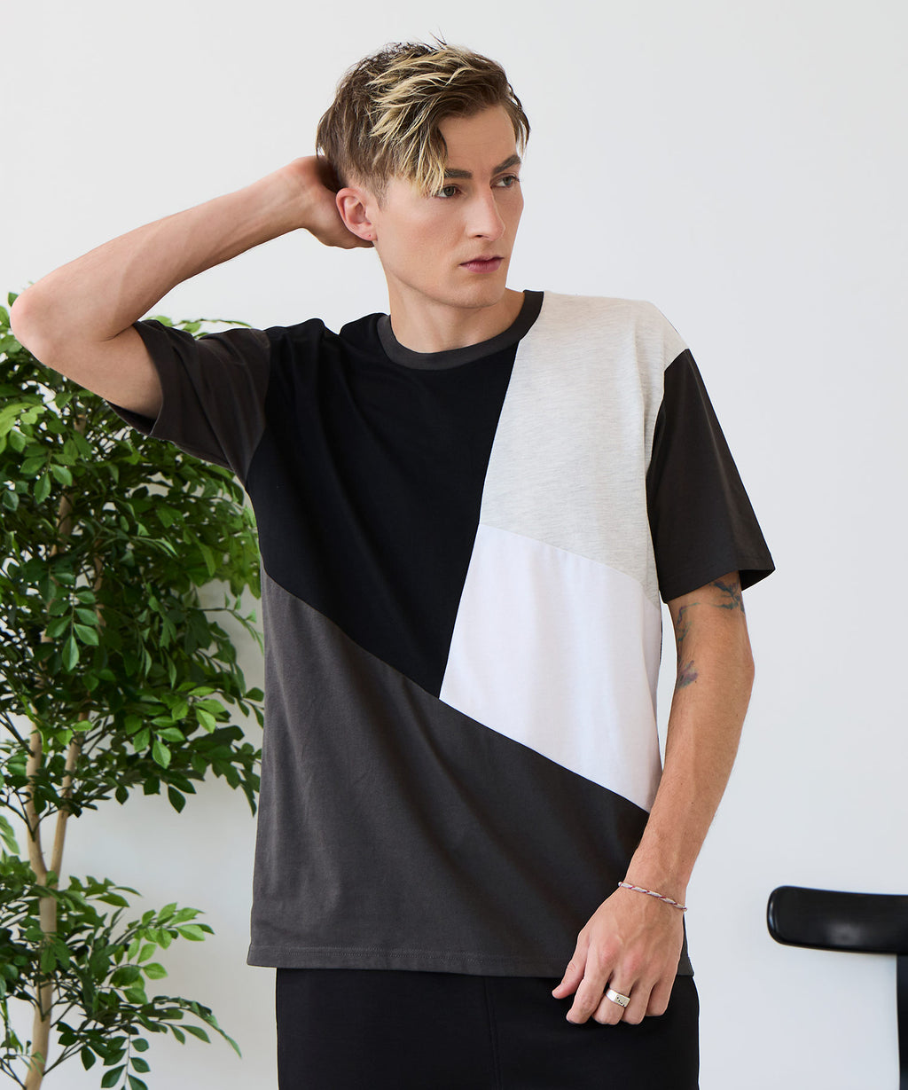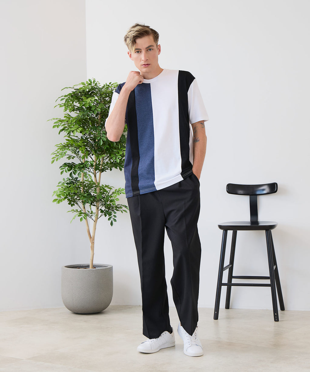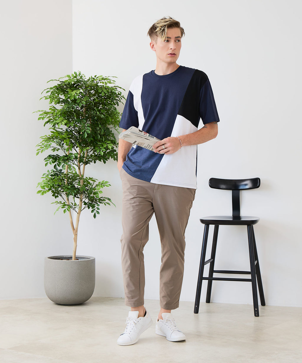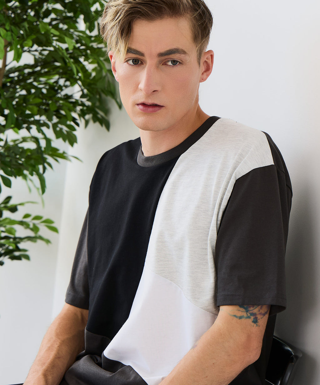 大胆な切り替えデザインが目を惹くデザインTシャツは、1枚でサマになる優れものです。