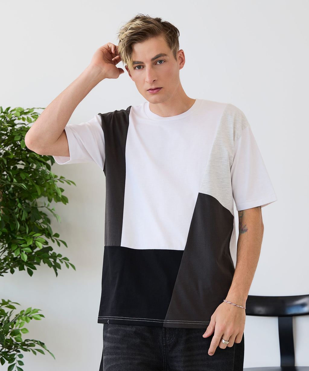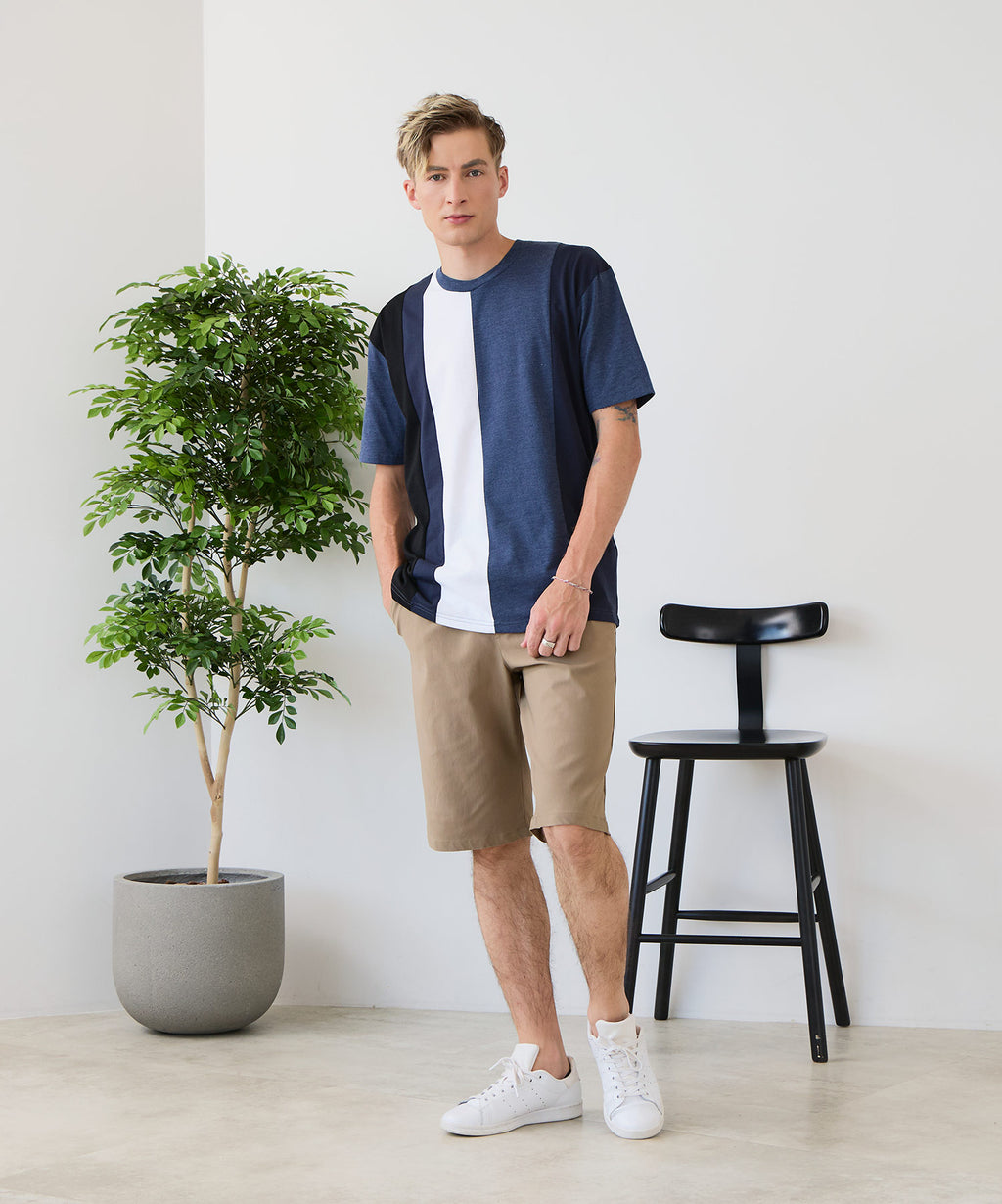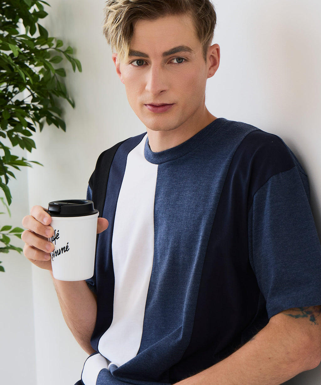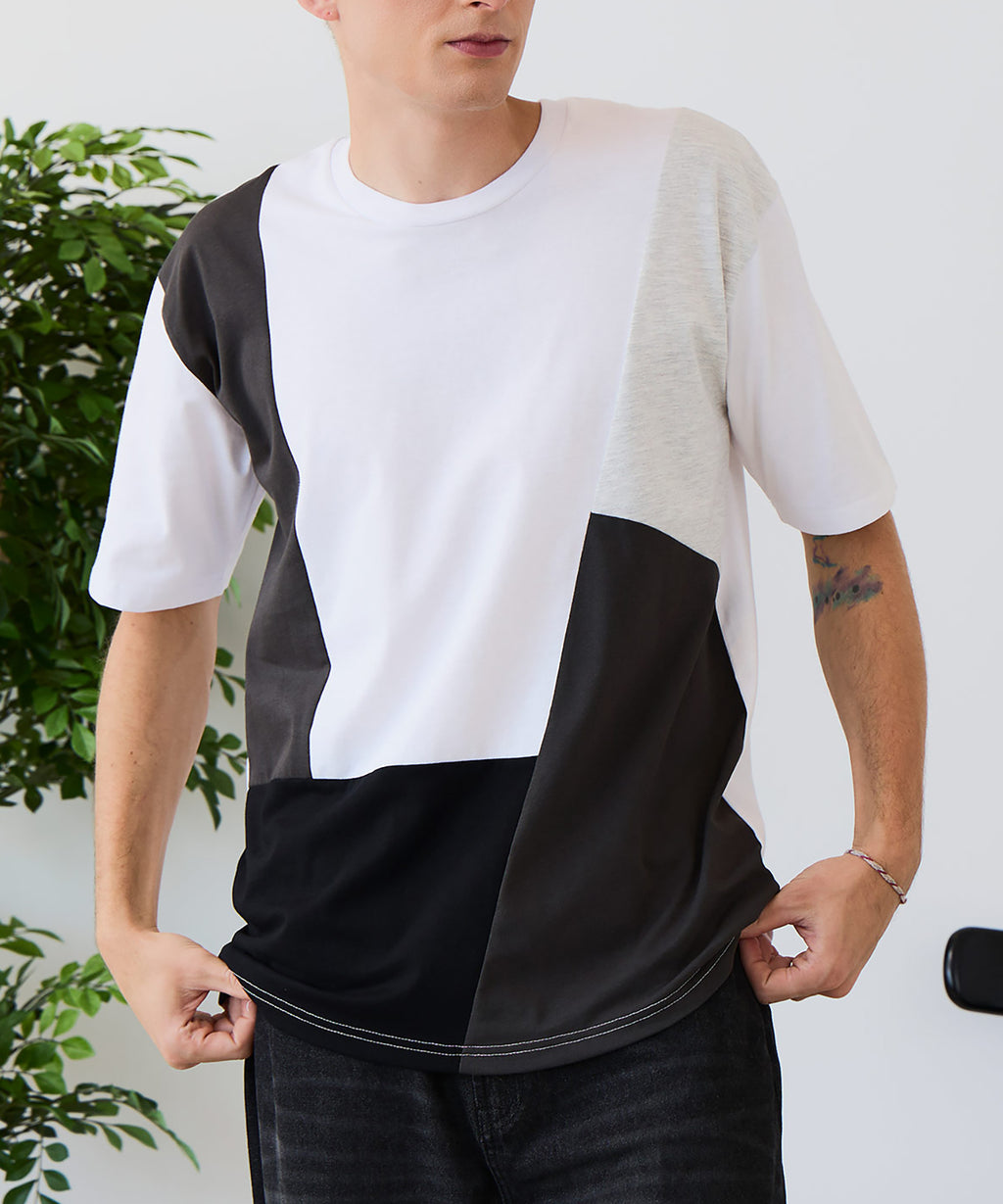 大胆な切り替えデザインが目を惹くデザインTシャツは、1枚でサマになる優れものです。