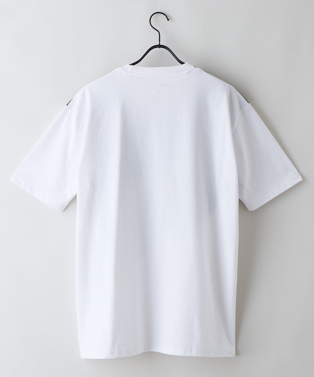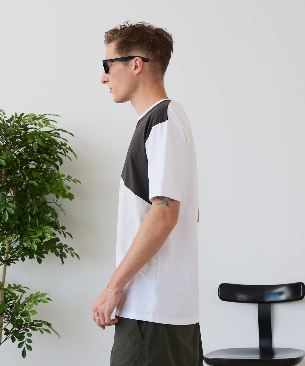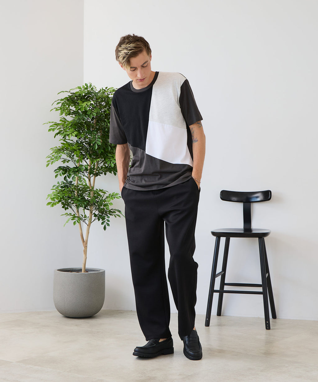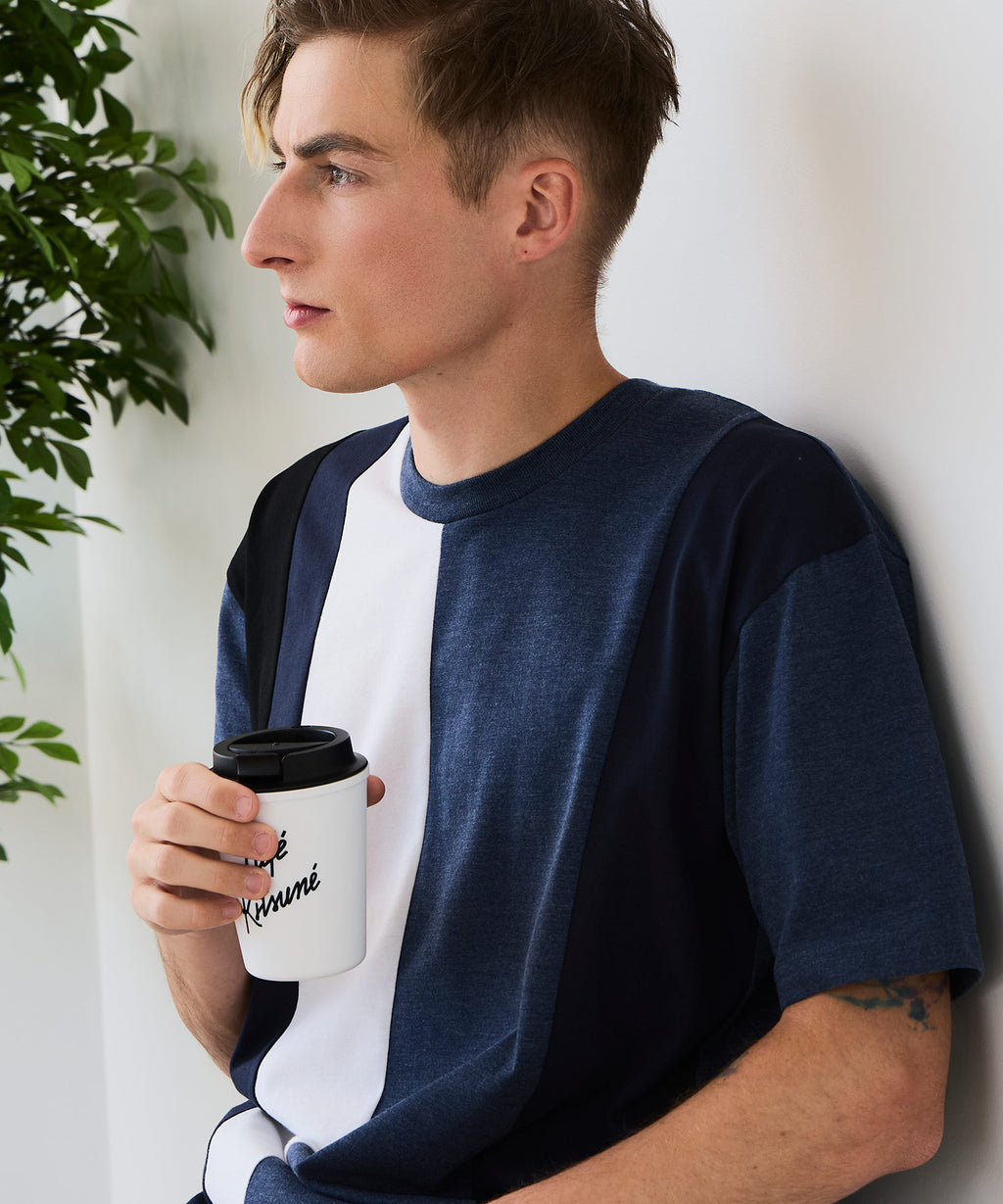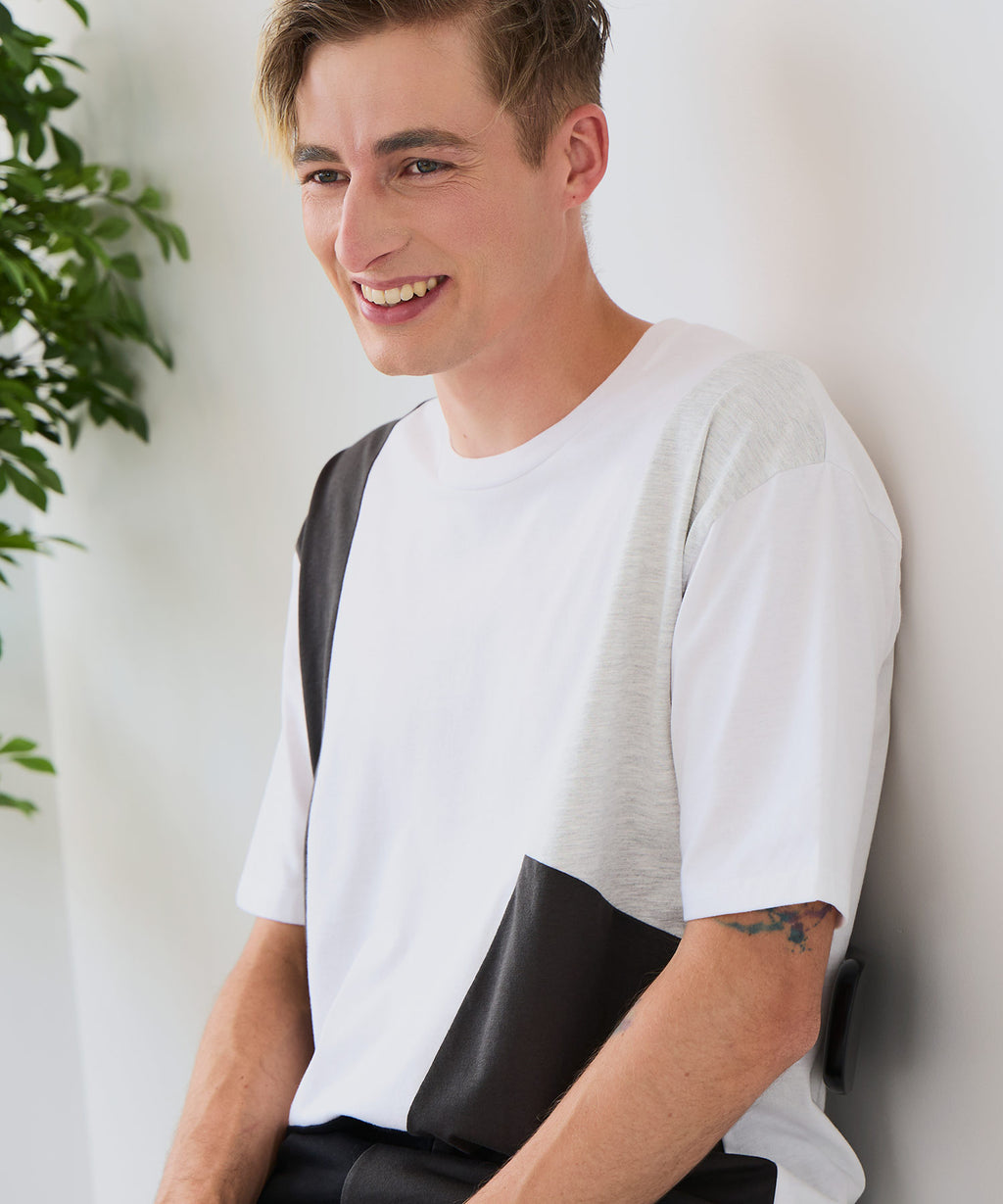 大胆な切り替えデザインが目を惹くデザインTシャツは、1枚でサマになる優れものです。
