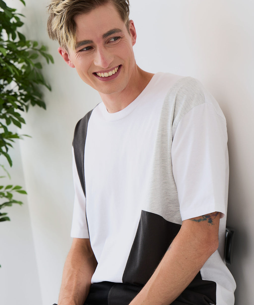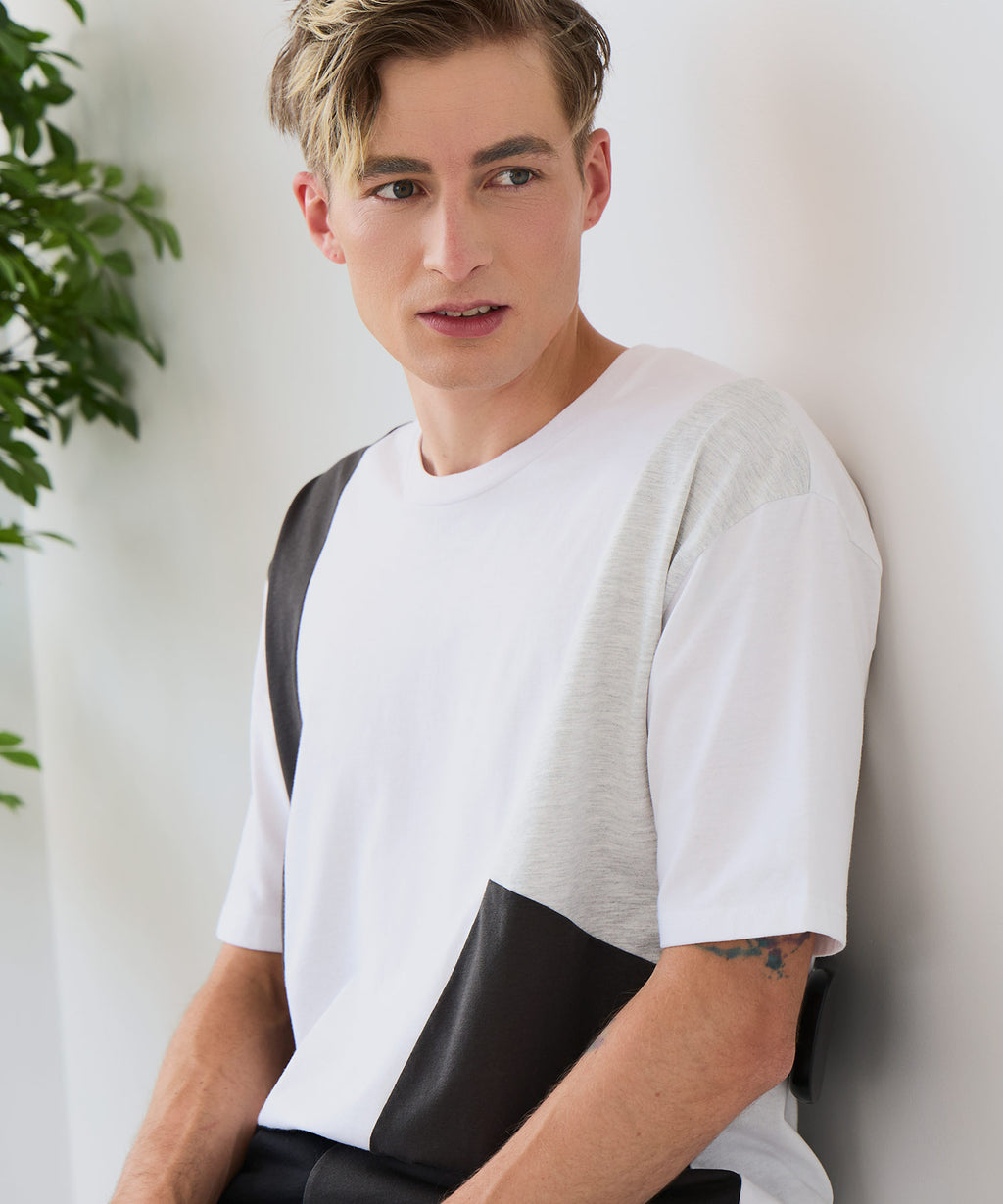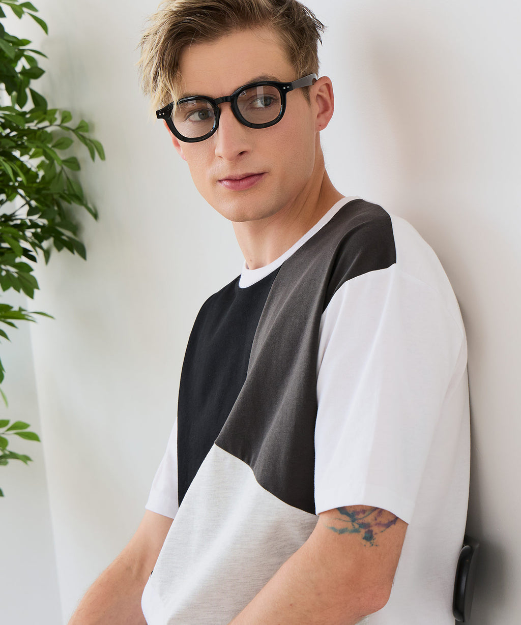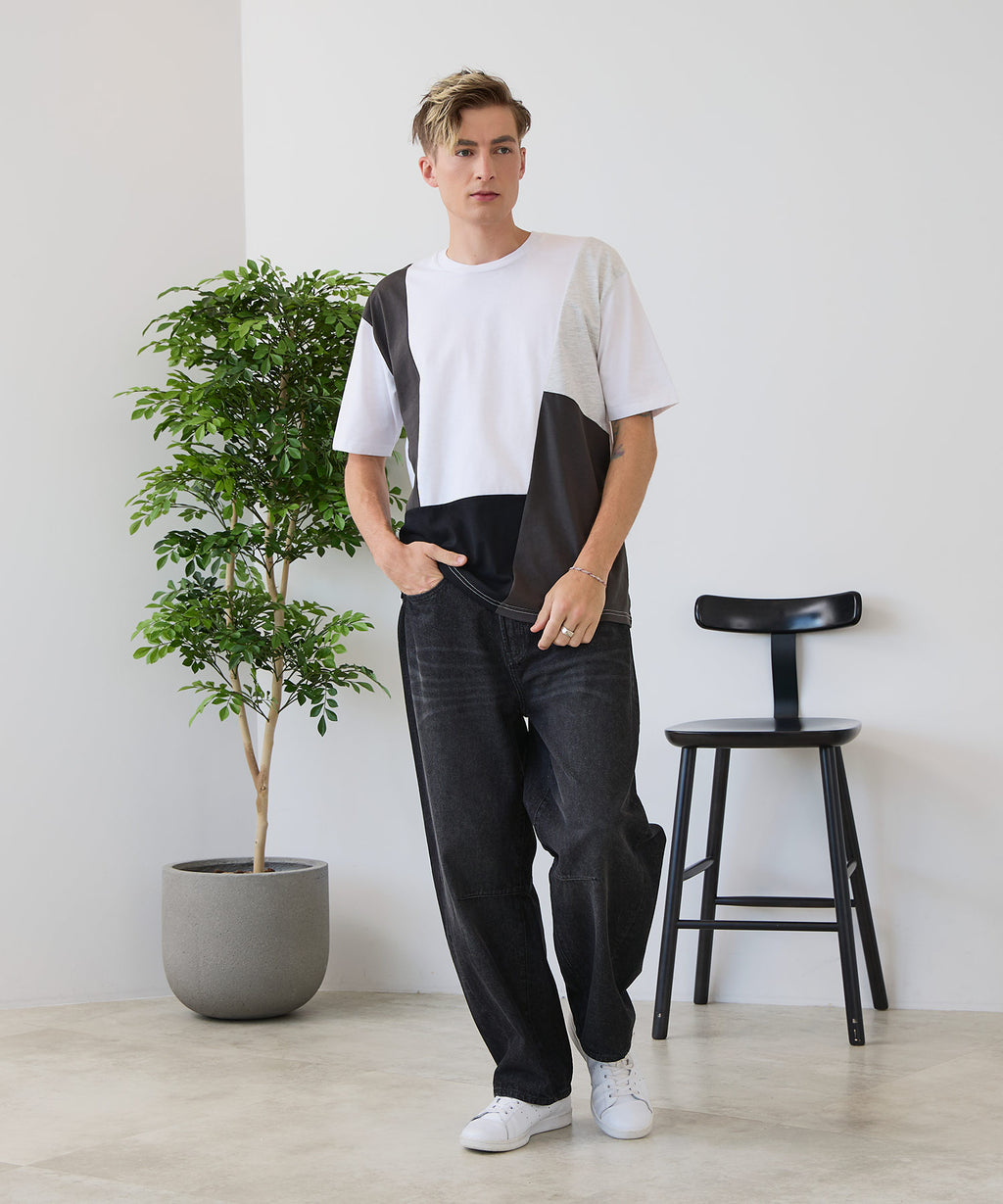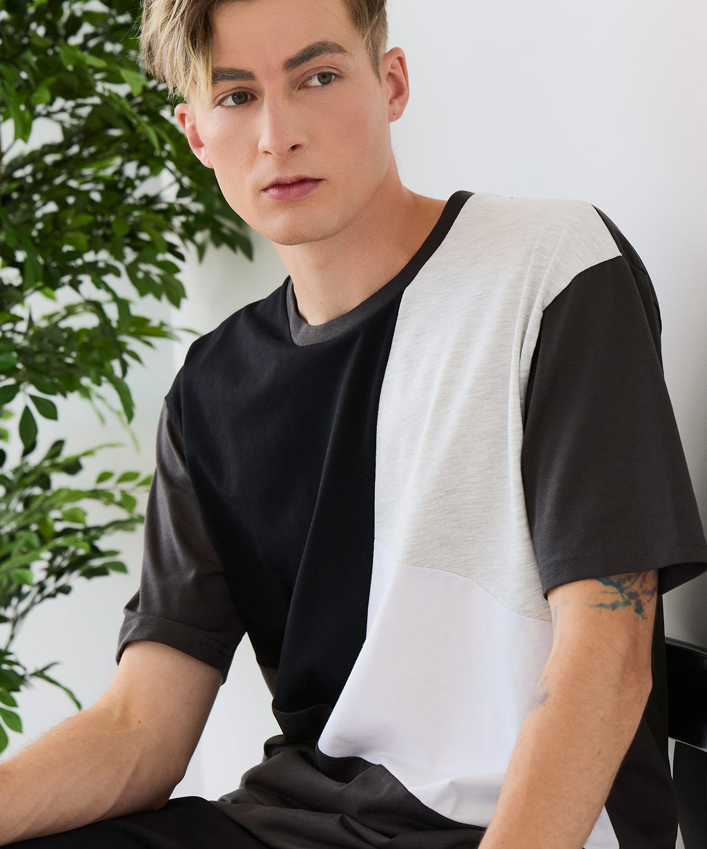 大胆な切り替えデザインが目を惹くデザインTシャツは、1枚でサマになる優れものです。